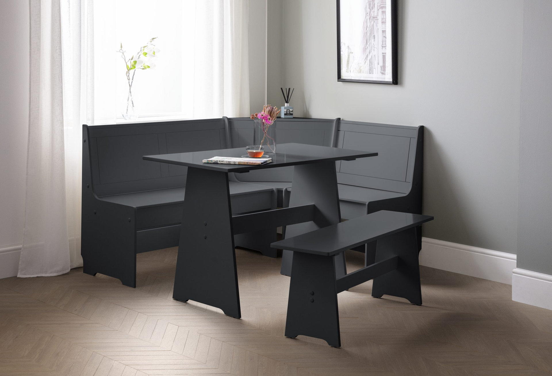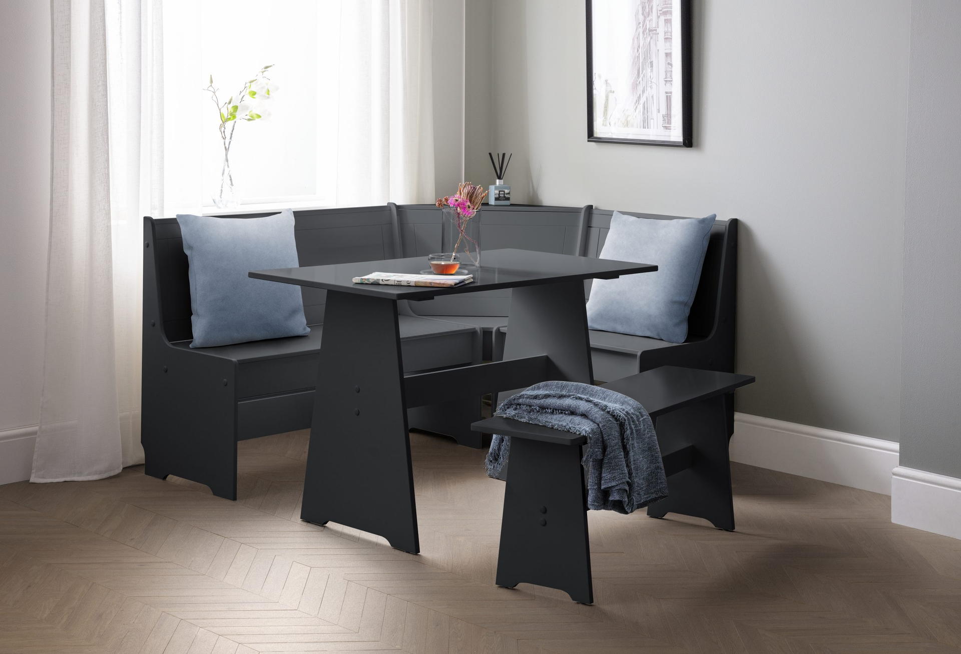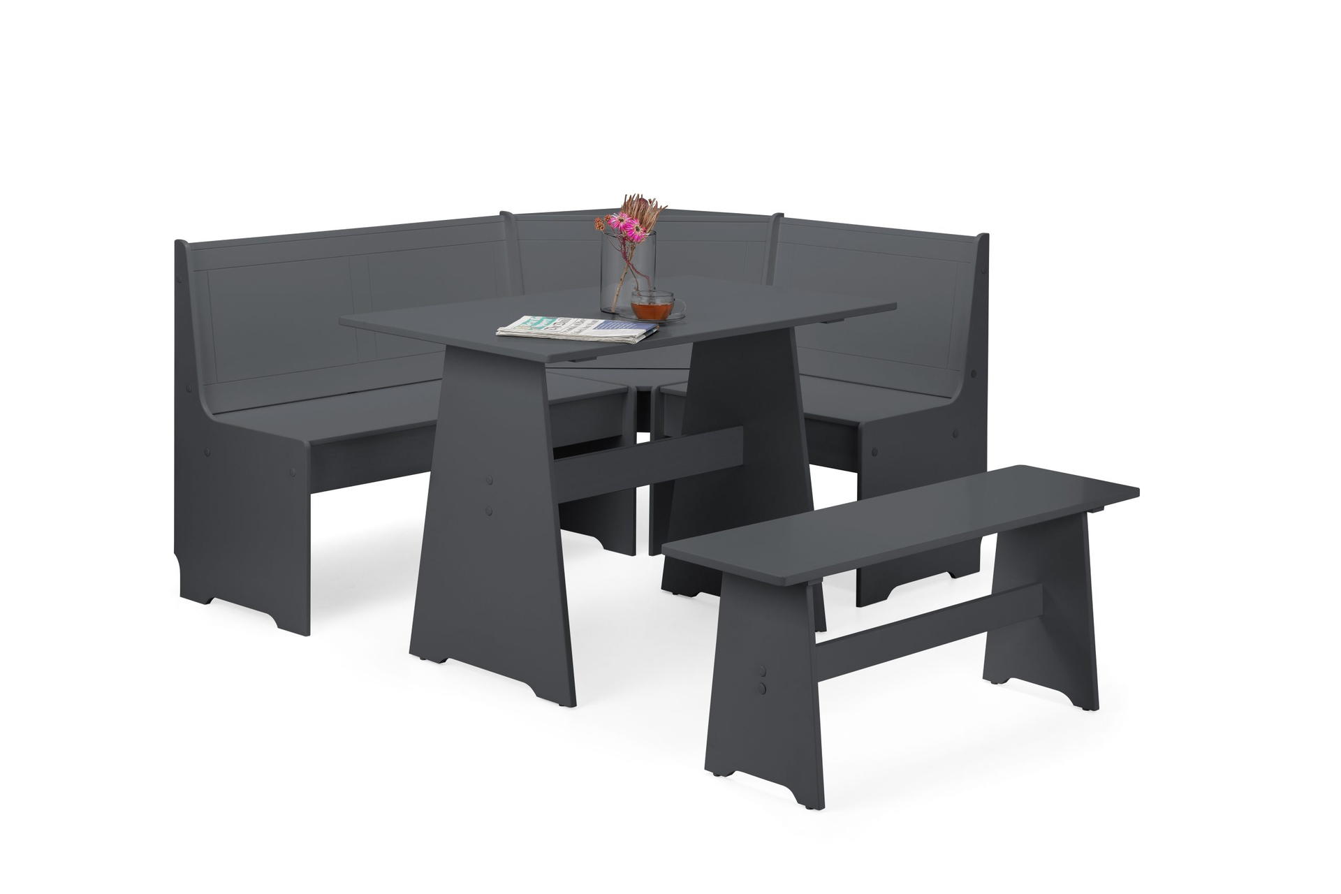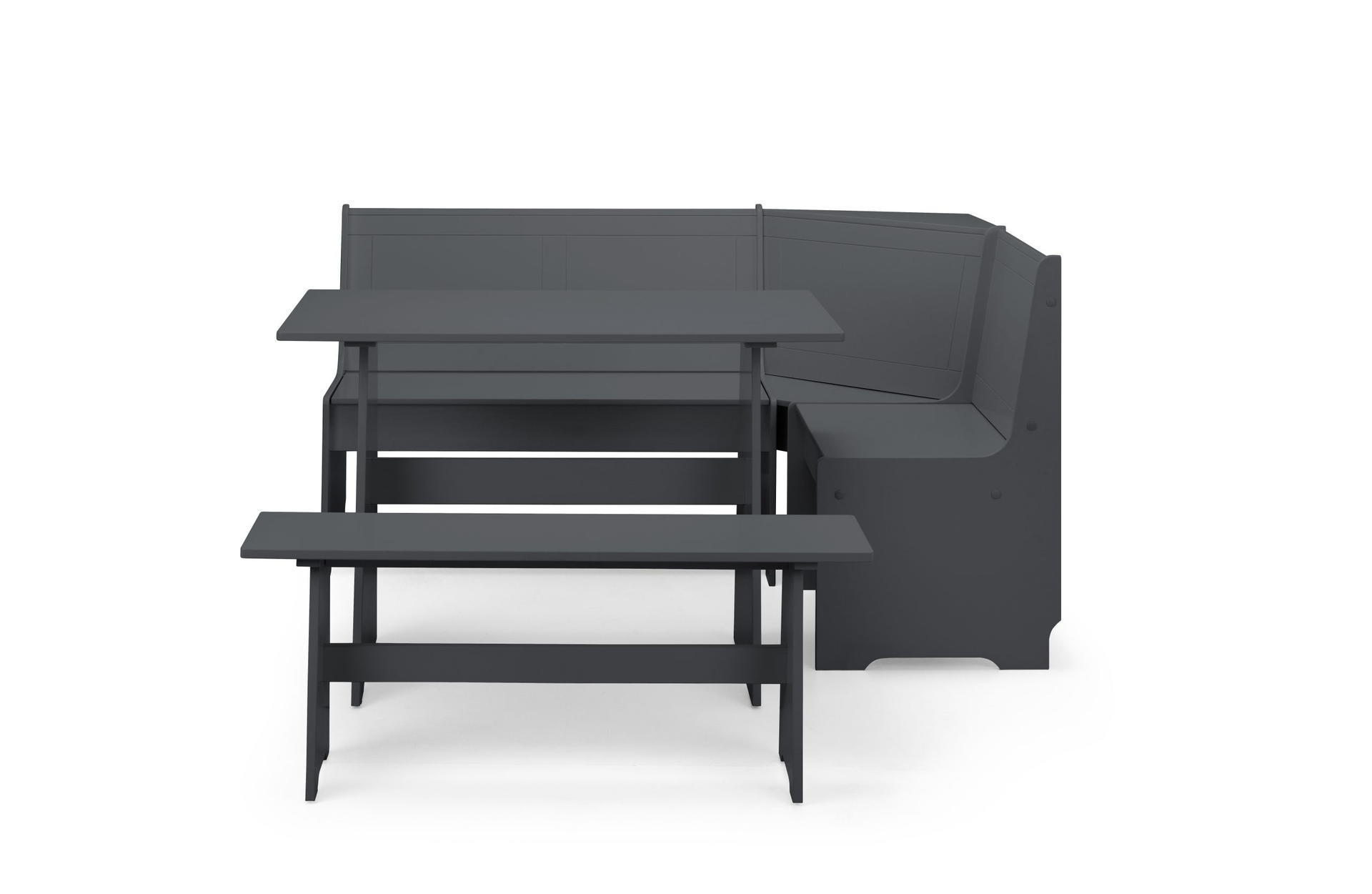 This classic corner design is perfect for any traditional or rustic home. Finished in a fresh Anthracite lacquer, the Newport corner dining set features high seatbacks and a bench with a classic, eye-catching design. This dining set is perfect for any kitchen or dining room with a small area.
