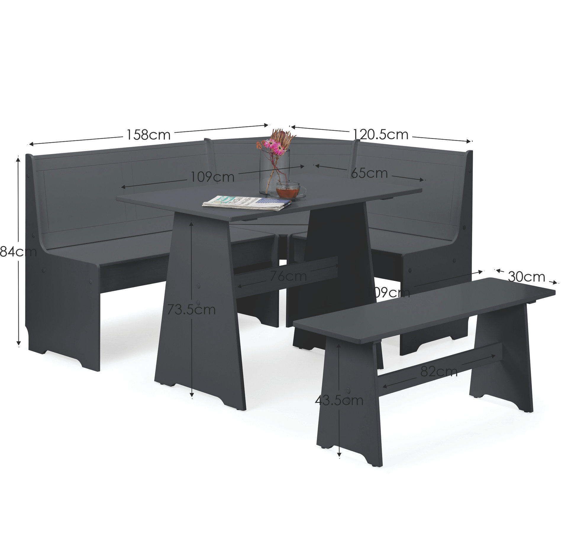 Measurements: H x D x W Corner Nook – 85.4 x 120.4 x 158 Table – 73.7 x 65 x 109 Bench – 43.7 x 30 x 109.
