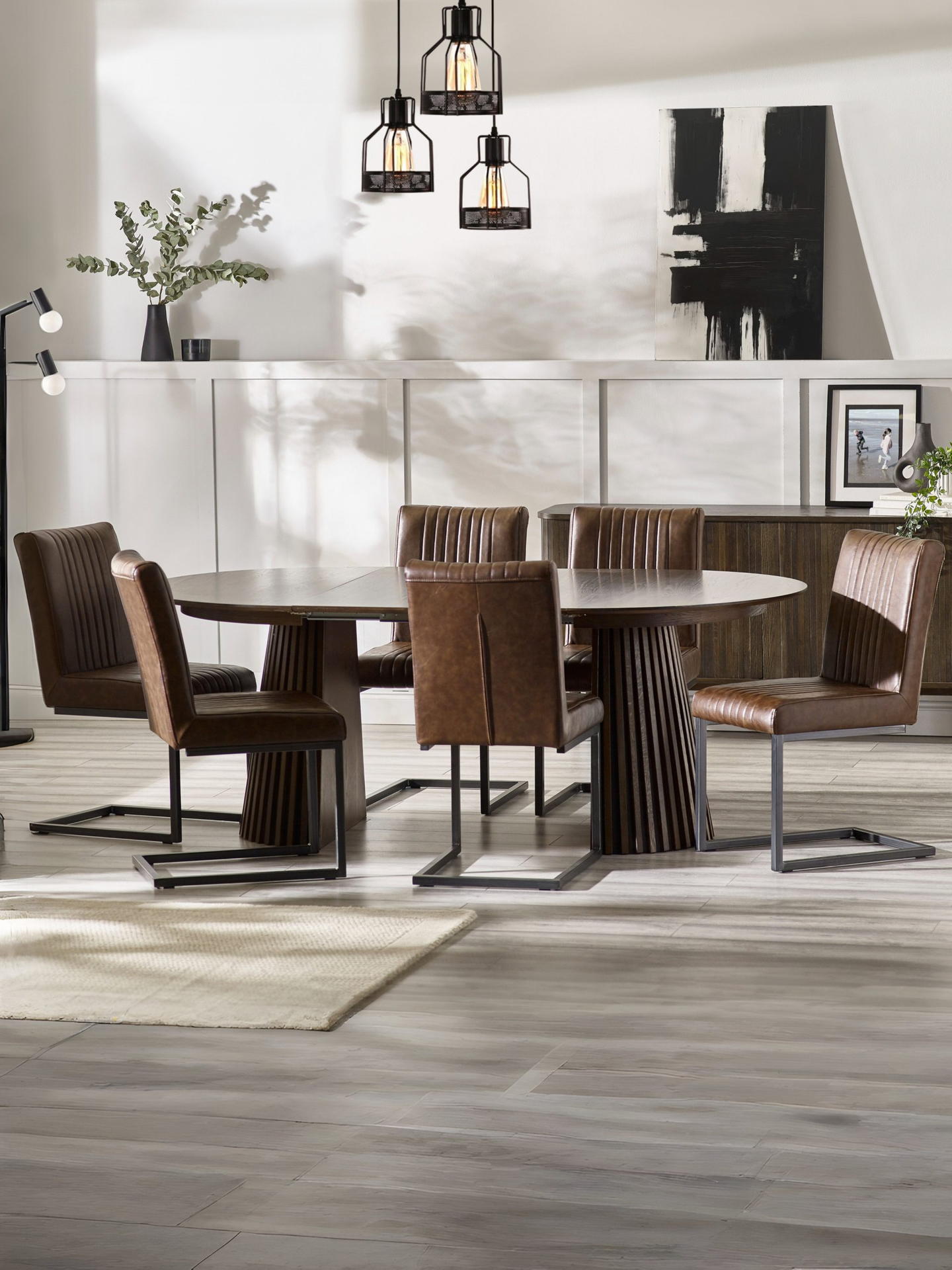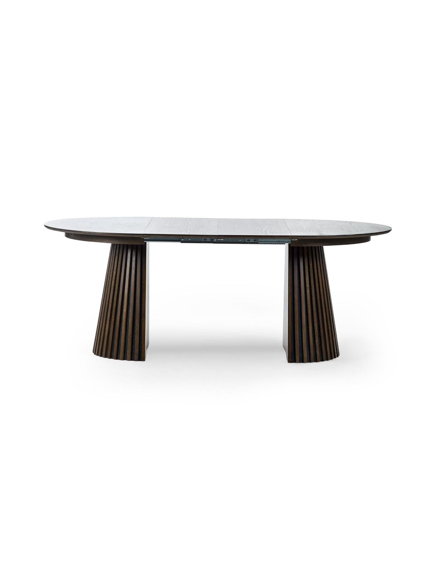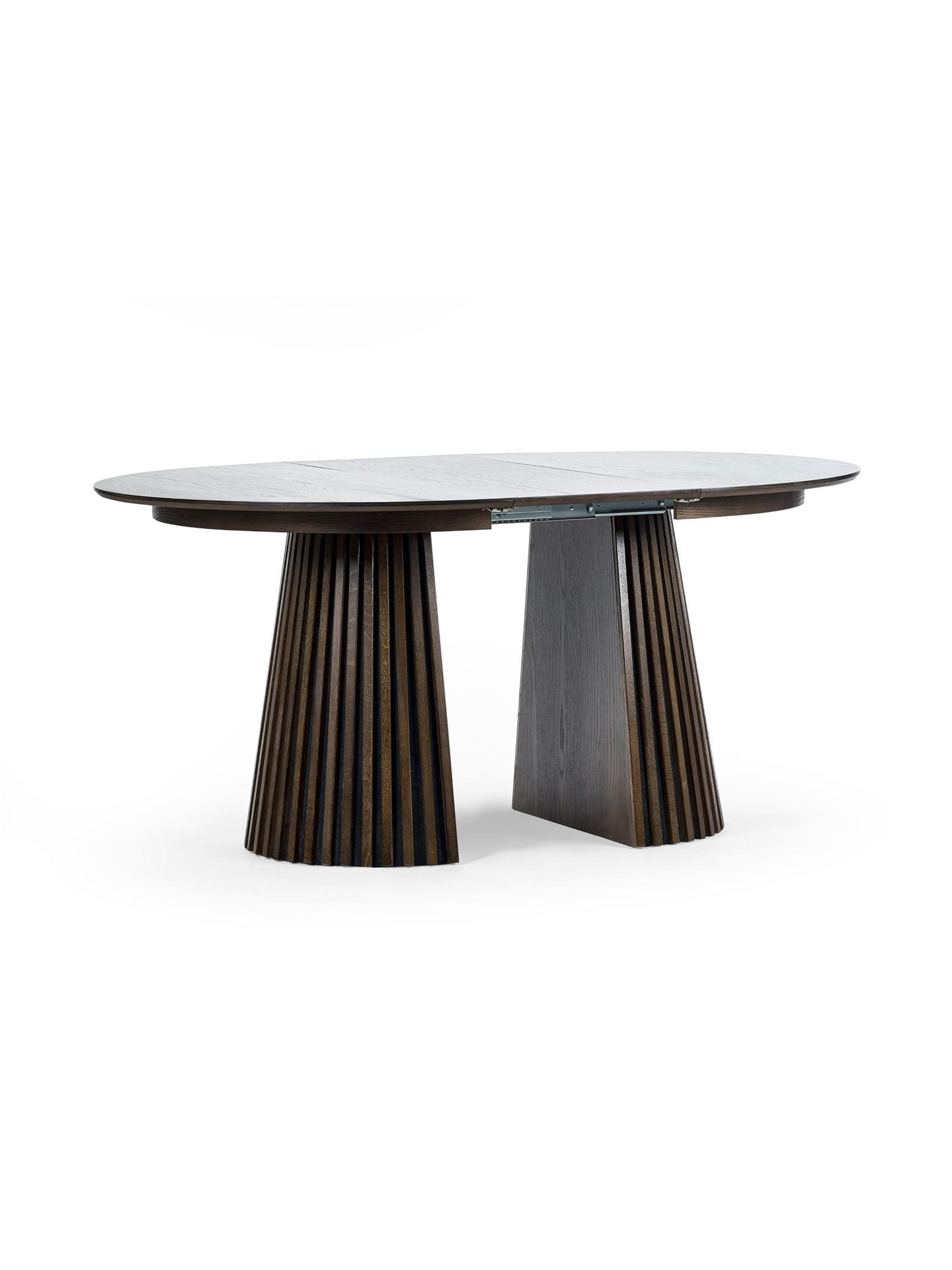 Discover the ultimate dining experience with the Arya Extending Dining Table – a masterpiece of modern design infused with Japandi elegance. Crafted from rich dark oak MDF veneer, it transforms effortlessly from a striking circular shape with a ribbed, coned base to an elongated oval with dual supports, combining sophistication and functionality. Its sleek, adaptable design serves as an elegant focal point, effortlessly adjusting to suit both intimate dinners and larger gatherings. Adding a refined touch to any dining space with its blend of minimalist beauty and luxurious detail.