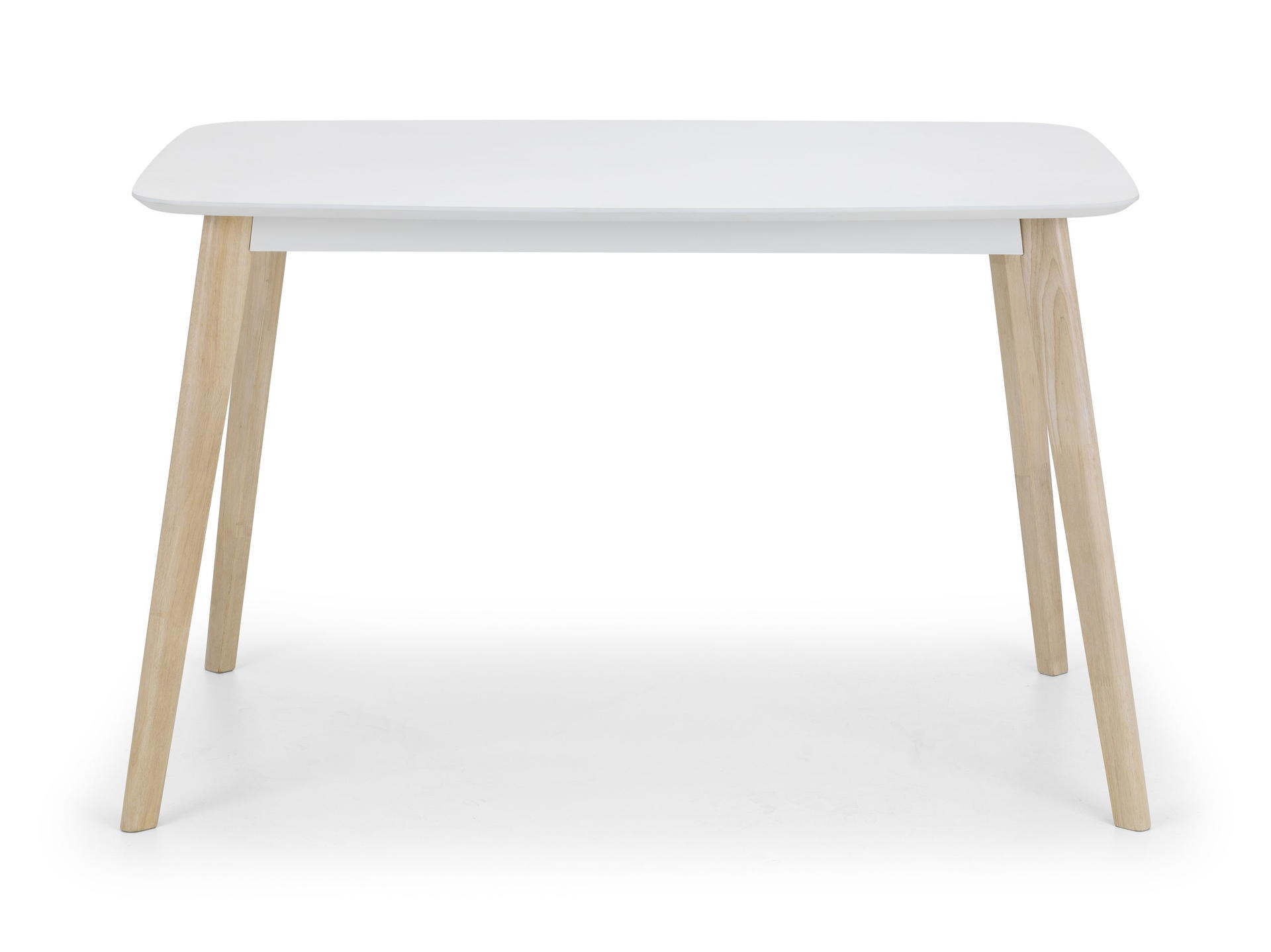 Durable matt white lacquered top with limed oak effect solid wood legs..