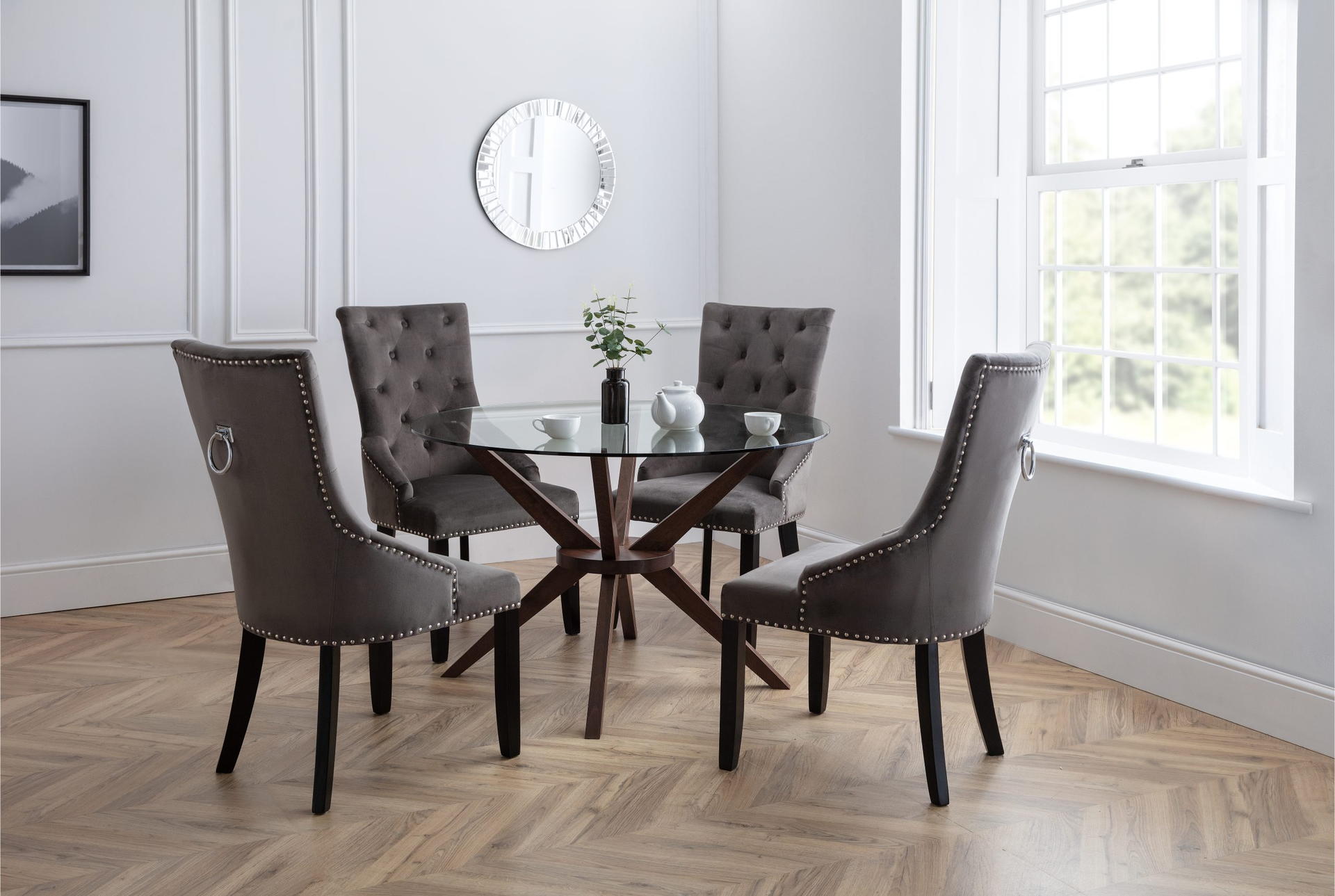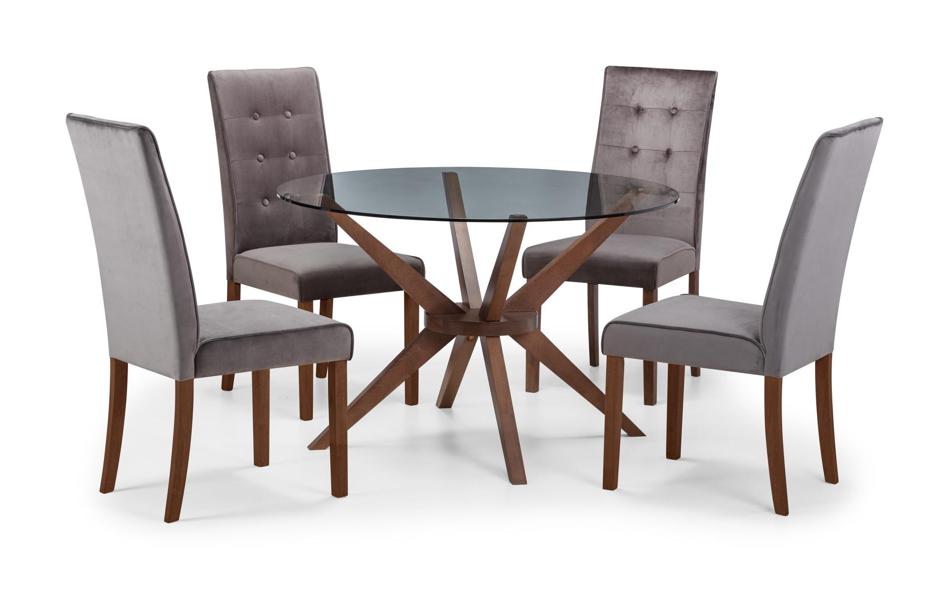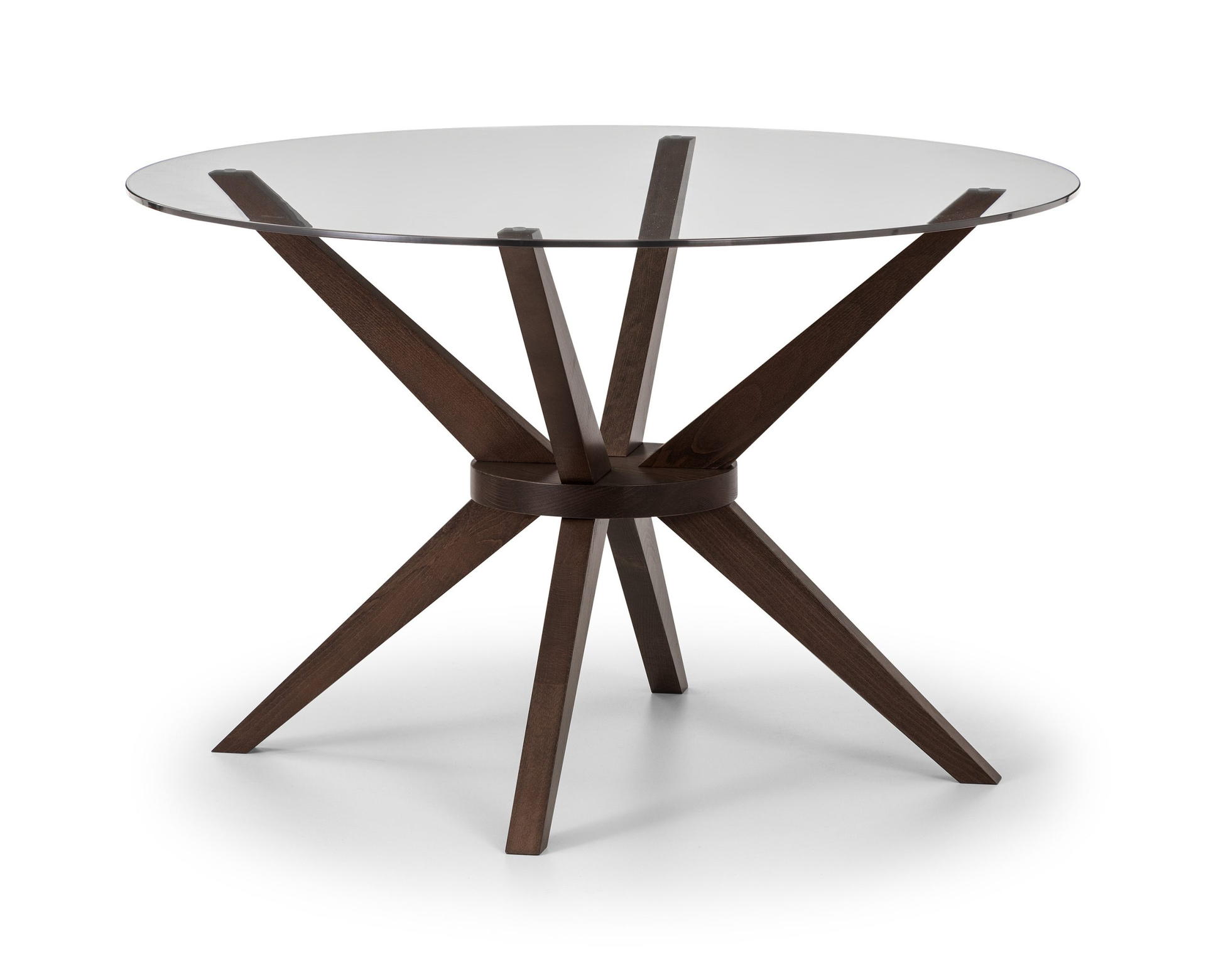 A truly stunning 120cm circular dining table featuring an elegantly styled solid wood base in walnut finish, topped with a substantial tempered glass top to create an exquisite contemporary piece that will take pride of place in any home.