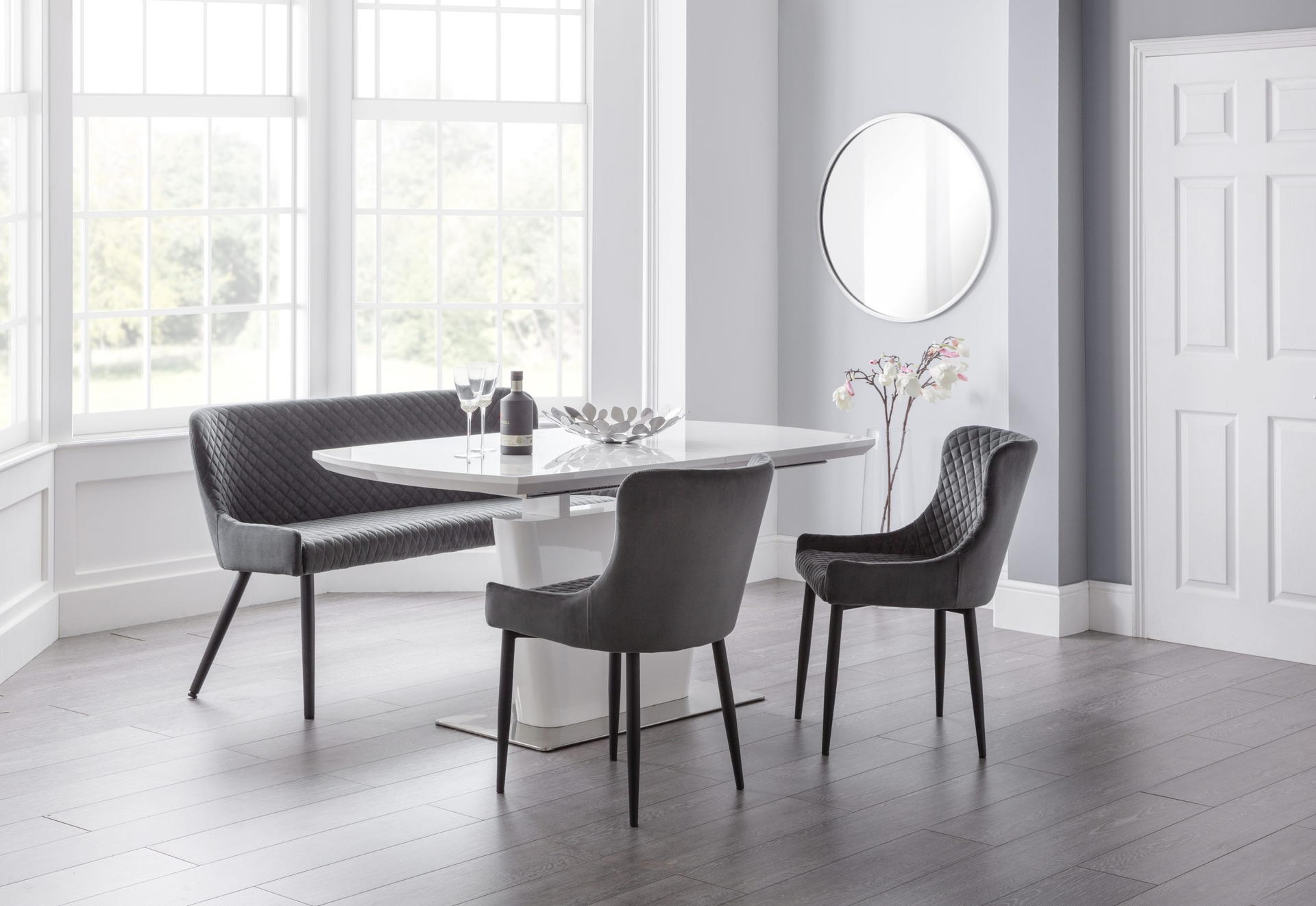 The Como extending dining table is a sleek, modern design finished in a crisp white high gloss with a sturdy chrome pedestal base. This spacious table features a butterfly extension system that is easy to use and stores within the table when not in use, comfortably seating 6 people. This striking dining table will be a lasting style statement in any dining room. Complete the glamorous look with the Como cantilever dining chairs.