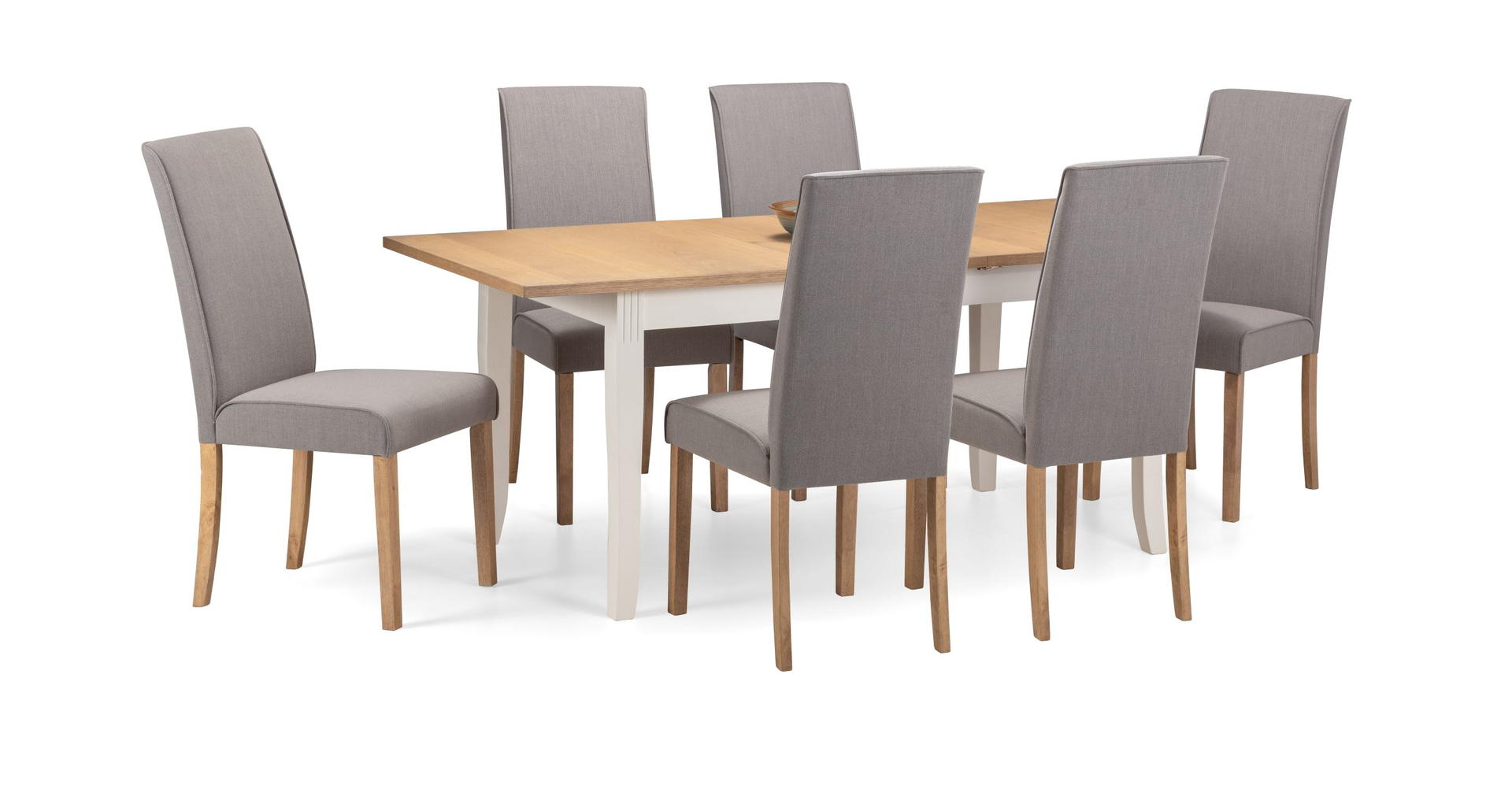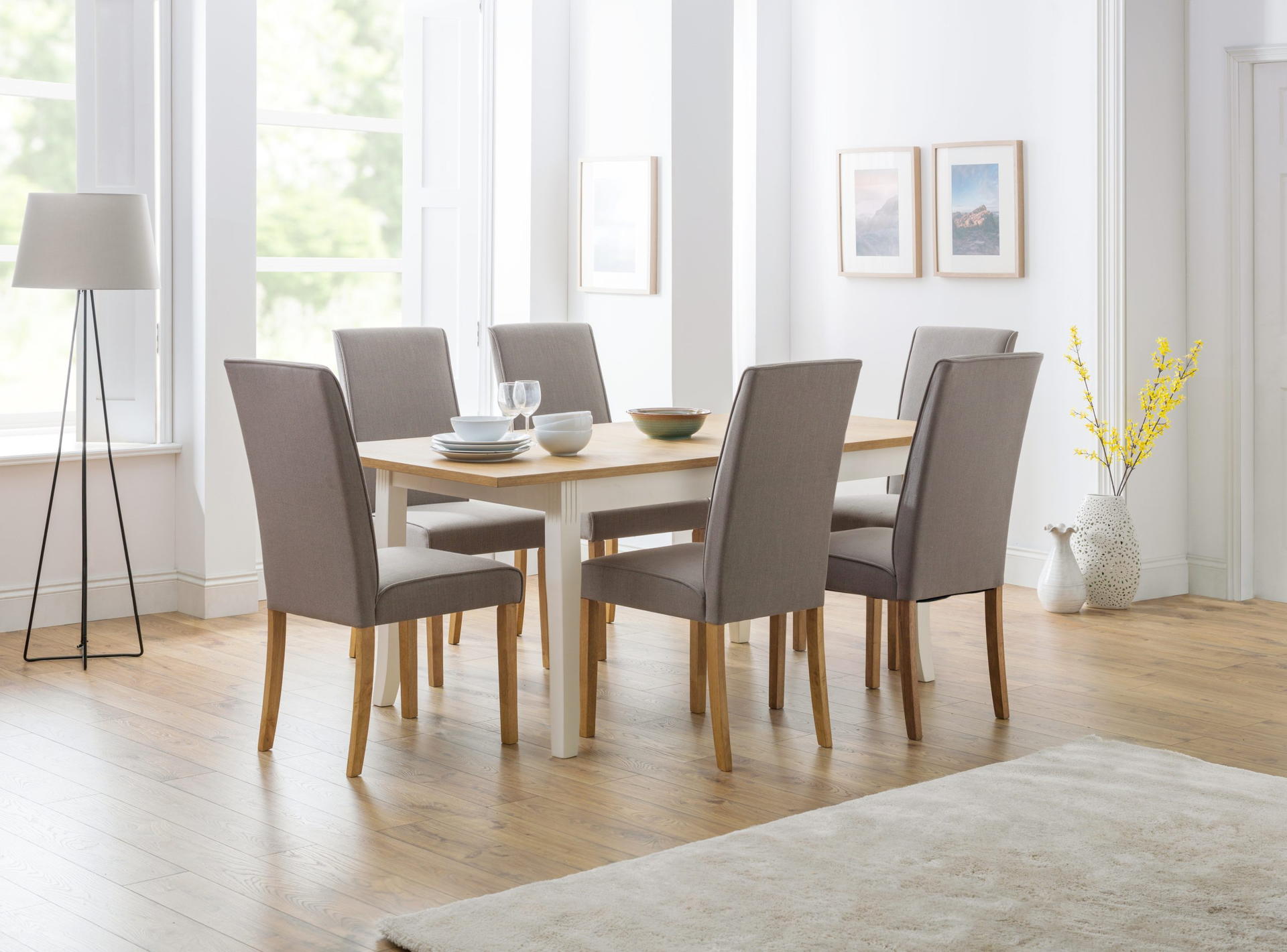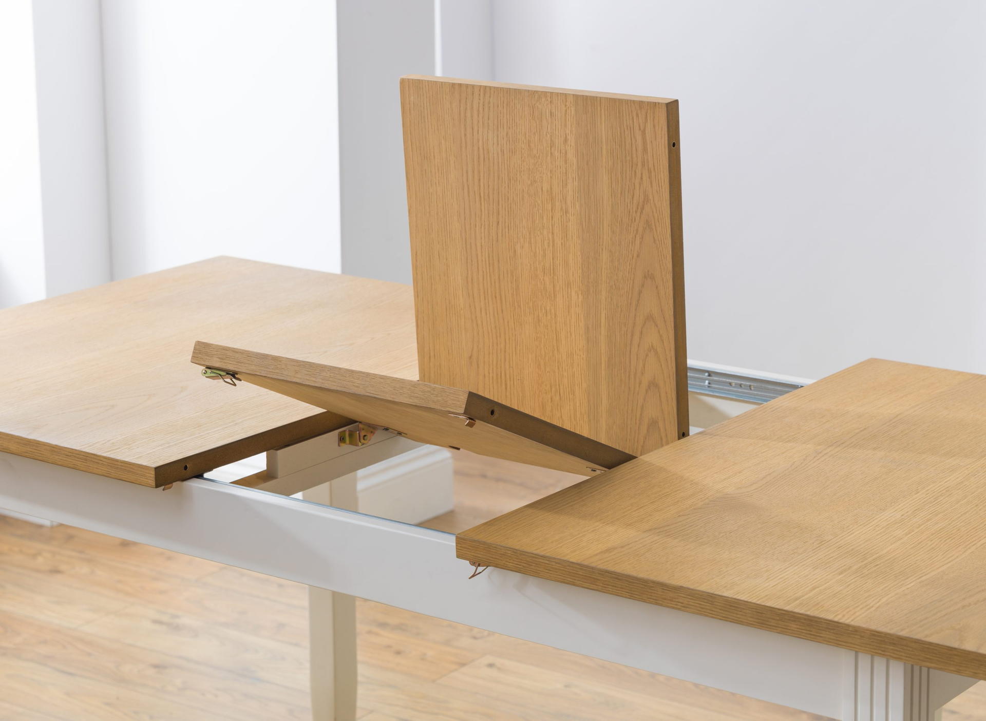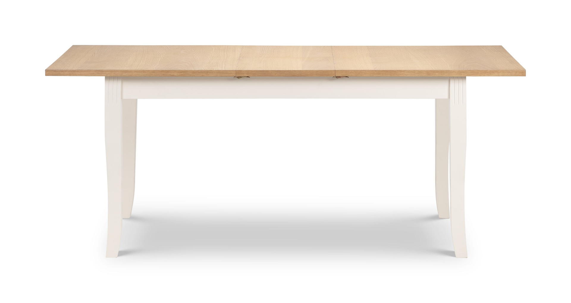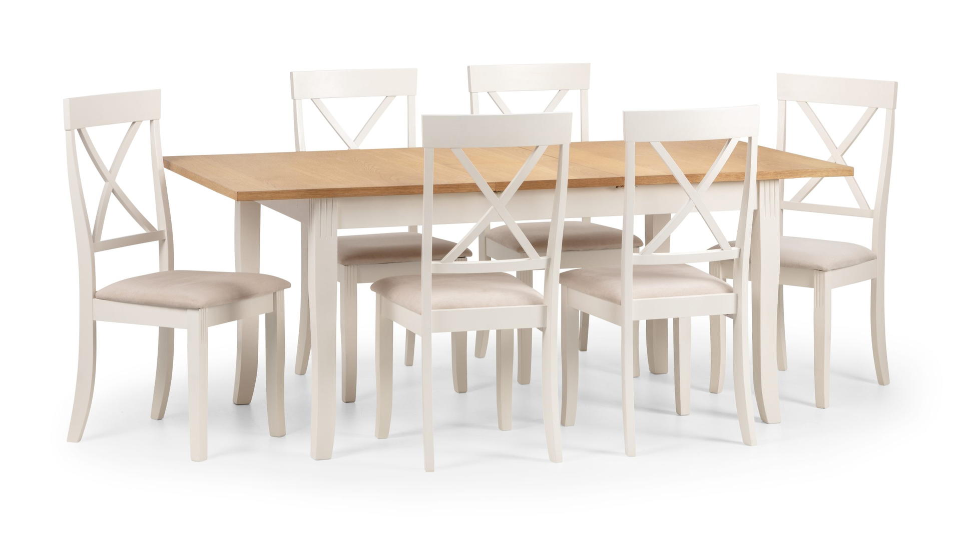 Crafted from solid rubberwood and a real oiled oak veneer 25mm top, this dining table is perfect for having dinner guests. An elegant ivory finish allows the Davenport table to match a wide range of décor, as well as brining a touch of elegance. Featuring a butterfly extension system that is easy to use and stores within the table when not in use, creating more space for your guests when needed. A wide range of coordinating items are available in the Julian Bowen Davenport collection