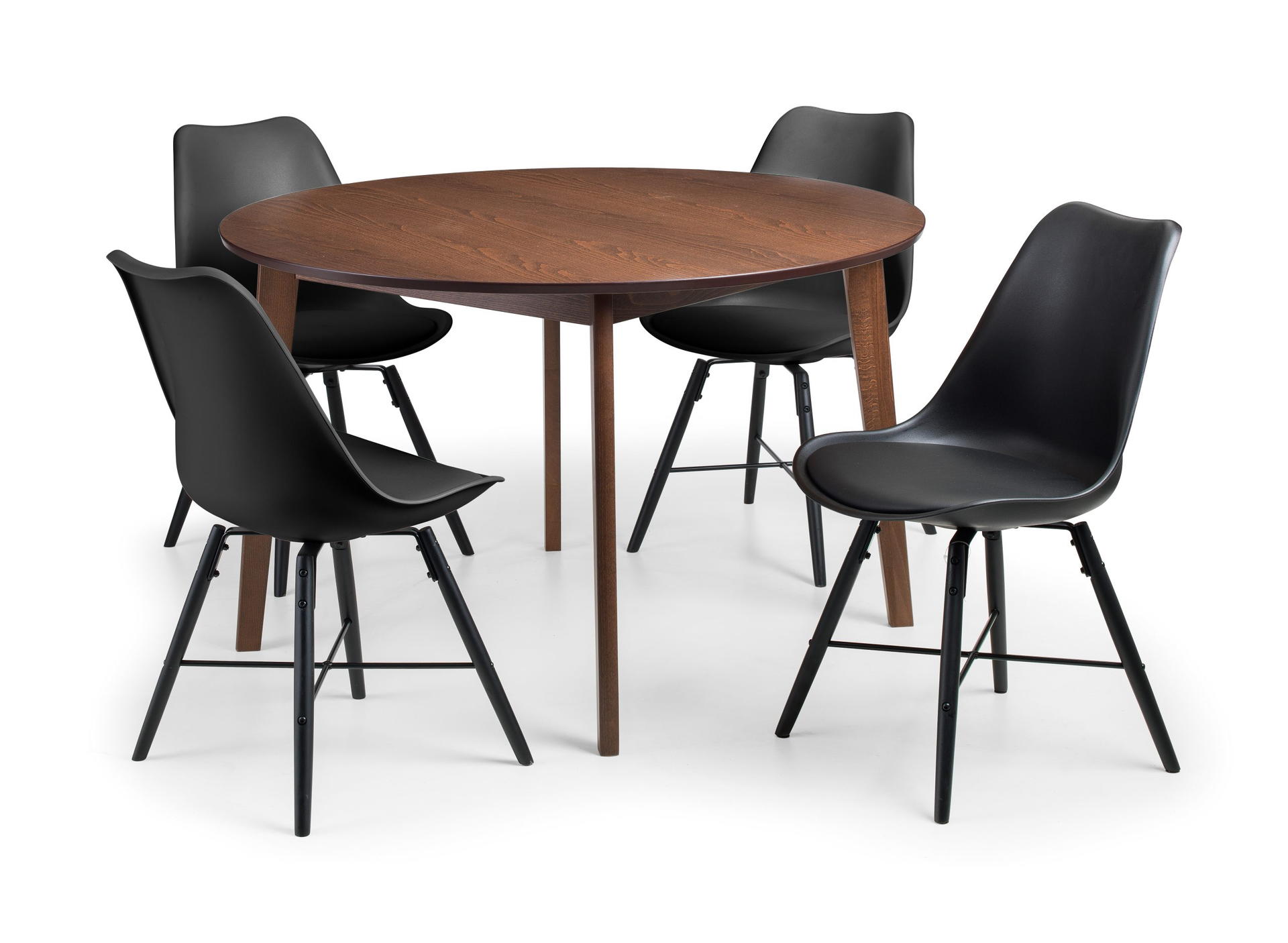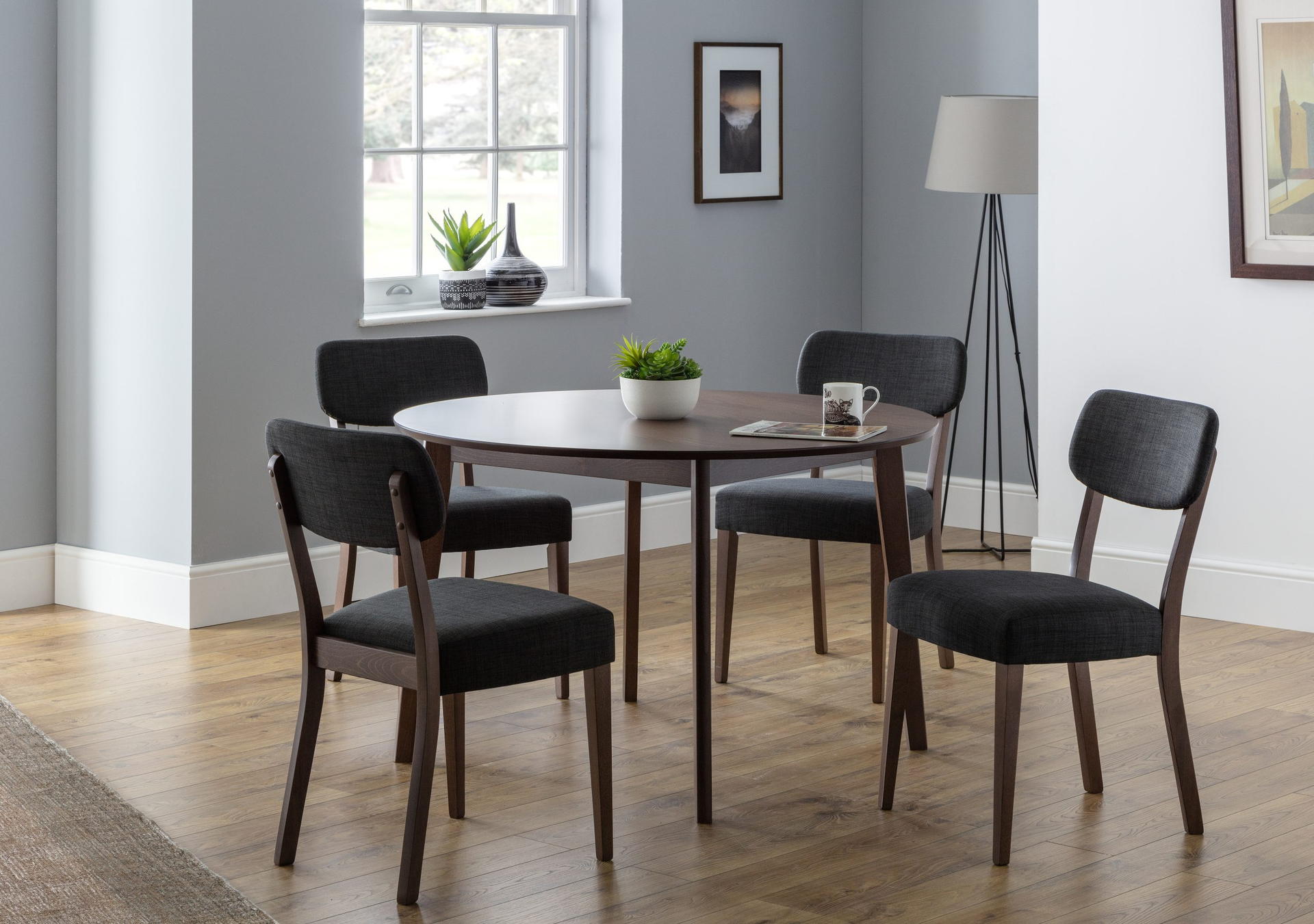 The Farringdon round dining table offers a timeless, functional accent to your home. Bringing warmth to any dining room, perfect for a mix of modern or traditional decor. Crafted from walnut effect foil wrap, this rich coloured dining table highlights the natural beauty of the grain.