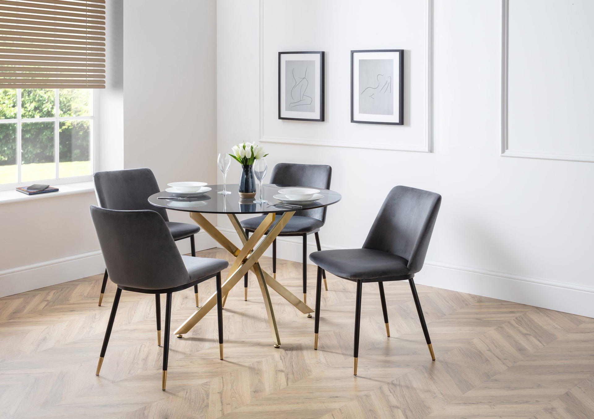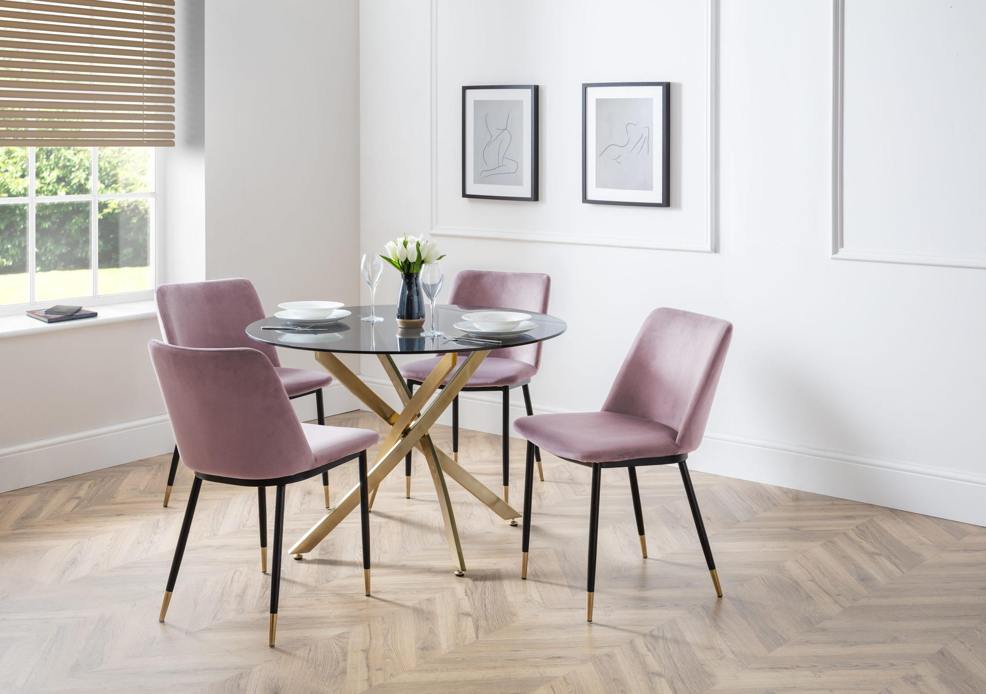 Montero is a strikingly elegant dining table which combines gold metal and glass to create a modern and stylish aesthetic. The intertwined legs leave a unique look which also provide a sturdy support for the table – making this a great, durable centre piece in any home.
