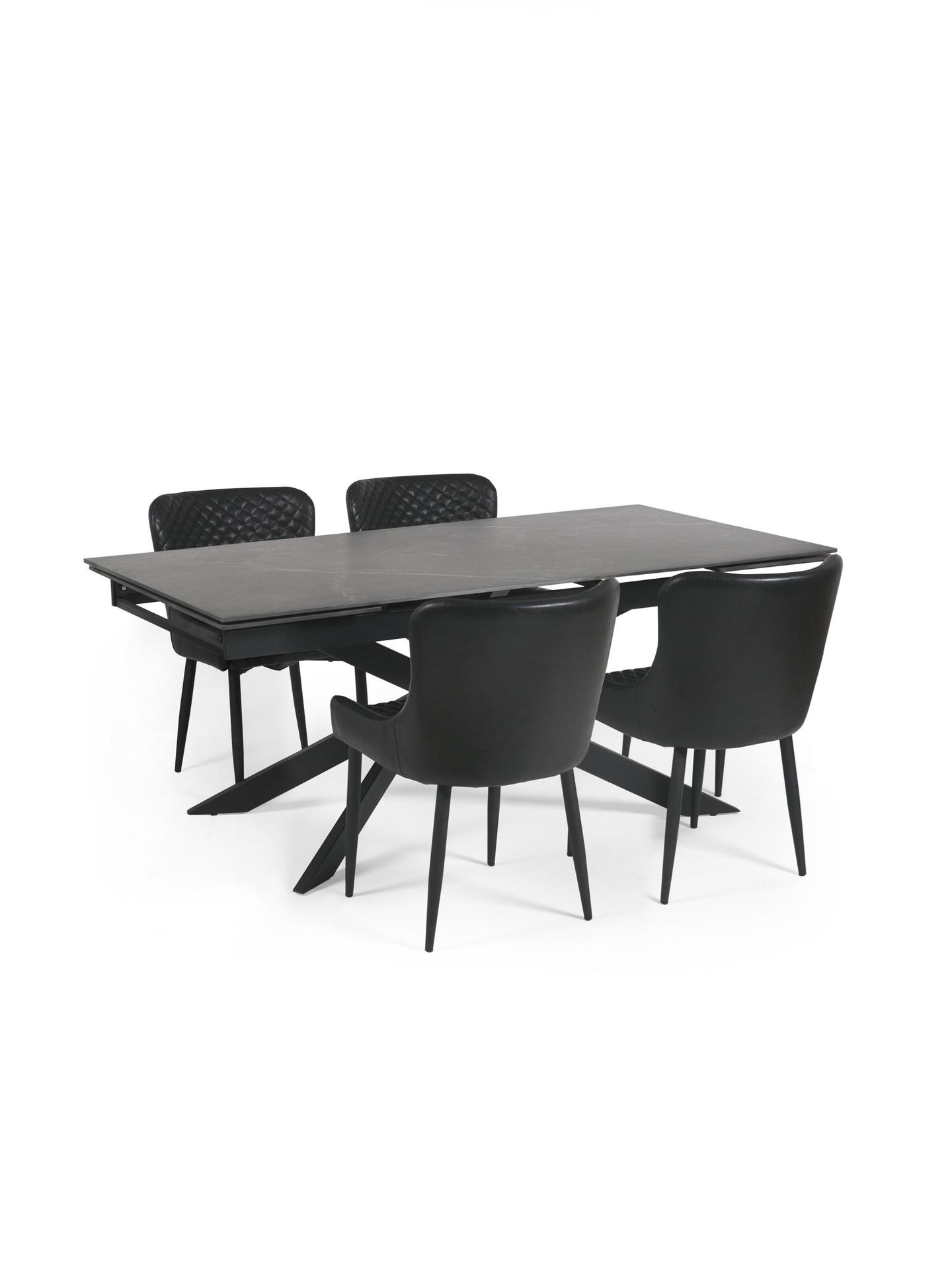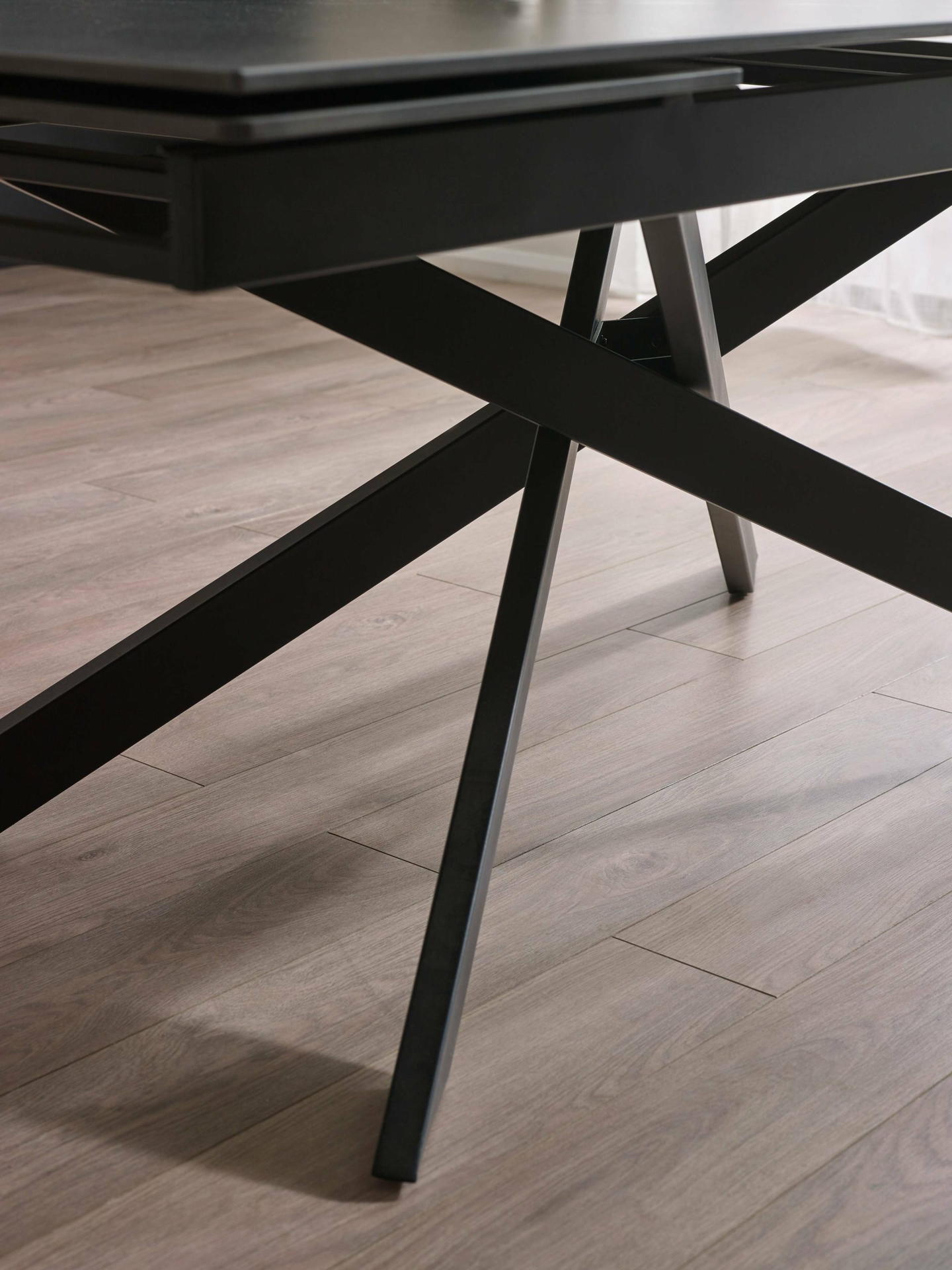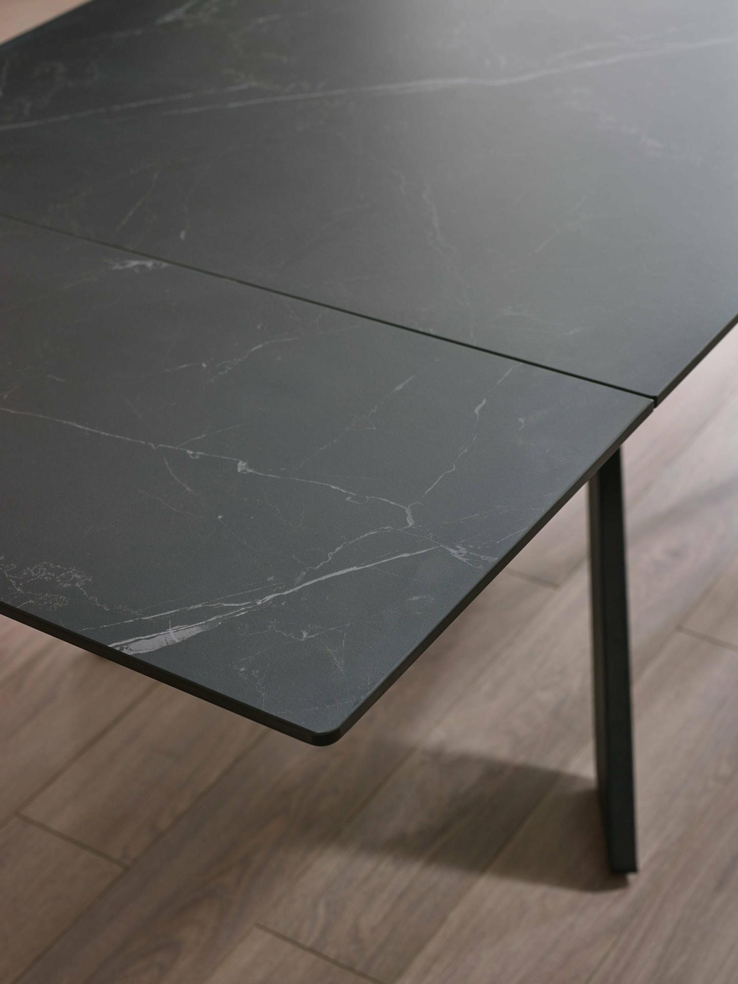 Designed to make a statement, the table’s asymmetrical black powder-coated metal legs create a bold and contemporary silhouette, while the solid metal base ensures exceptional stability. The extension leaf conveniently stores within the table when not in use, blending practicality with sleek design. Minimal assembly is required, ensuring a quick and seamless setup.