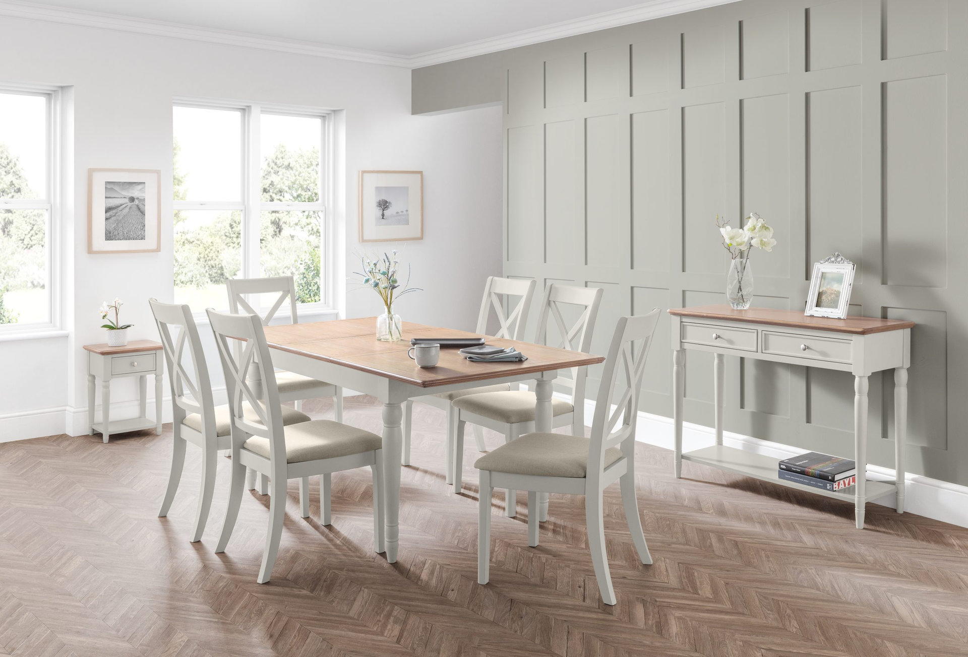 This timeless table offers an authentic antique design with a classic turned leg detail perfect for contemporary spaces as well as traditional homes. Finished in a grey lacquer with a limed oak effect top, this Provence features an easy to use 40cm butterfly extension system allowing the extra room for your dinner guests. Part of the Provence dining and occasional collection, this dining table becomes a stunning set when paired with the Provence dining chairs.