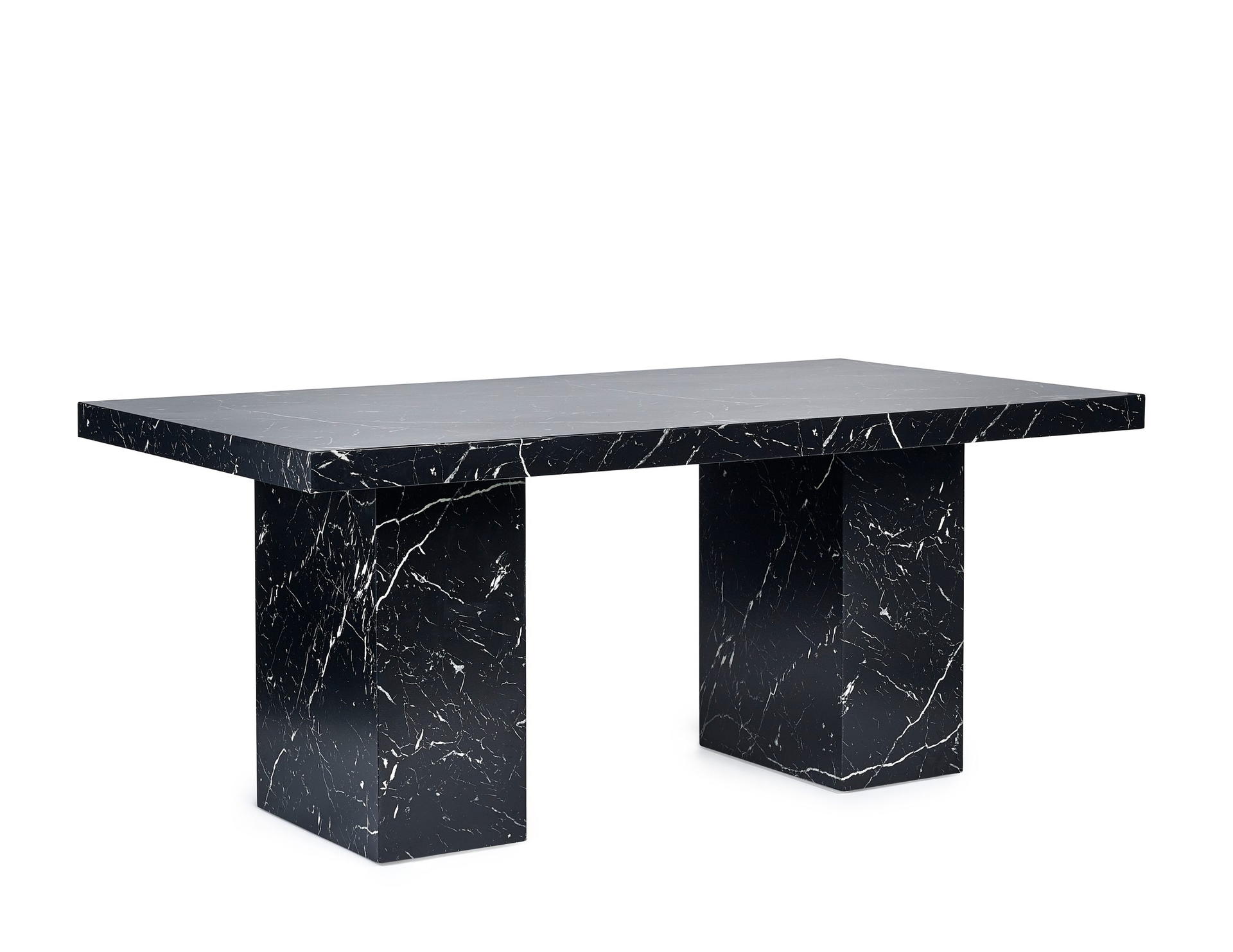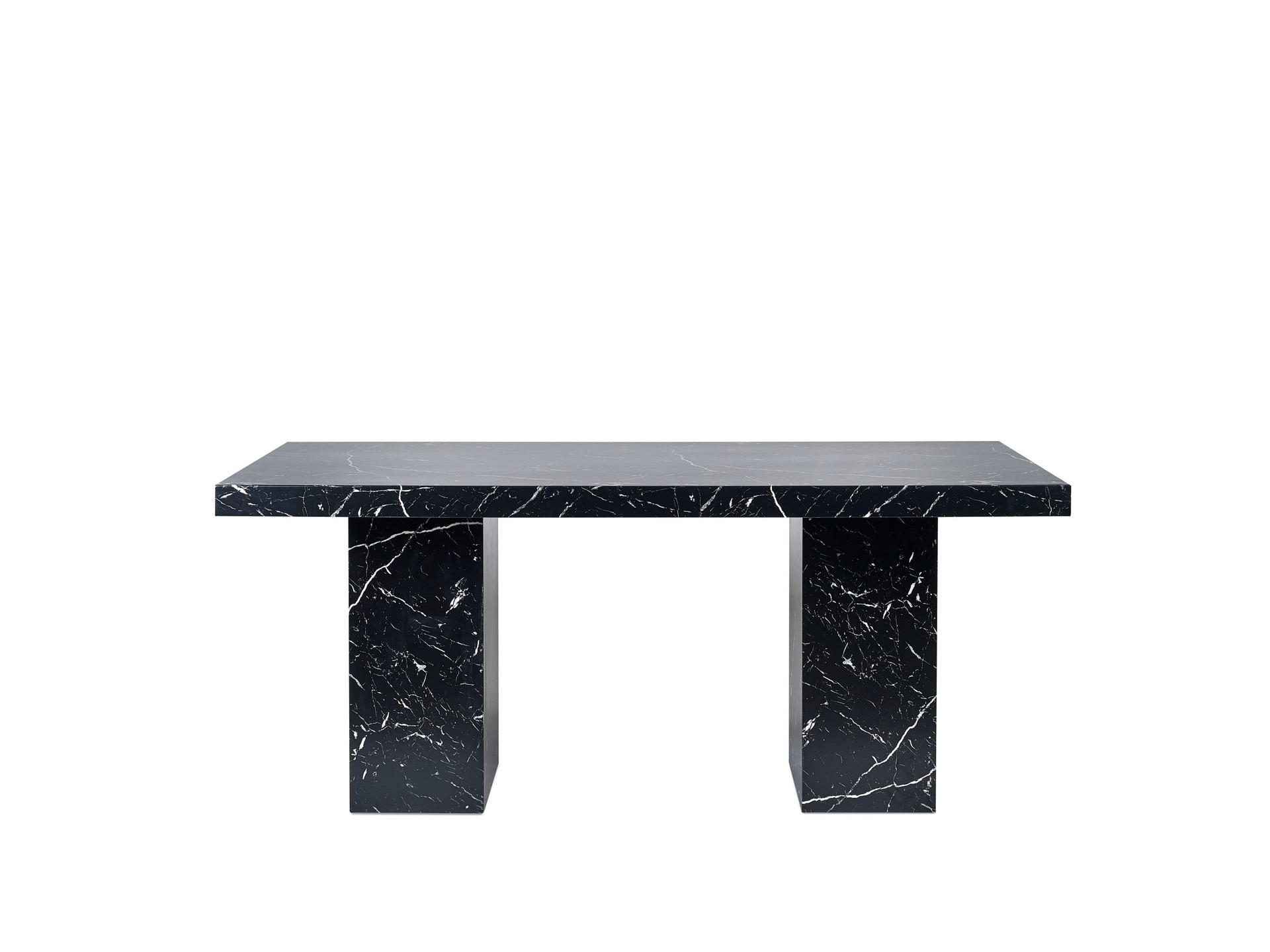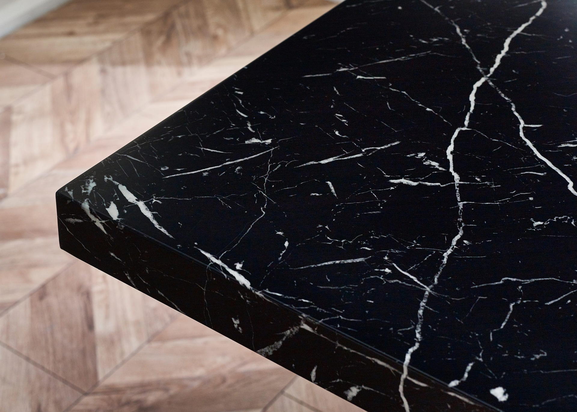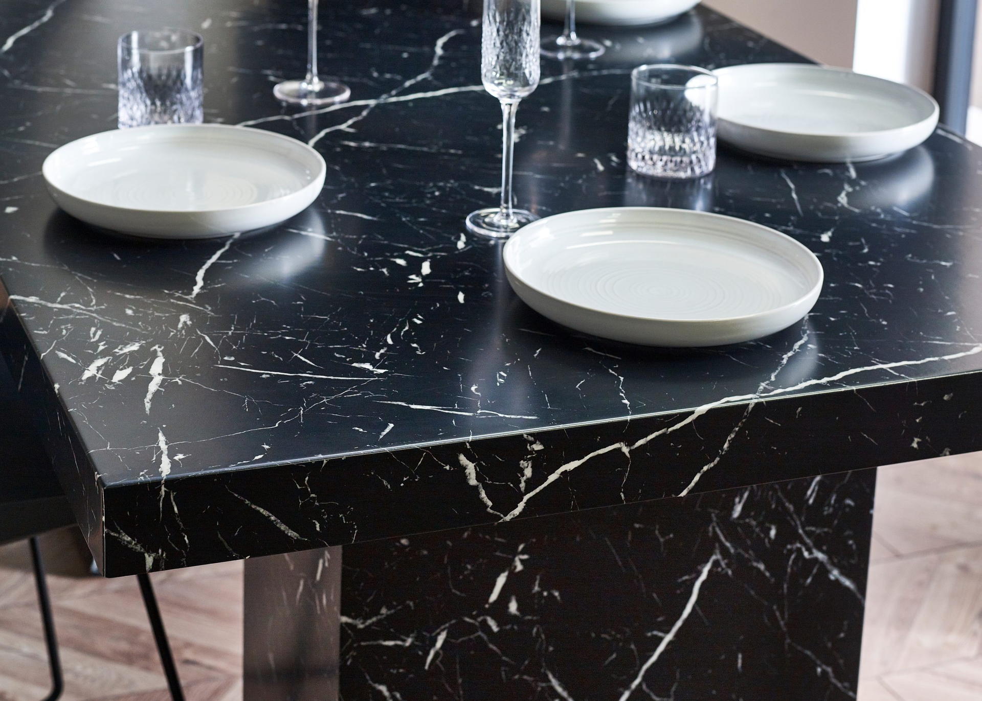 Showcases a stunning black marble effect tabletop, effortlessly merging classic sophistication with a modern twist.