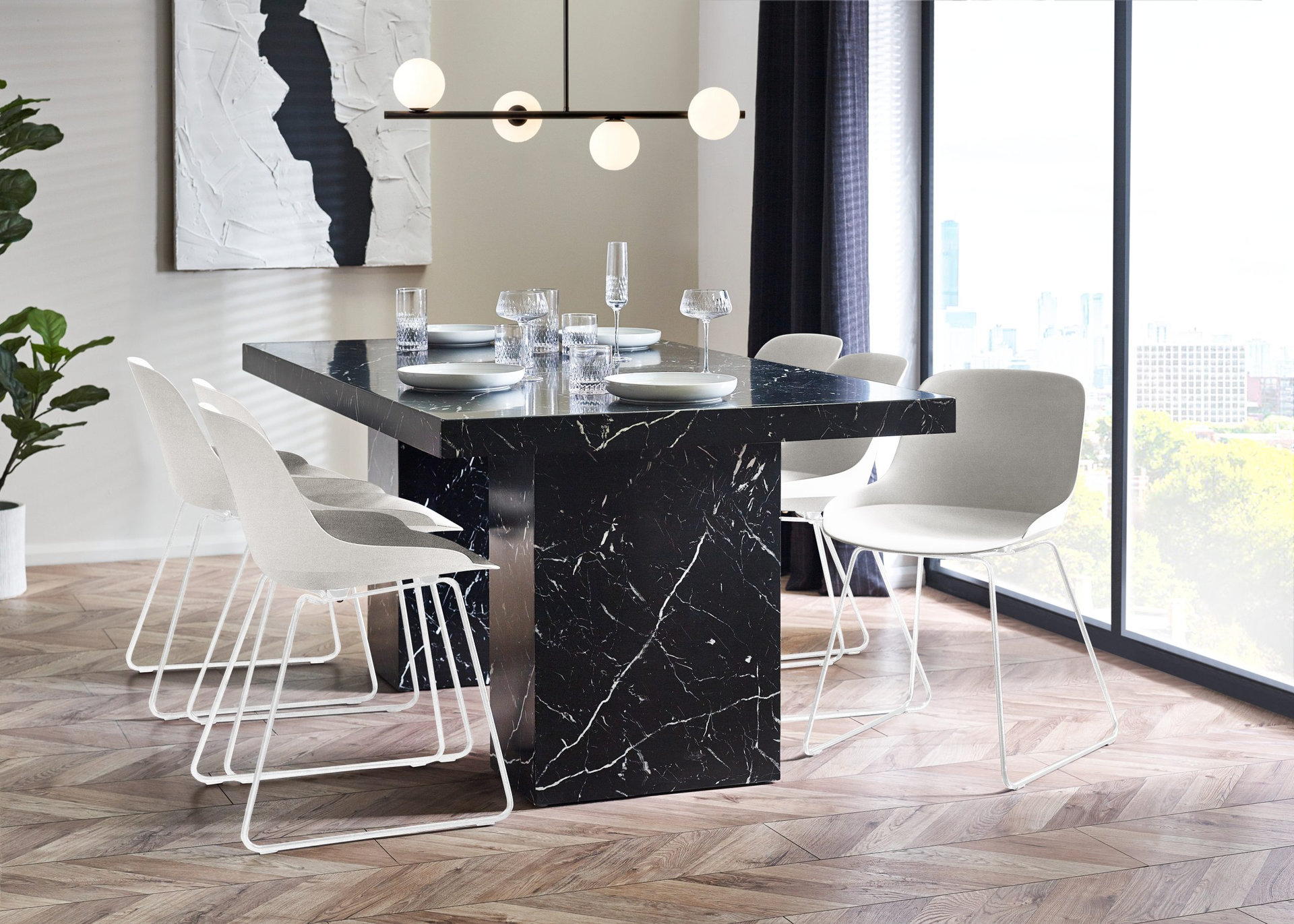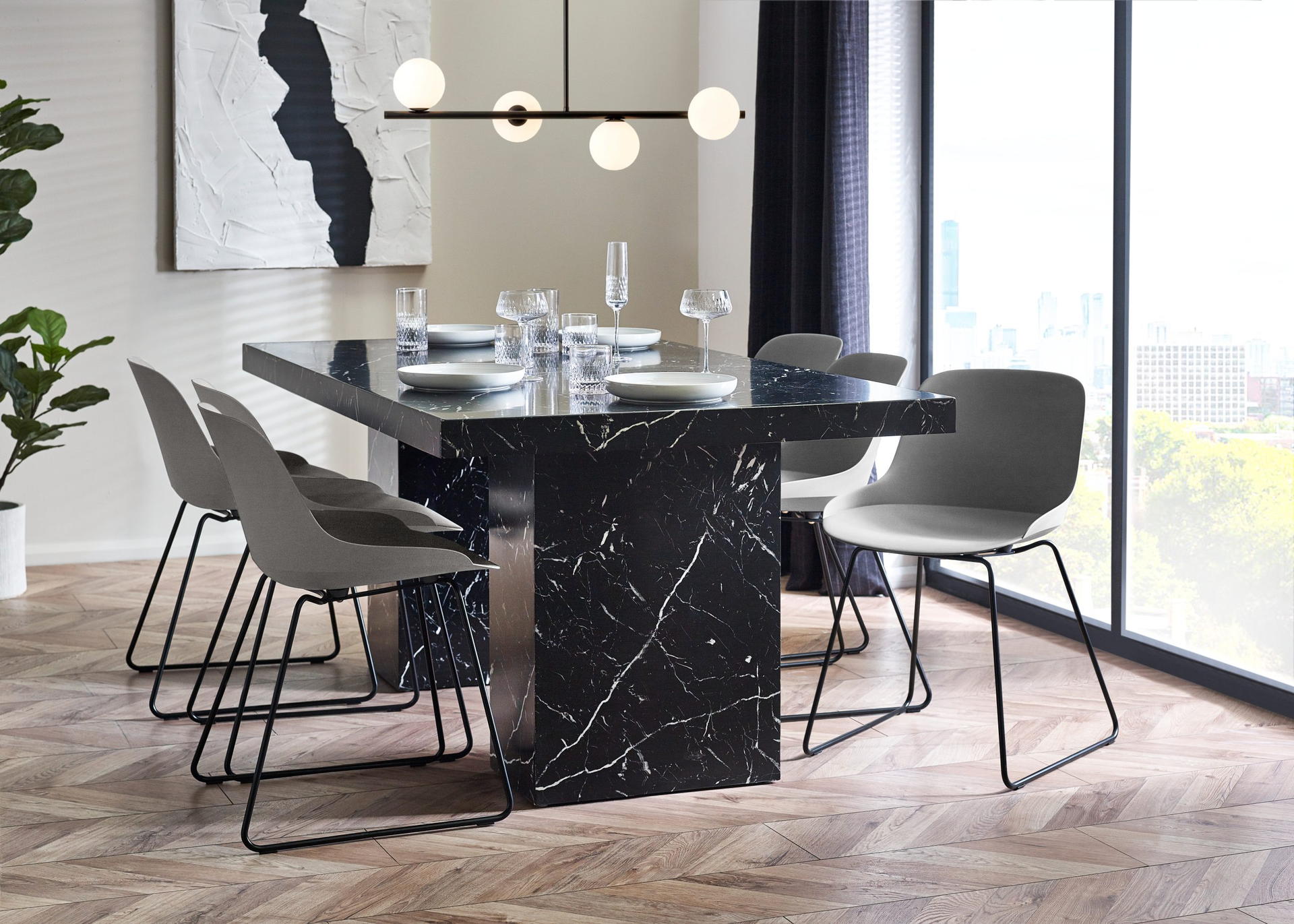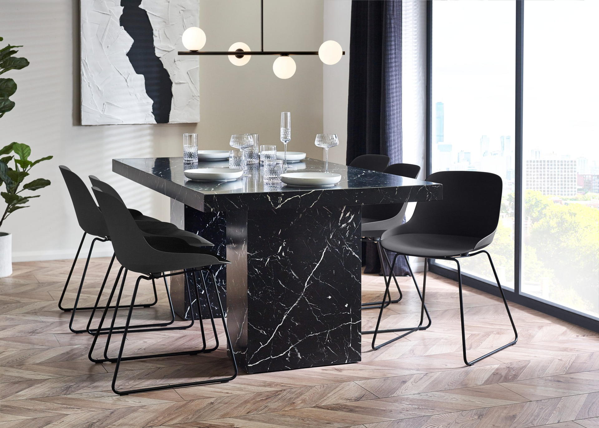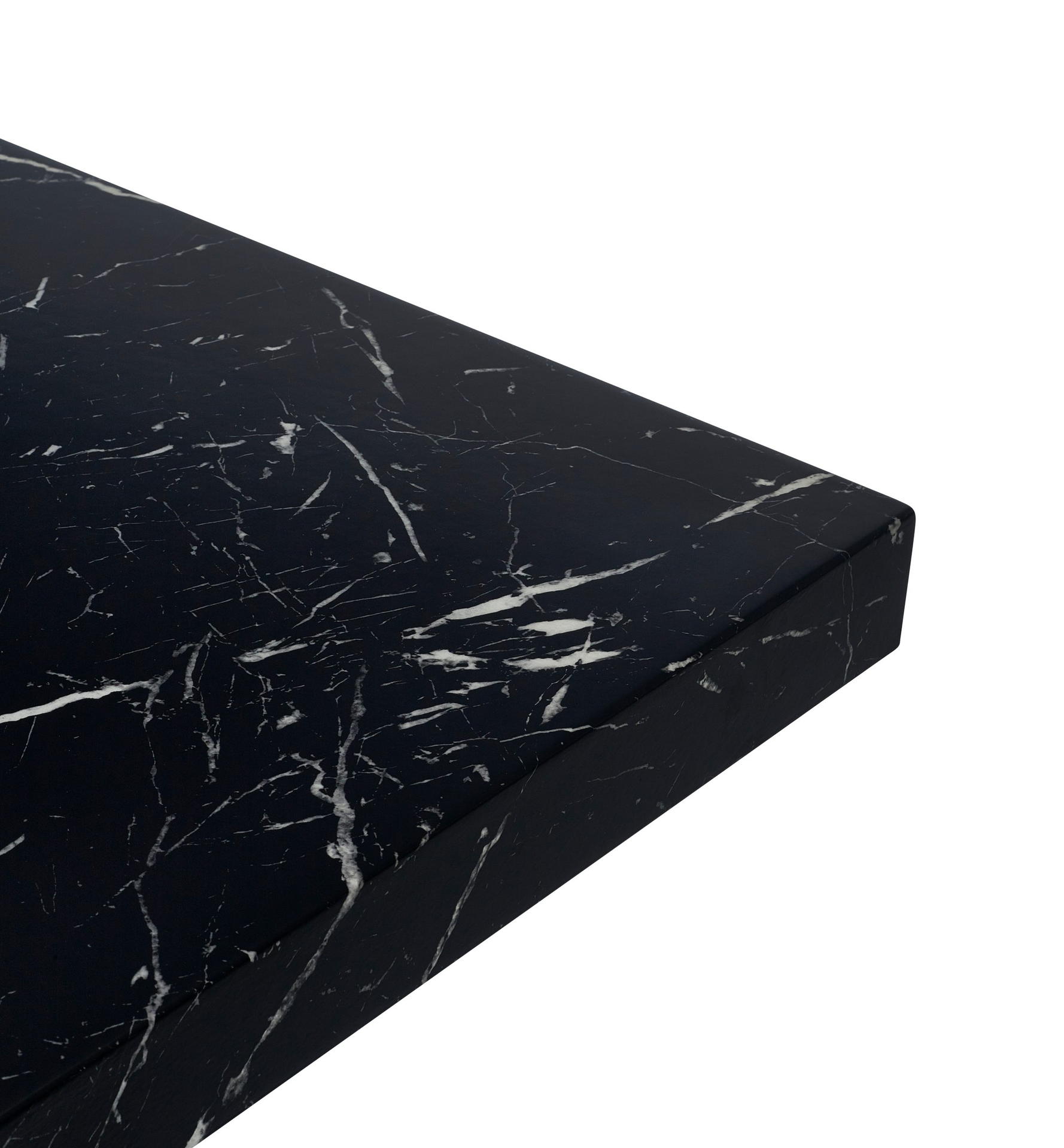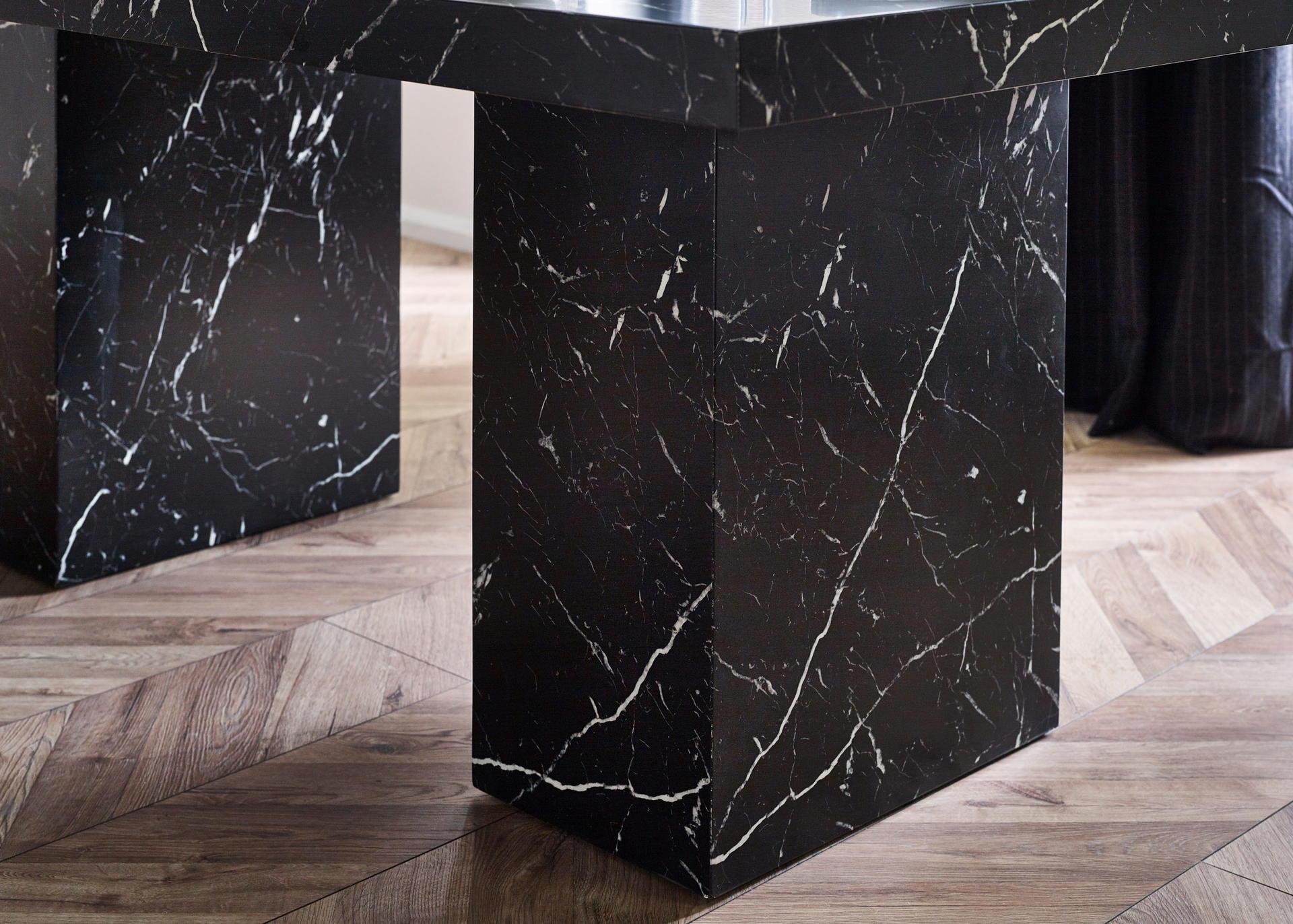 Showcases a stunning black marble effect tabletop, effortlessly merging classic sophistication with a modern twist.