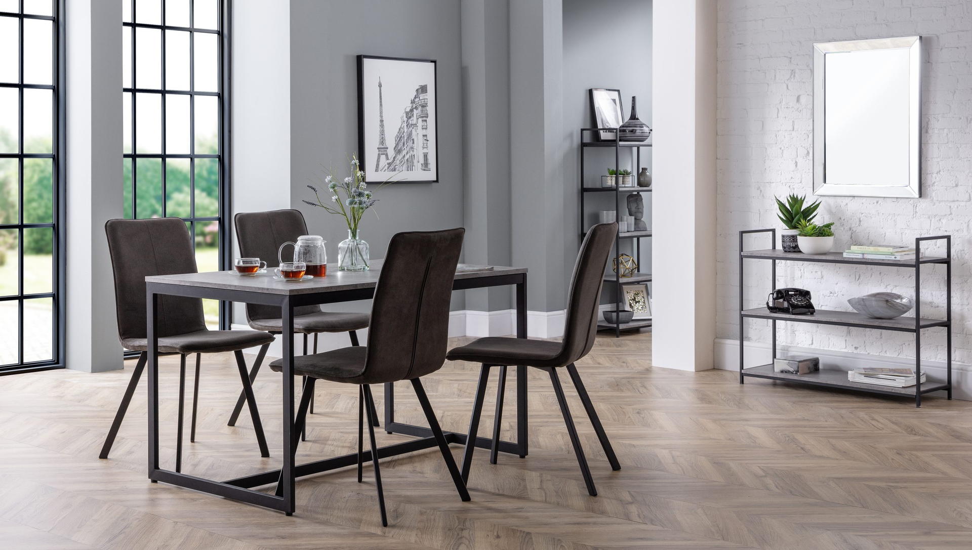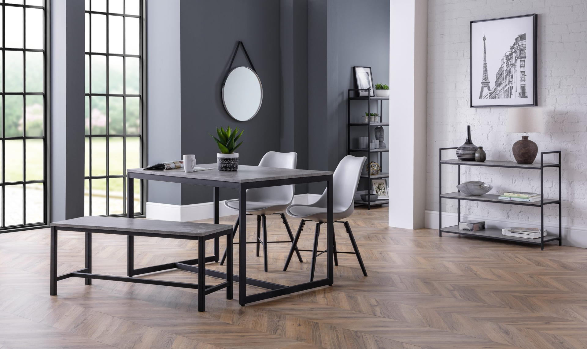 Simplistic in design with a contemporary style, the Staten Dining Table will add a stunning industrial look to any living and dining area. Constructed from a black coated metal frame, complemented by a striking concrete effect tops, to create a very stylish, modern product. Part of the Julian Bowen Staten Dining and Occasional Collection.