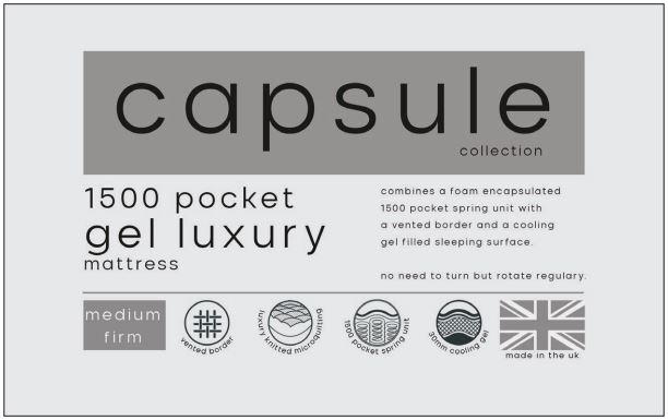 The Capsule Gel Luxury Mattress offers a 1500 pocket spring unit, with foam encapsulated supportive side walls and 30mm cooling gel to help you have a relaxing night’s sleep. Finished in a luxury knitted micro-quilted top panel with a quilted border, the Capsule Gel Luxury Mattress features air vents for increased air flow and horizontal handles for easy lifting. Available in 90cm, 135cm and 150cm sizes, this mattress is part of the Capsule Mattress Collection.