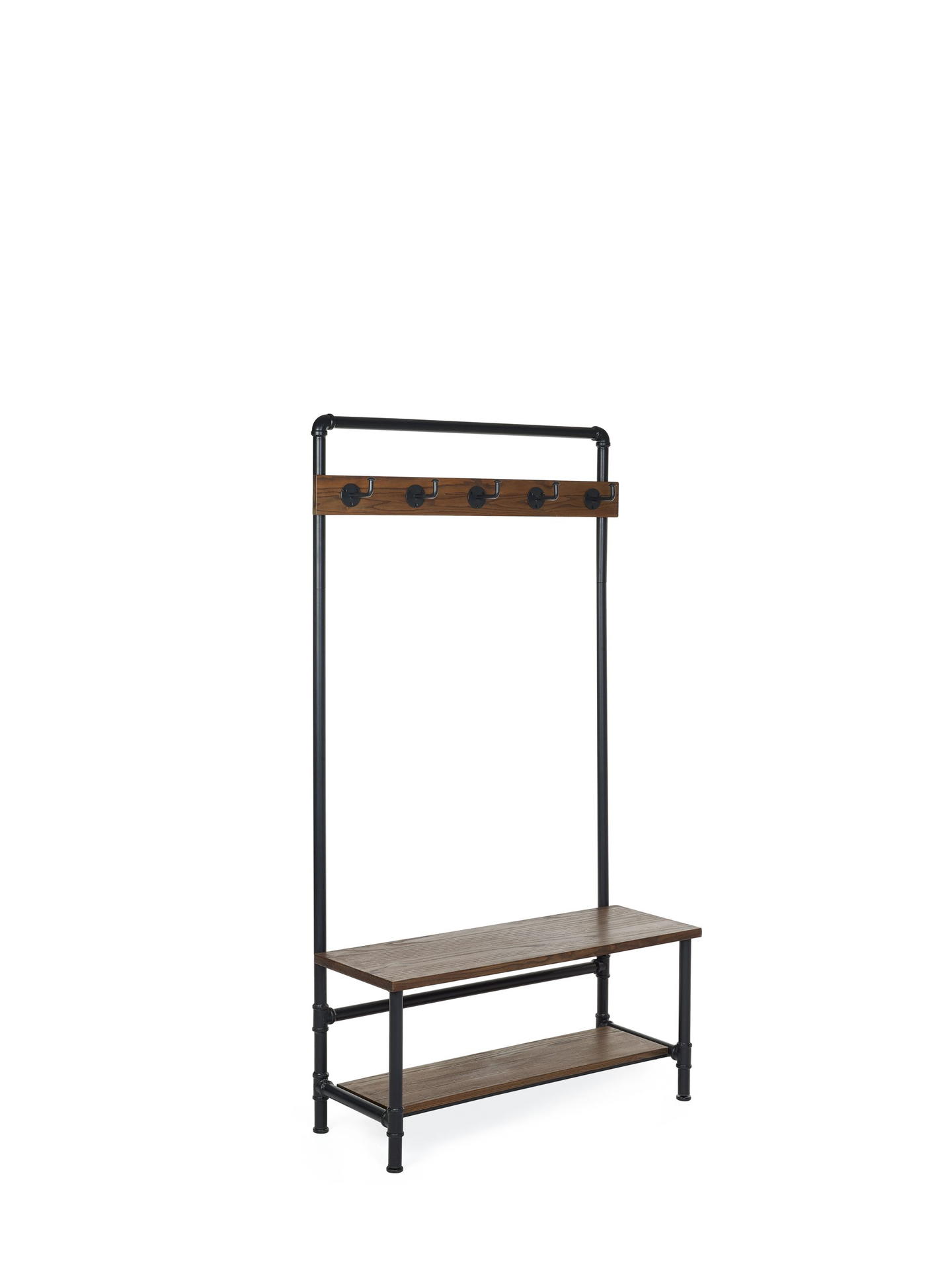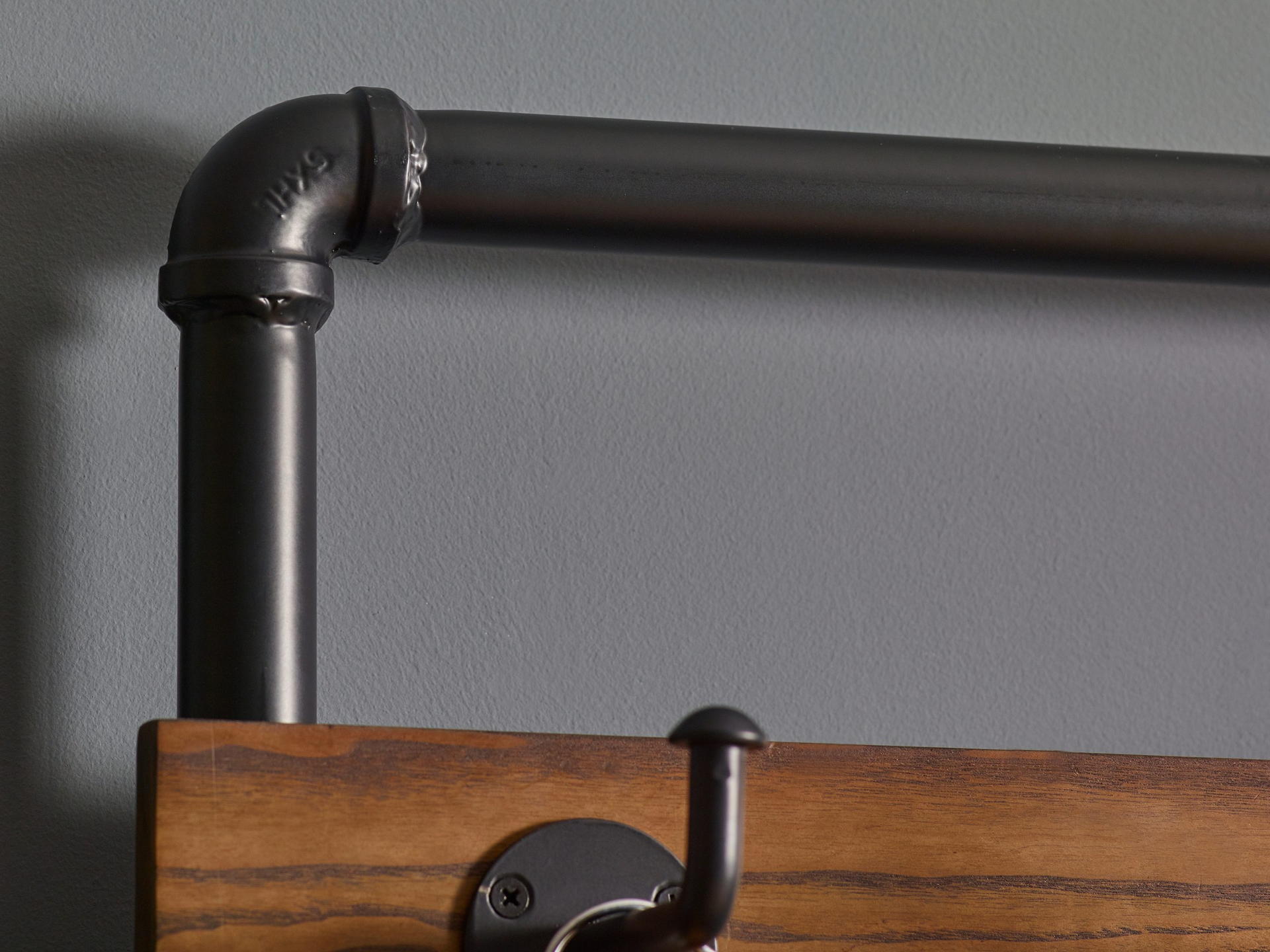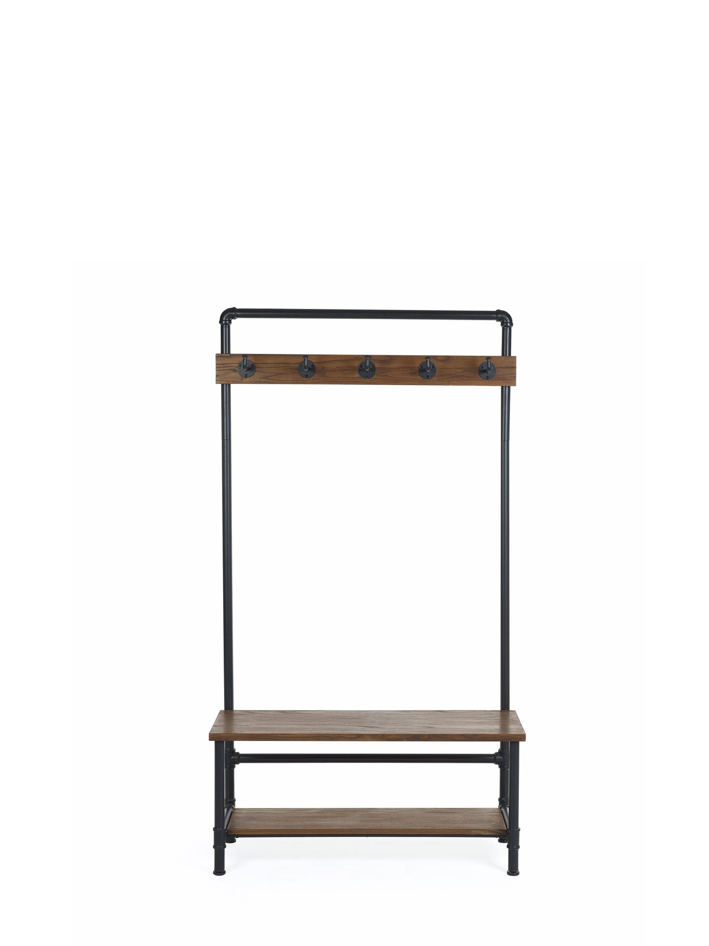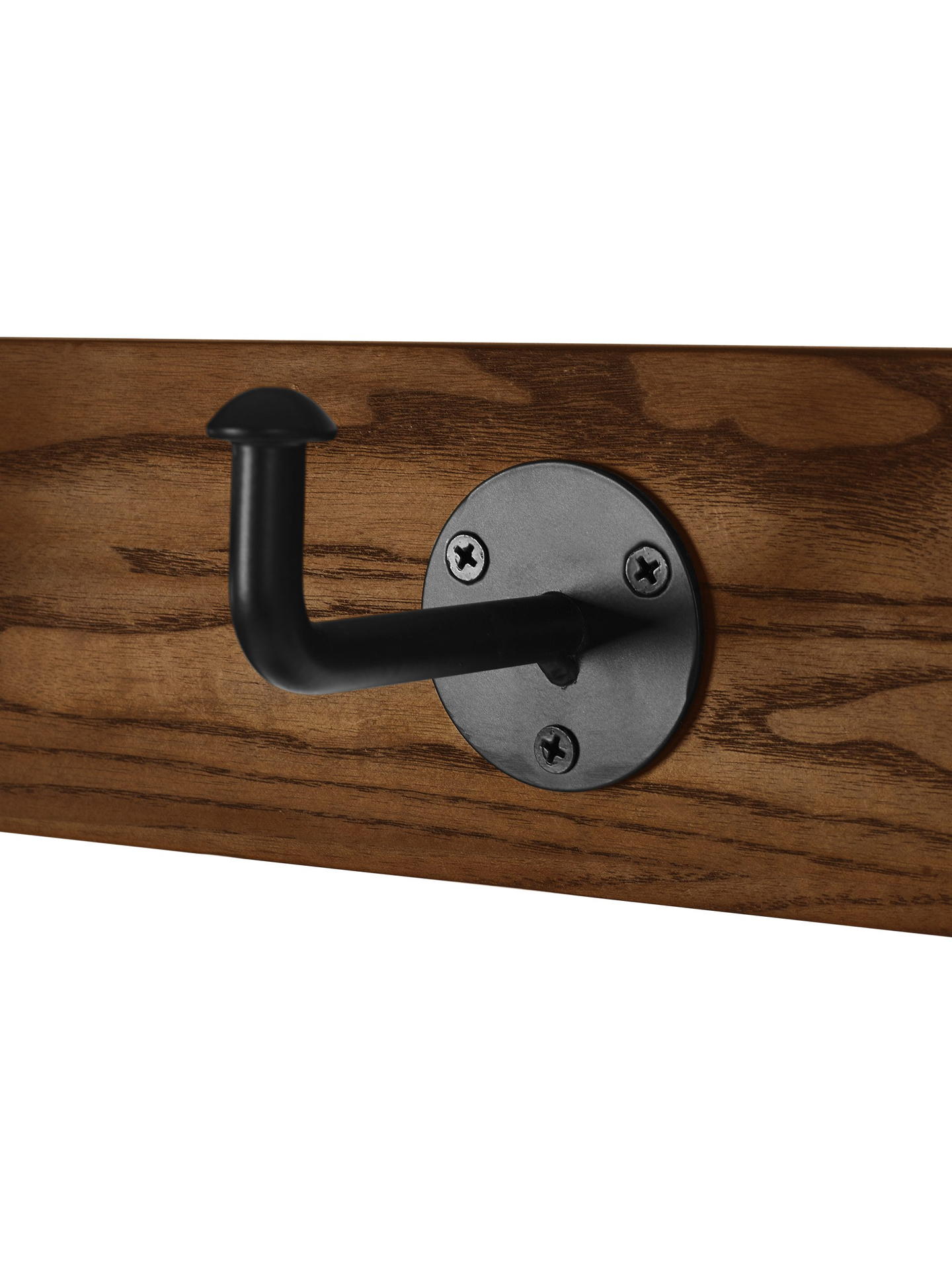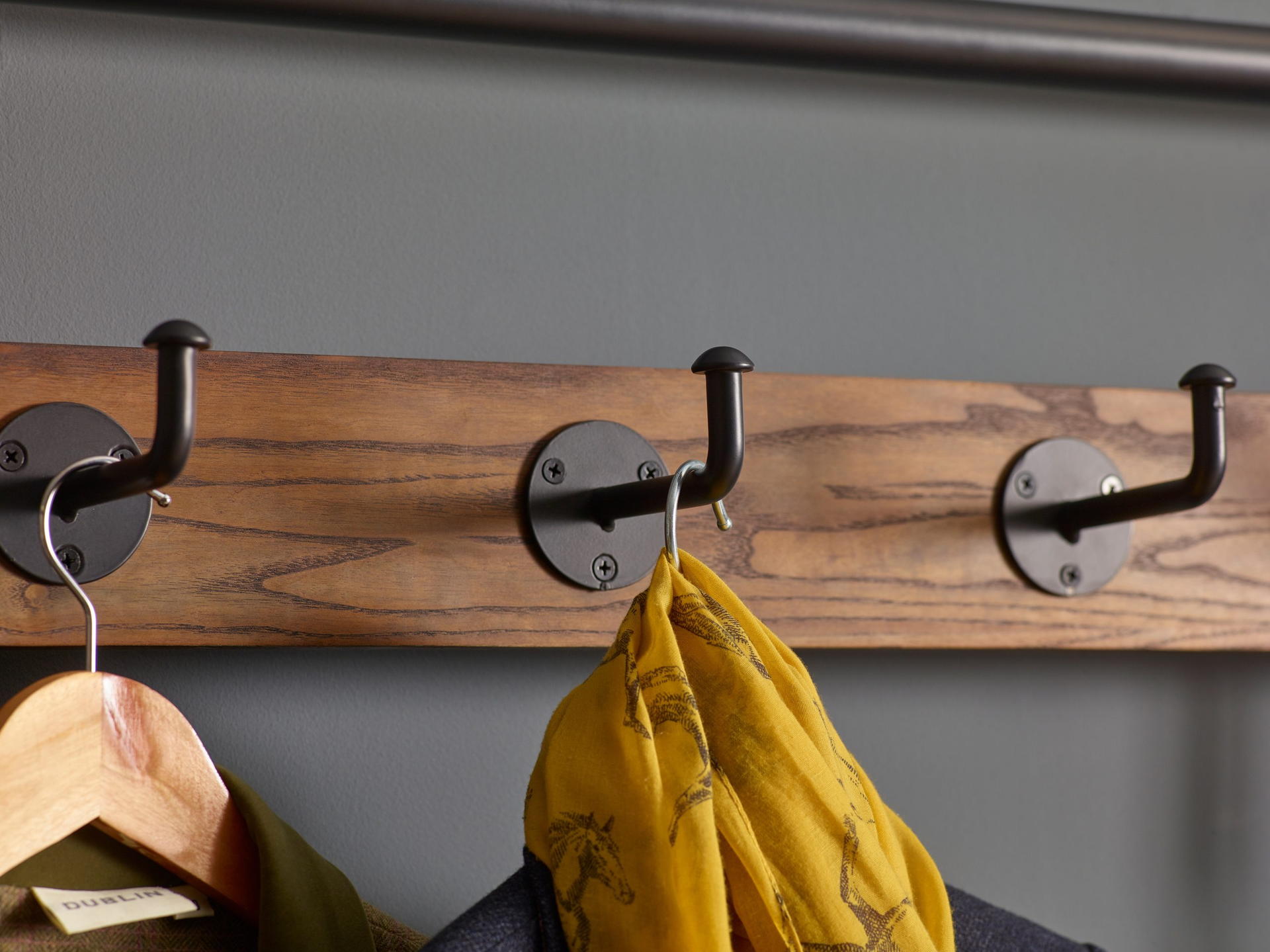 Five black hooks provide easy access to clothing essentials.