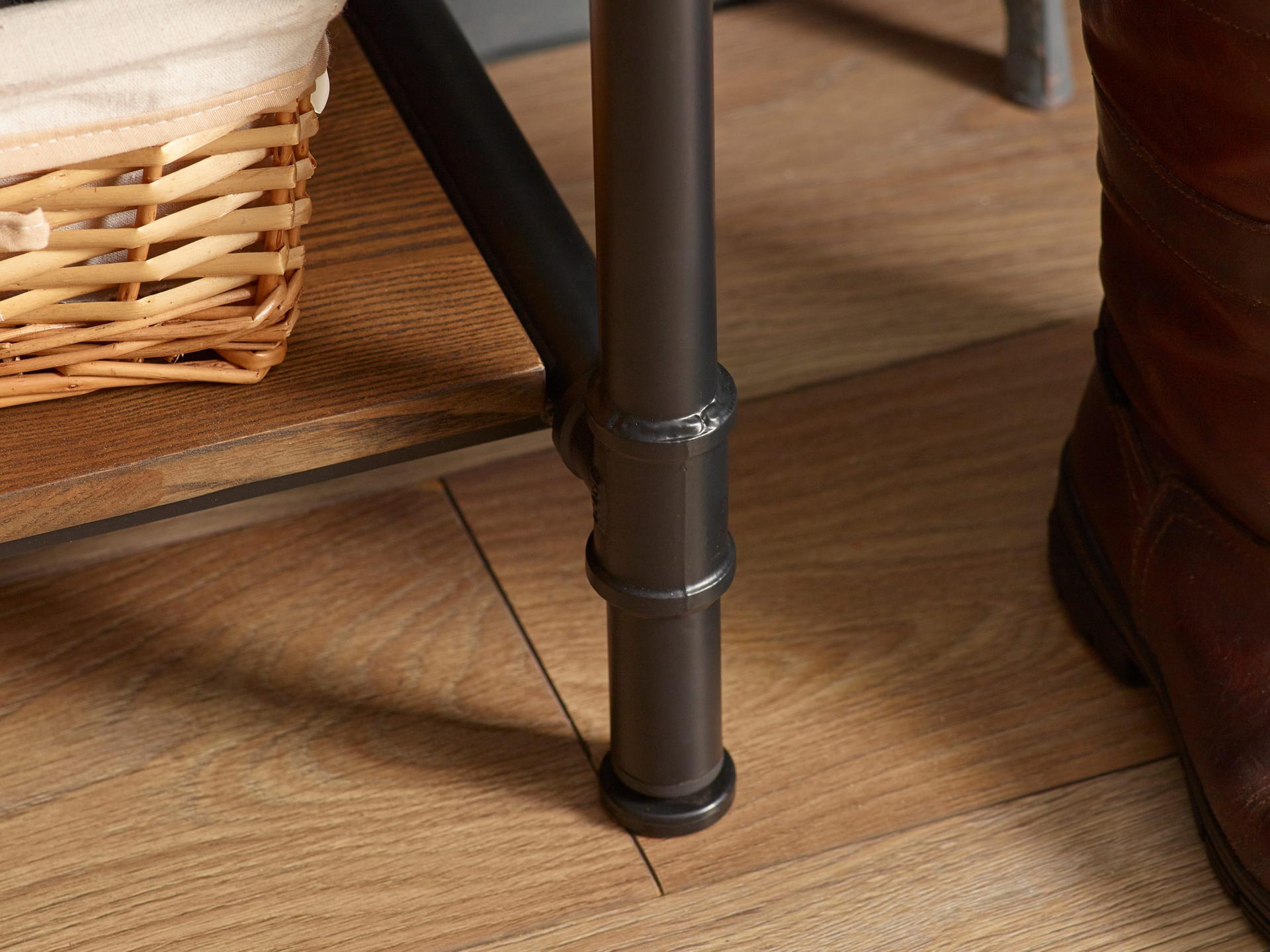 Make a statement in your entryway with the Boston Hallway Stand with Bench, seamlessly blending industrial design with practicality. Boasting sleek pipe legs crafted from powder coated steel for a modern touch to your home decor. With five black hooks provided, it is perfect for keeping coats and bags within easy reach. The built-in bench constructed from solid Elm wood in a luxurious mocha finish, and offers a cosy spot to sit whilst slipping on shoes, with ample storage space underneath for footwear and other essentials. Welcome guests in style with this chic and versatile addition to your home. Minimal assembly is required for your convenience.