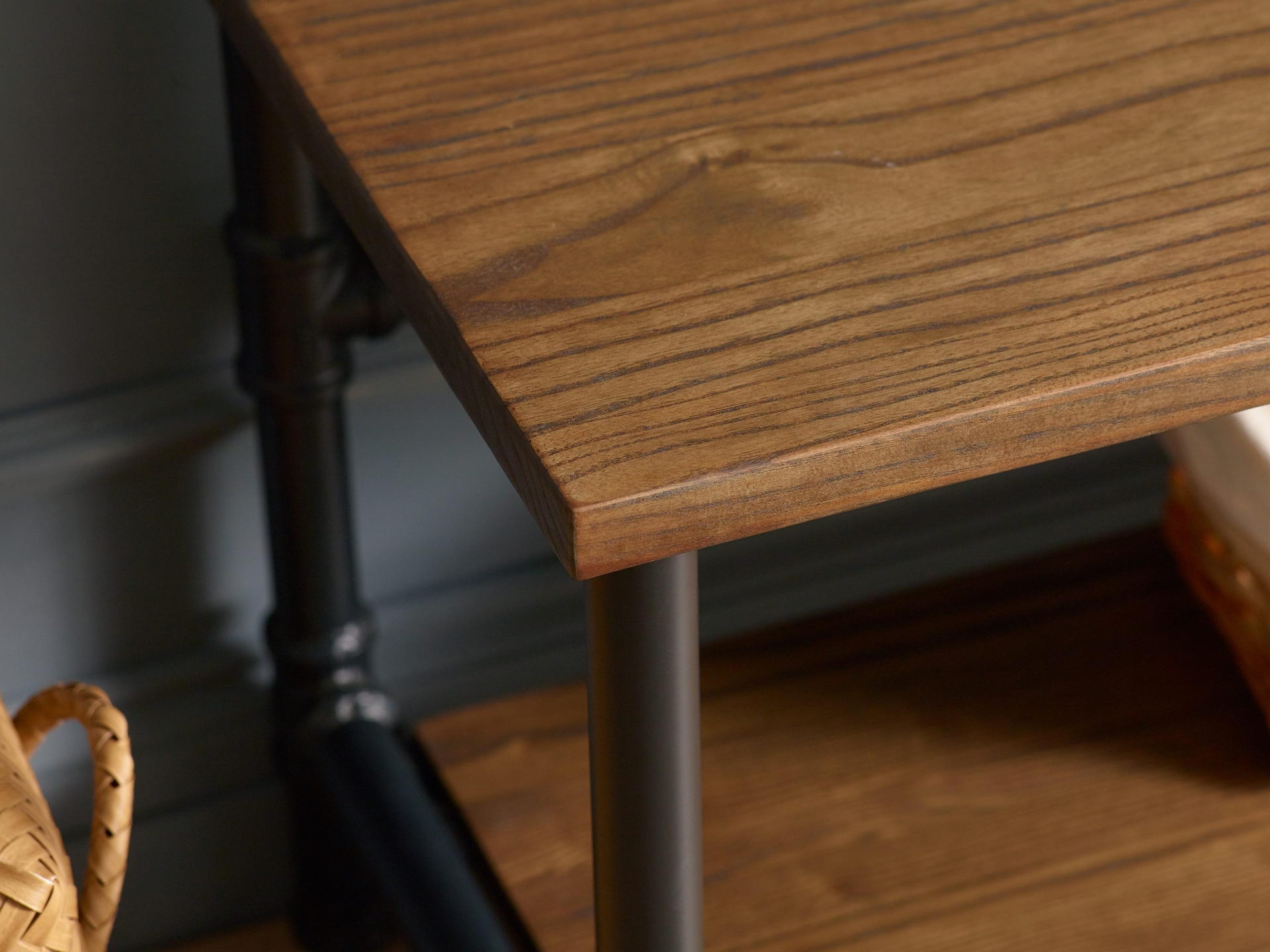 Sleek powder-coated steel pipe legs provide a contemporary aesthetic.