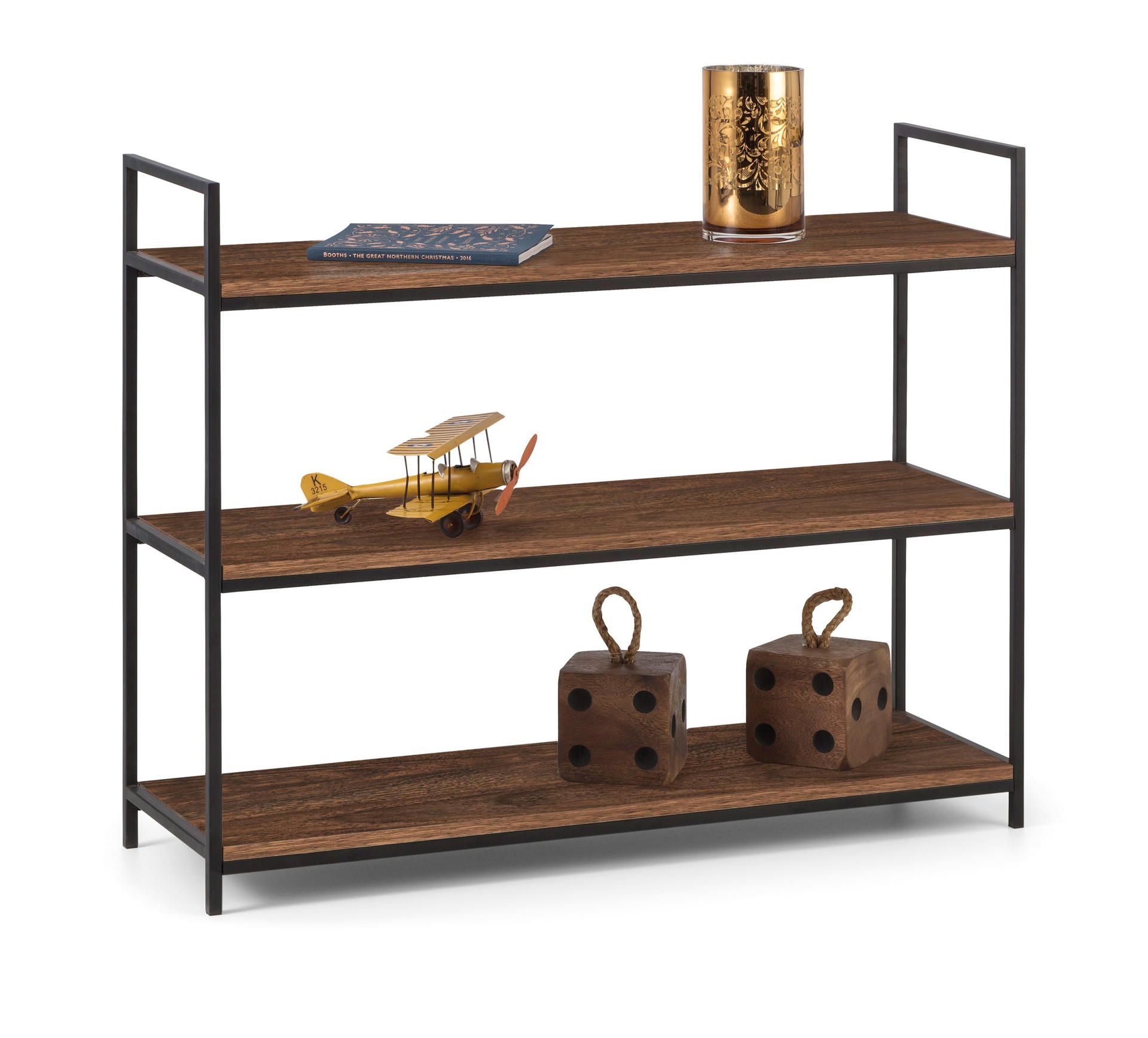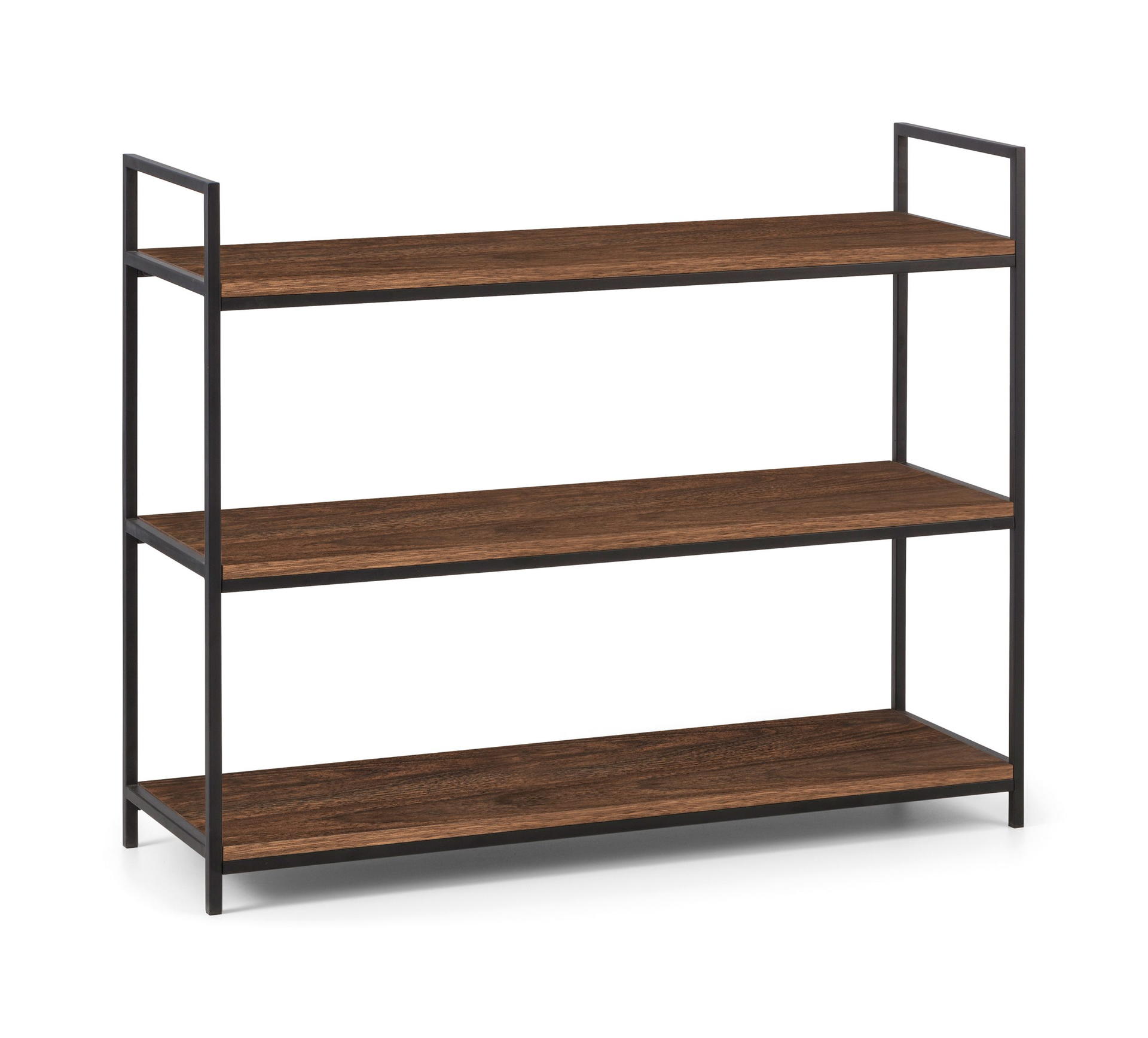 A cool, modern low bookcase designed to add a contemporary touch to any home or work place. Its simple clean lines, delineated by a subtle, black coated metal frame are complemented perfectly by a warm, walnut foil, to create a very stylish and sleek product.