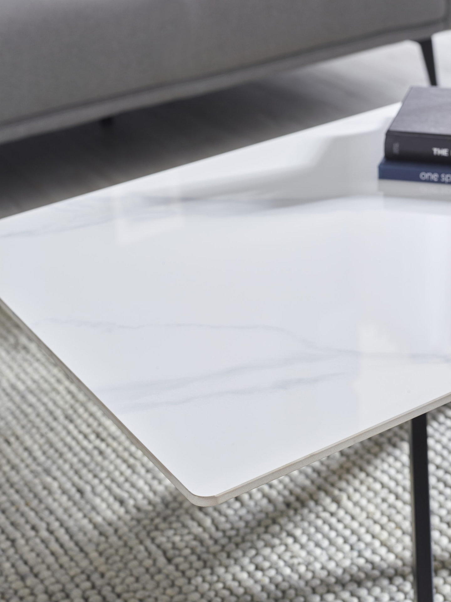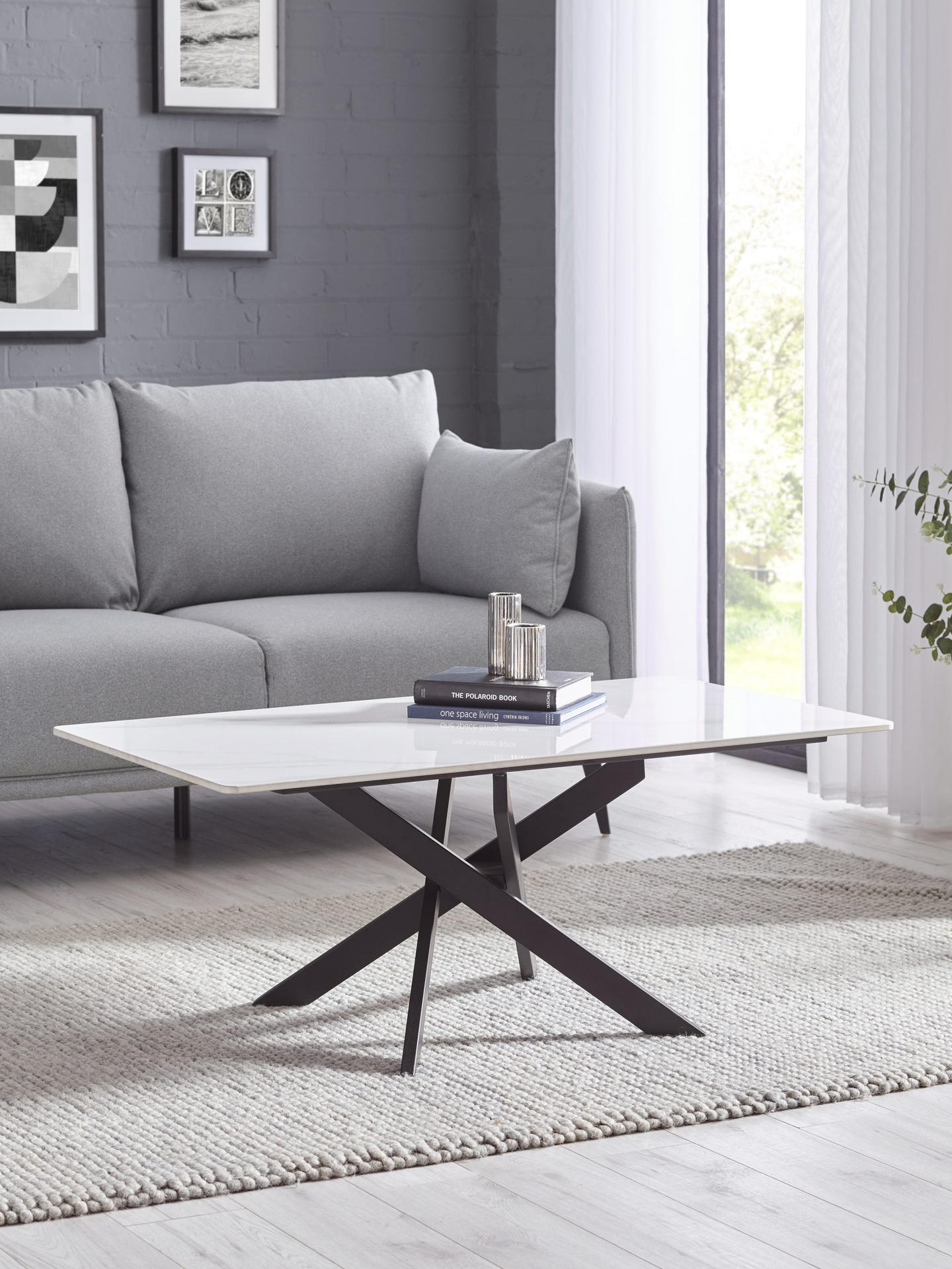 Bring sophistication to your living room with the Bradley White Marble Coffee Table. The luxurious ceramic top, with its beautiful Italian white marble effect, creates a striking focal point in any space. Supported by a durable black powder-coated steel spider-shaped leg design, offering both strength and style. Perfect for showcasing decorative items or enjoying a coffee break, this table adds timeless elegance to your home. Simple assembly required, allowing for quick and easy setup.