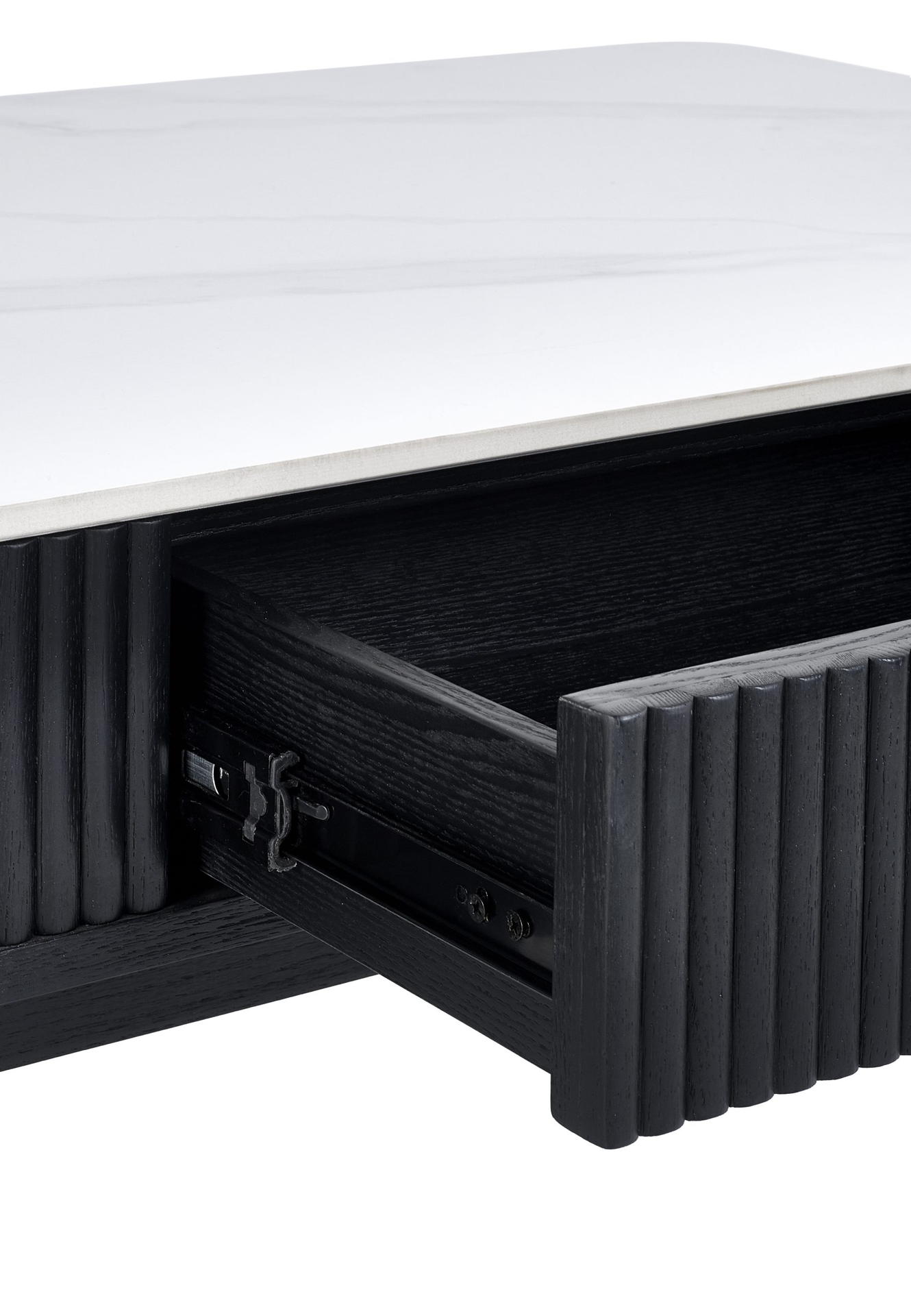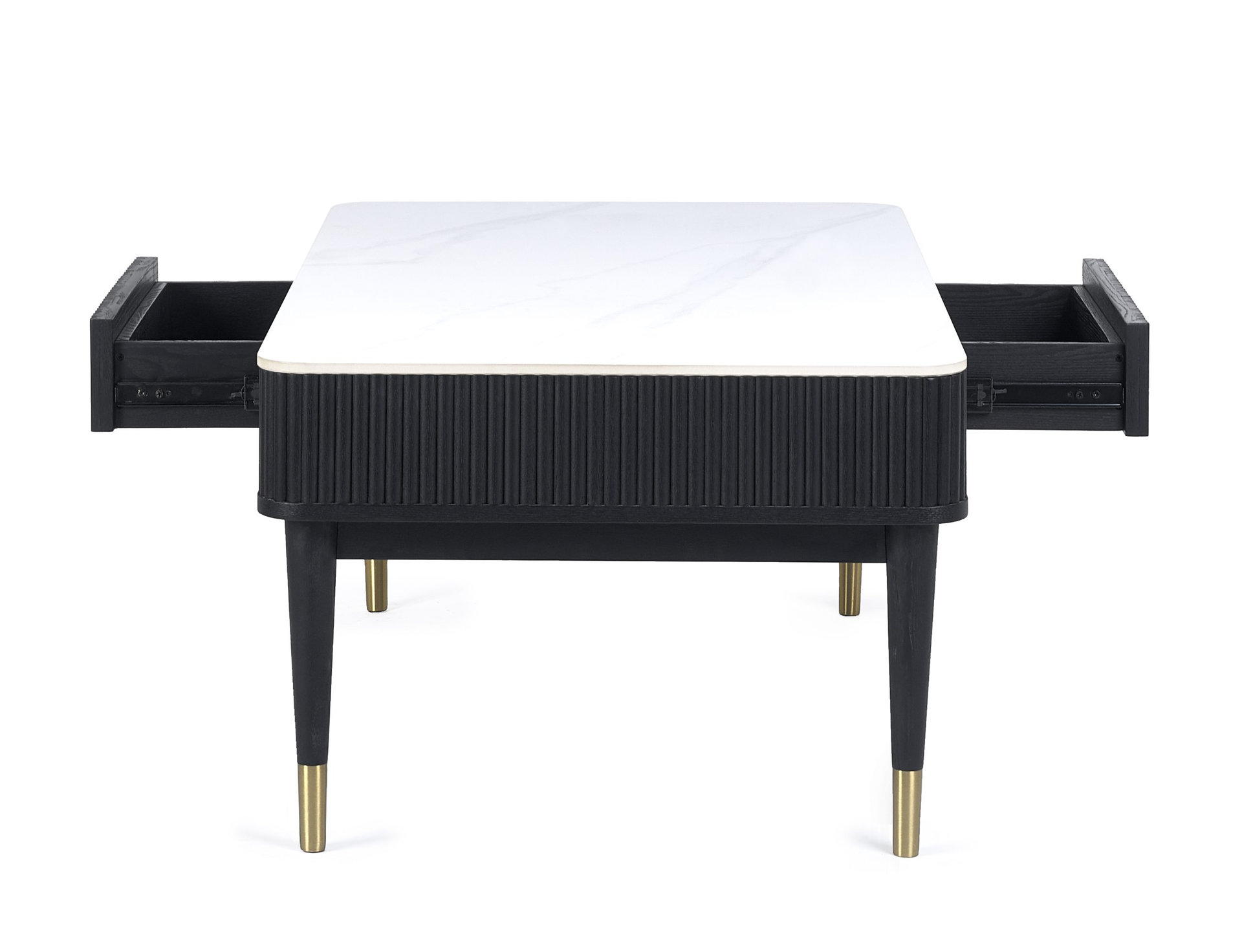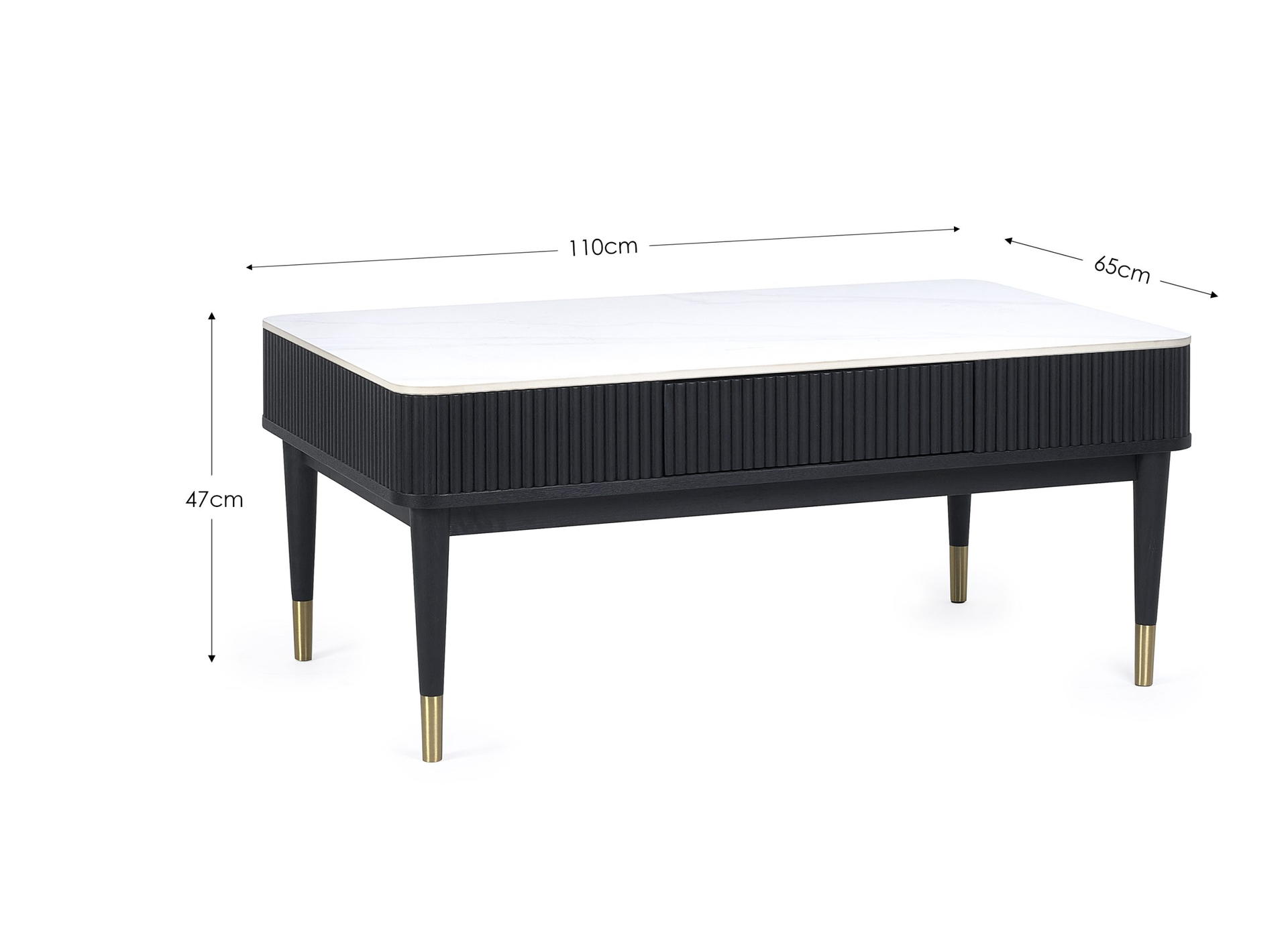 Step into luxury with the Louis Fluted Stone Top Coffee Table With 2 Drawers in Black – an enchanting addition to your living space. The captivating white stone marble effect tabletop with a chic matt black ribbed edging exudes timeless sophistication. The tapered legs, featuring elegant gold tips, elevate the table to a new level of style, making it a focal point in any room. This coffee table is designed for both aesthetic appeal and practicality, boasting two push-touch drawers that discreetly offer storage for your essentials. Minimal assembly is required, ensuring a hassle-free setup process.