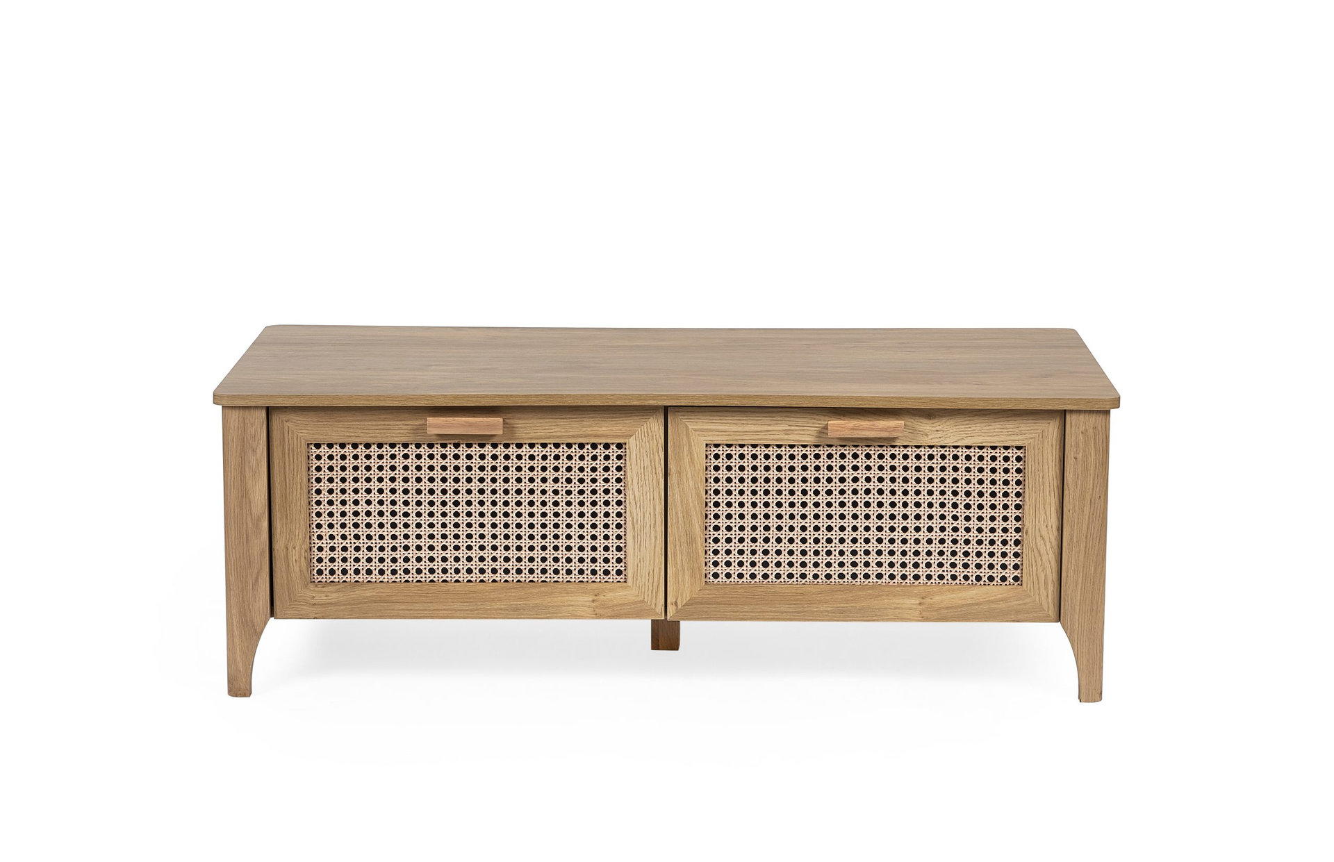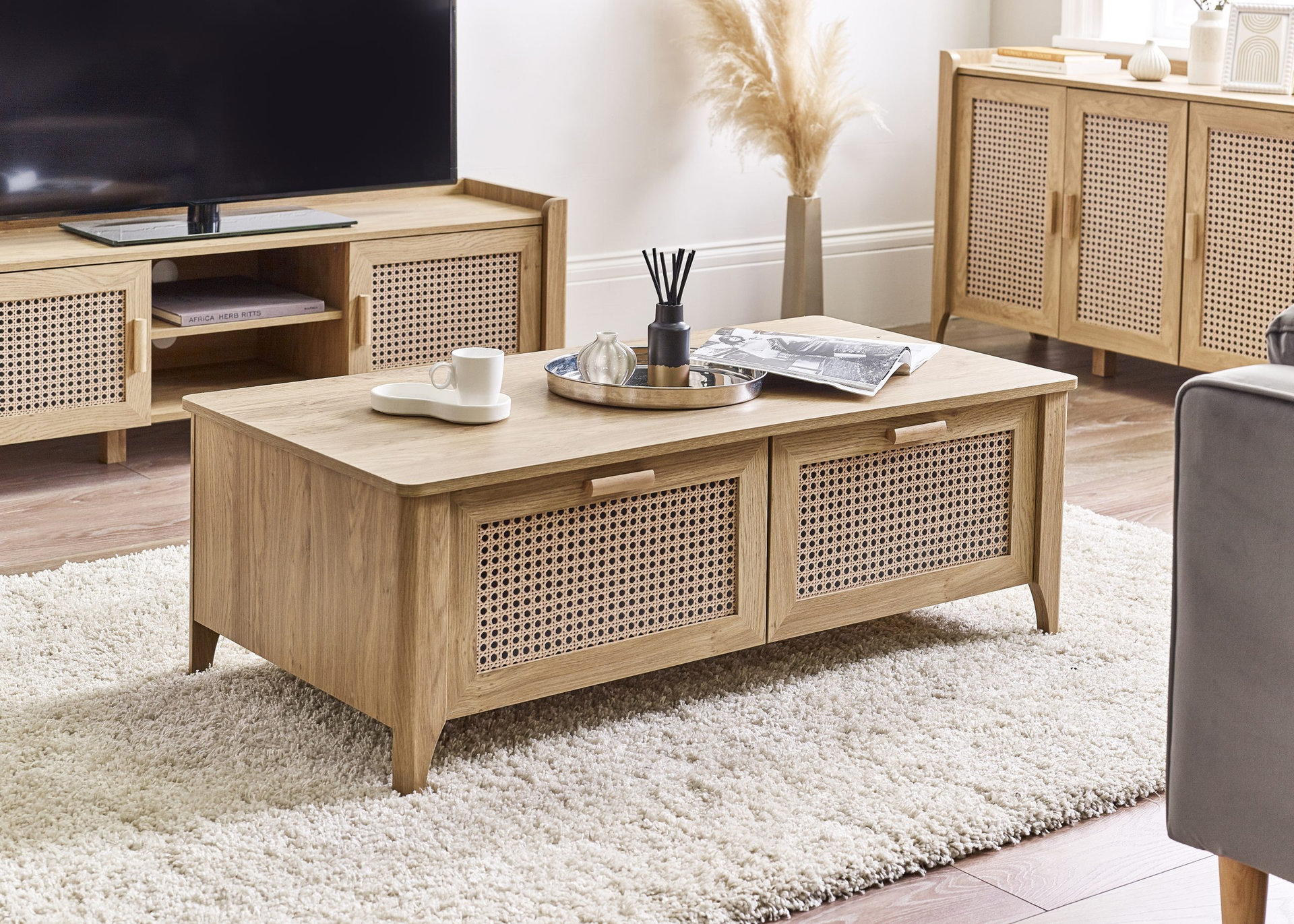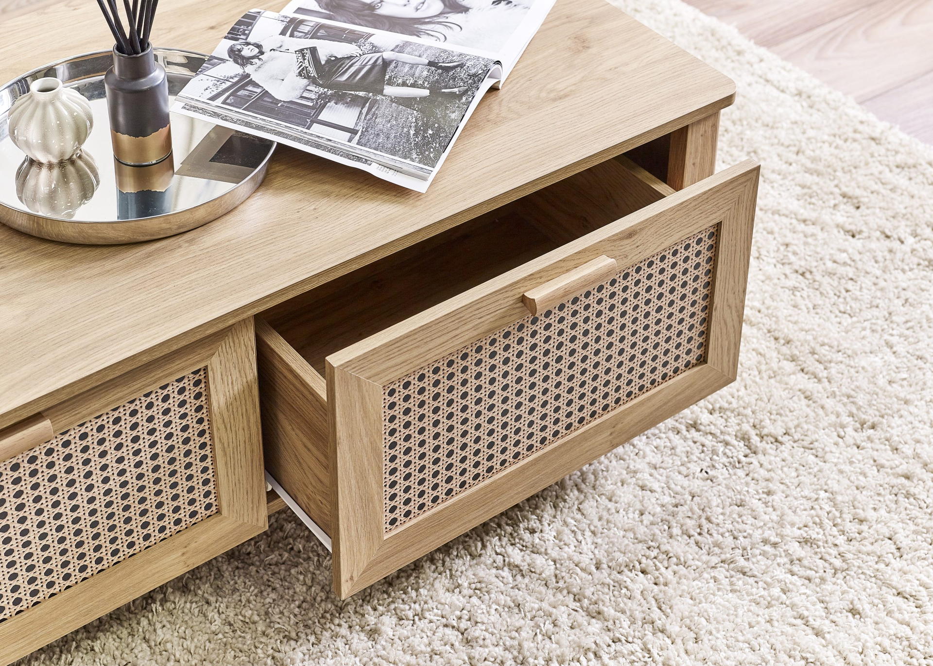 Showcasing a beautifully sleek design with a bohemian feel, the Sydney 2 Drawer Coffee Table offers exquisitely curved edging accompanied by a raised lip around the edge providing a practical addition, stunningly combined with a rattan-effect sticker front. Finished with a natural oak effect featuring two pull-out drawers to store away items discretely. All around creating the perfect airy, warm feel within your home.