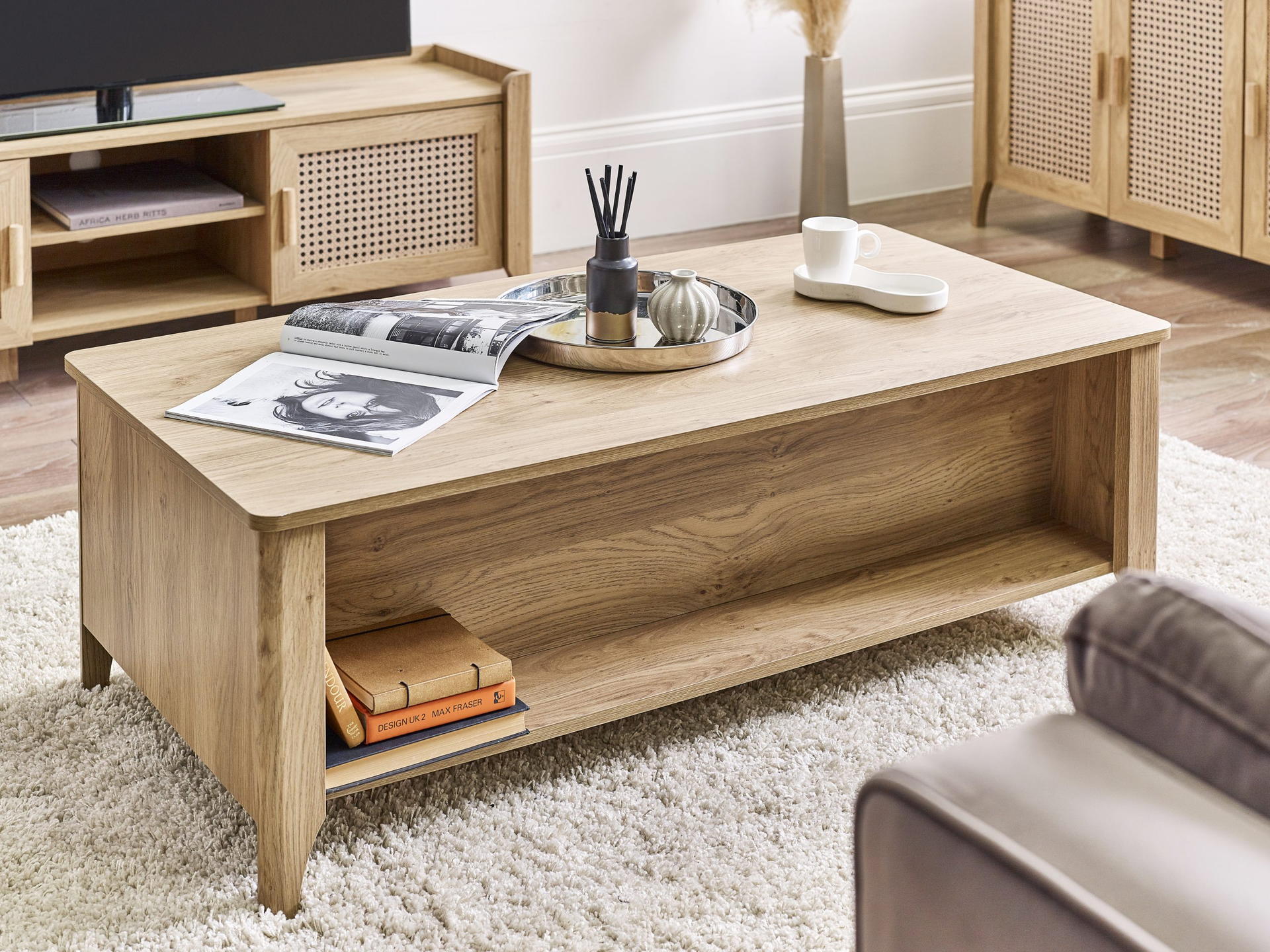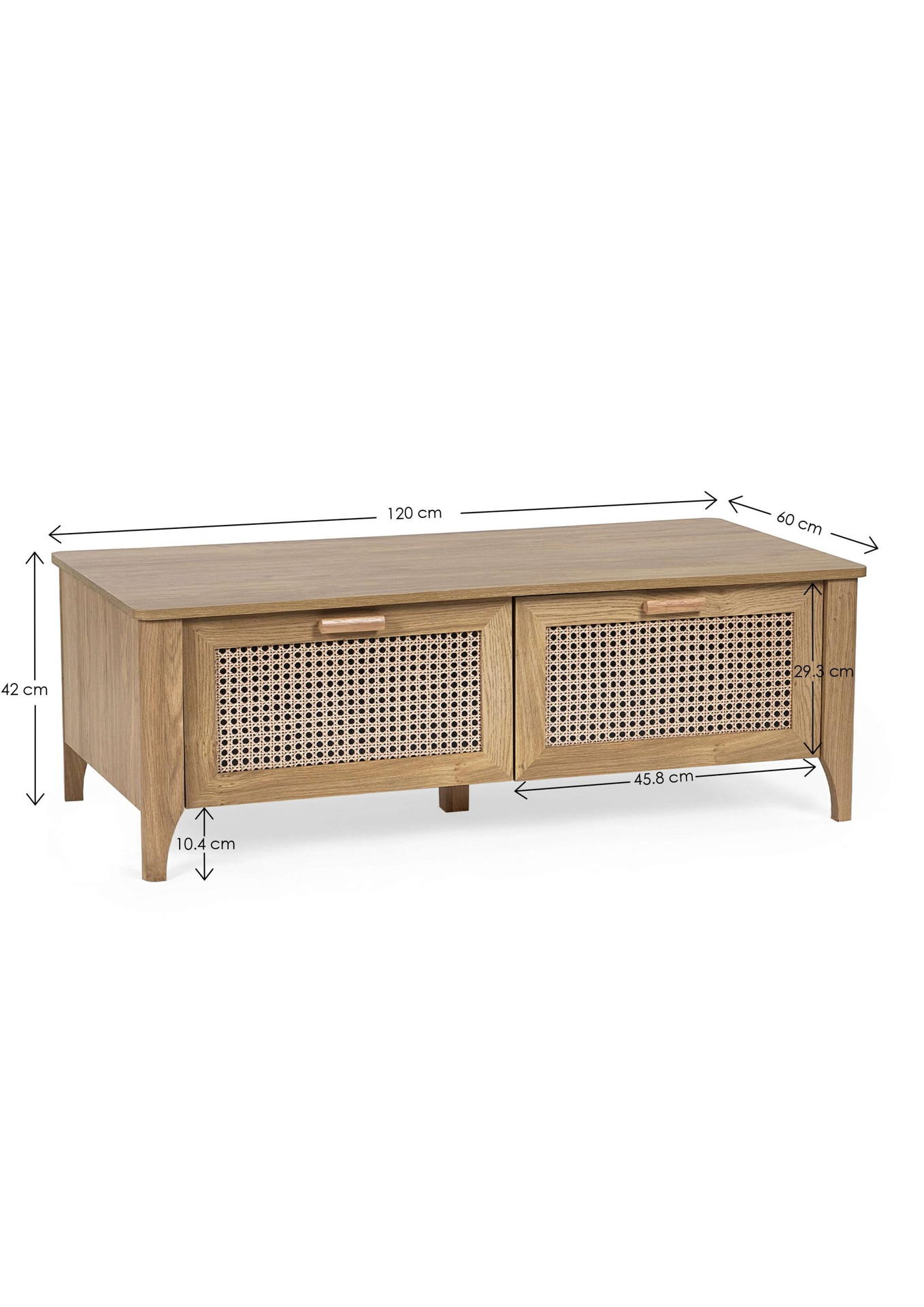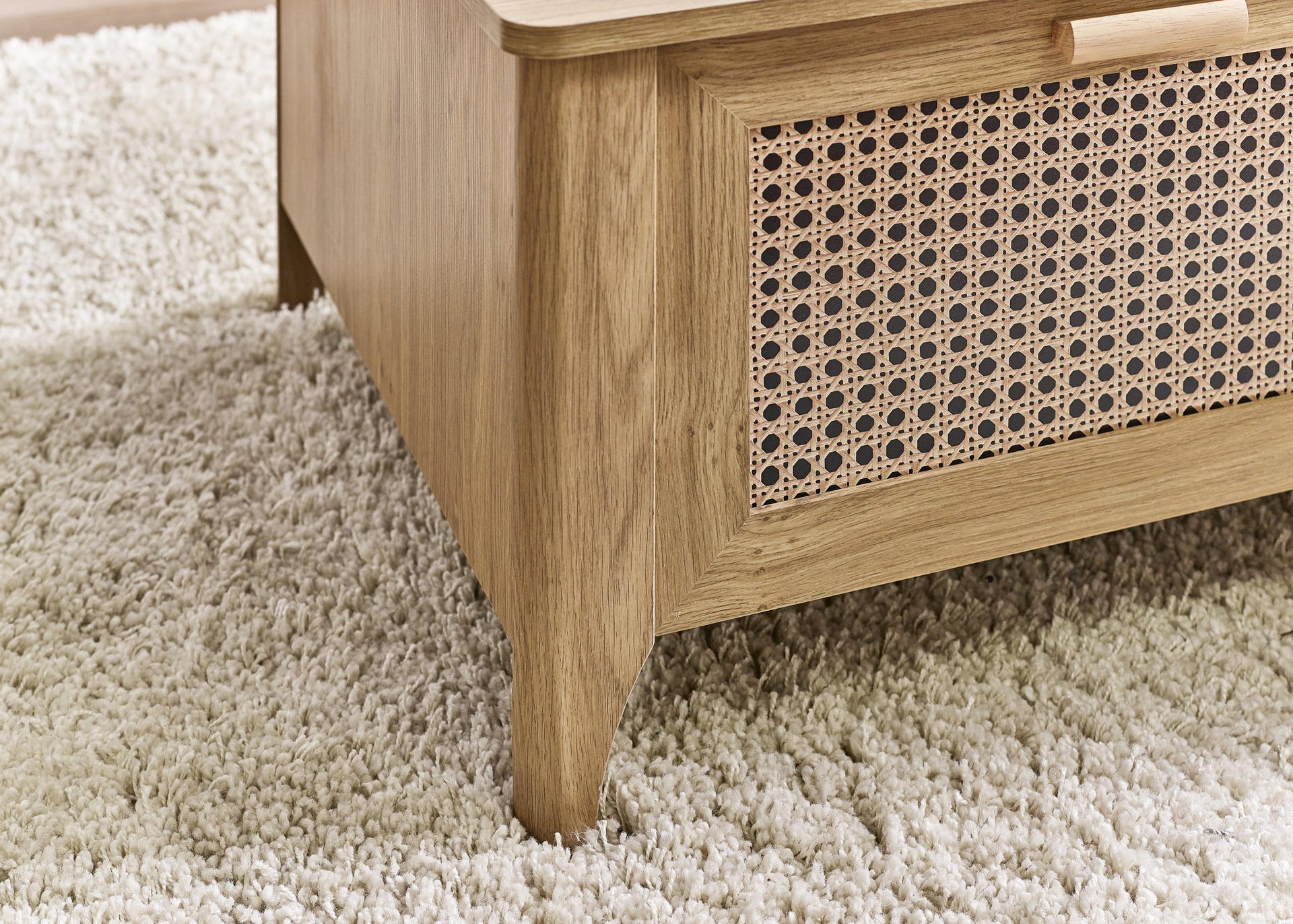 Showcasing a beautifully sleek design with a bohemian feel, the Sydney 2 Drawer Coffee Table offers exquisitely curved edging accompanied by a raised lip around the edge providing a practical addition, stunningly combined with a rattan-effect sticker front. Finished with a natural oak effect featuring two pull-out drawers to store away items discretely. All around creating the perfect airy, warm feel within your home.