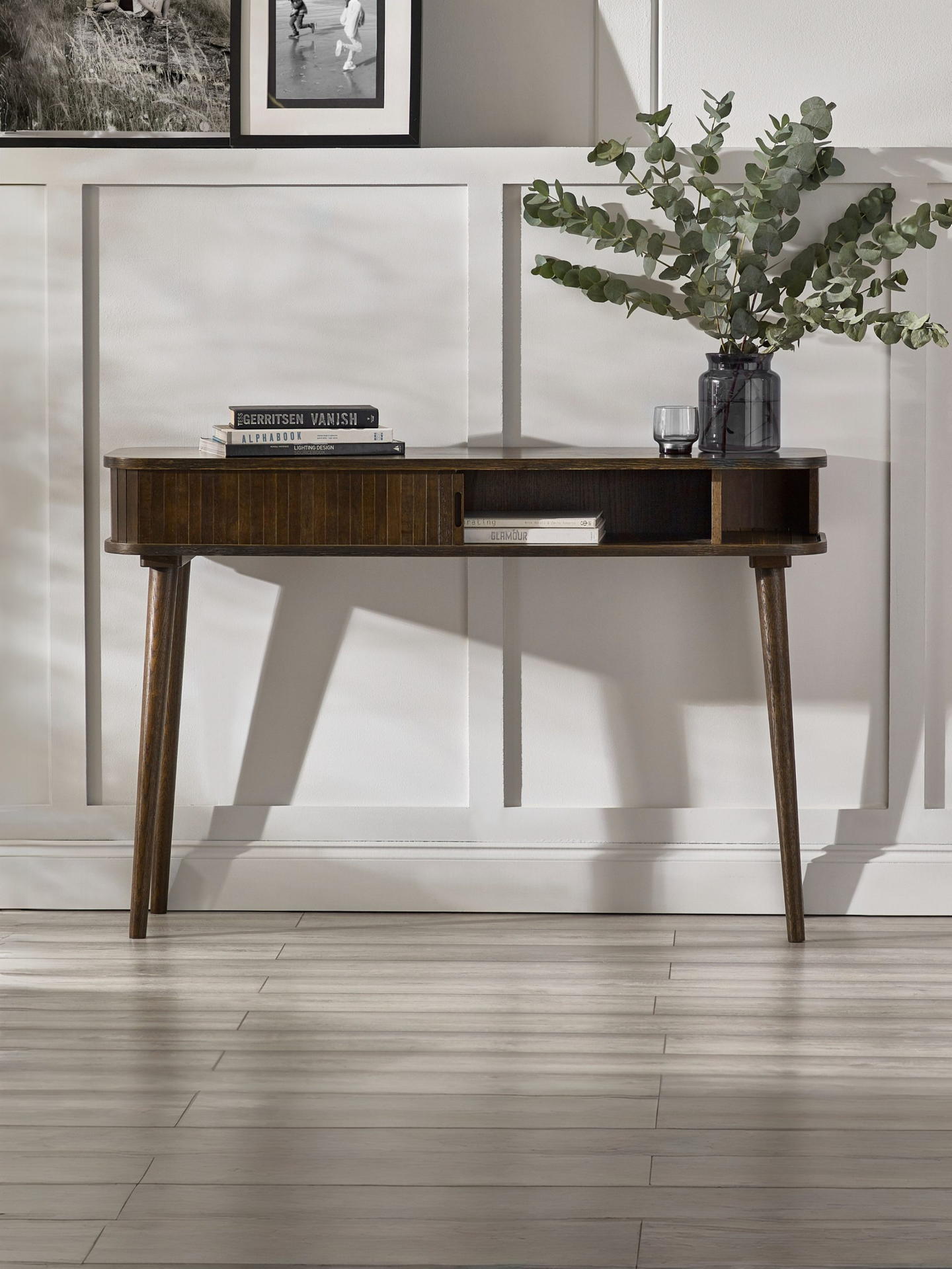 The Arya Console Table effortlessly combines style and practicality, making it an eye-catching addition to any space. Finished in a luxurious dark oak effect, its sleek, modern design features a slatted sliding tambour door that opens to reveal a spacious storage compartment in the center. Two elegantly crafted cut-out handles add a touch of sophistication, while the four Nordic tapered legs offer sturdy support with a hint of mid-century charm. Whether placed in a hallway or living room, this piece brings timeless elegance and functional storage to elevate your home. Minimal assembly required for an easy and quick setup.