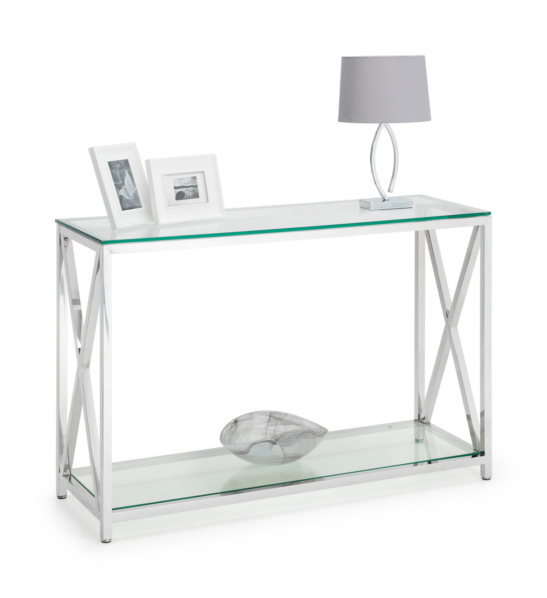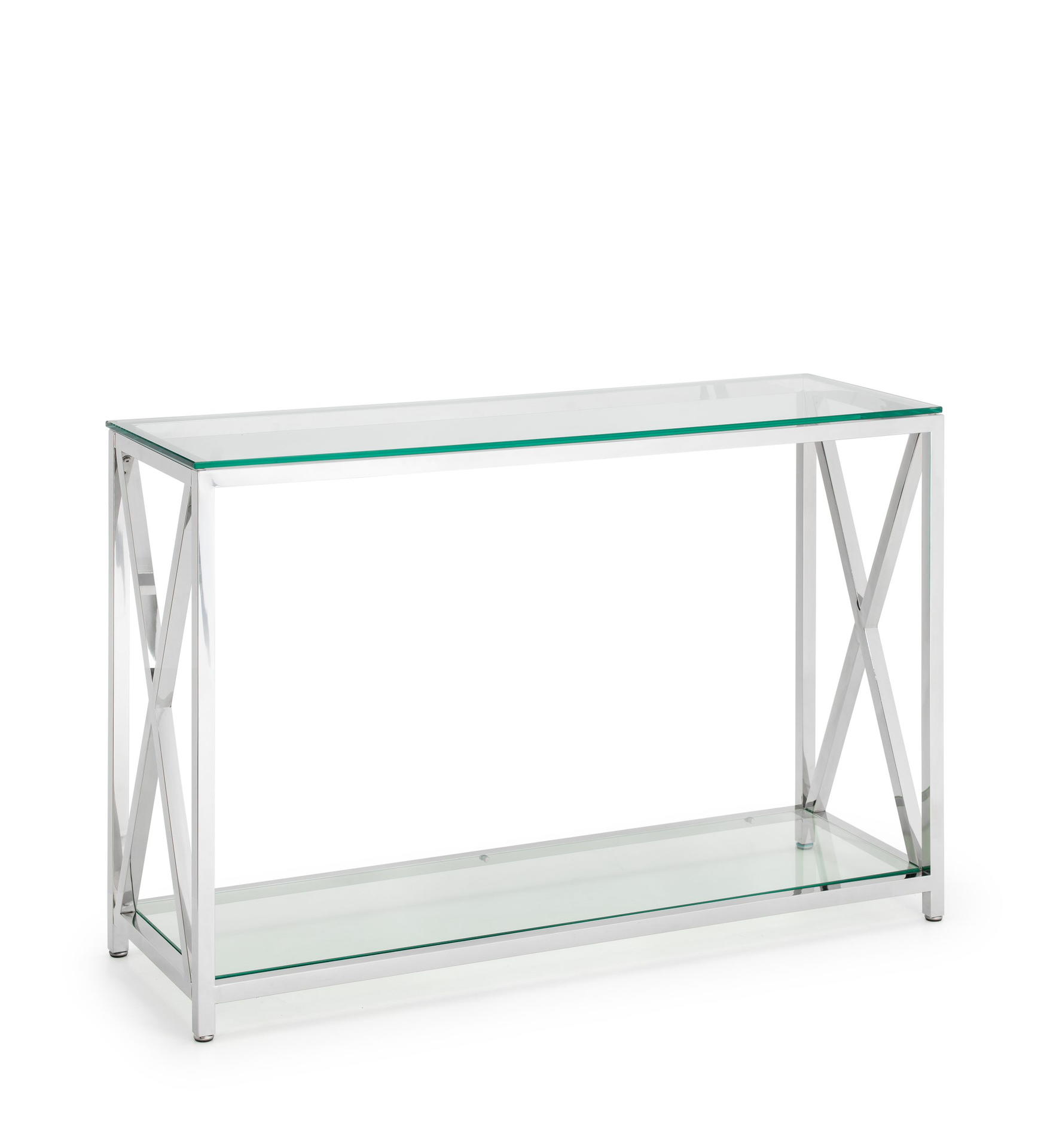 The lavish Miami occasional collection will add a touch of class and luxury to any home. Taking inspiration from the Art Deco period, the Miami features a striking cross frame design. Crafted from a high quality stainless steel frame and tempered glass, this console table provides a shelf underneath for additional storage.