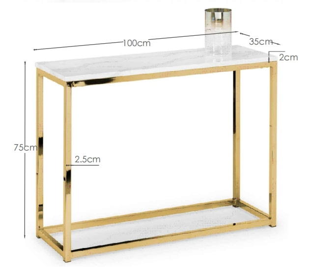 Scala is a sleek console table with chic marble effect top on a well-crafted gold coloured, stainless steel frame. It has a timeless Italian design that fits well with a wide range of decorative styles. Part of the Julian Bowen Scala Occasional furniture range.