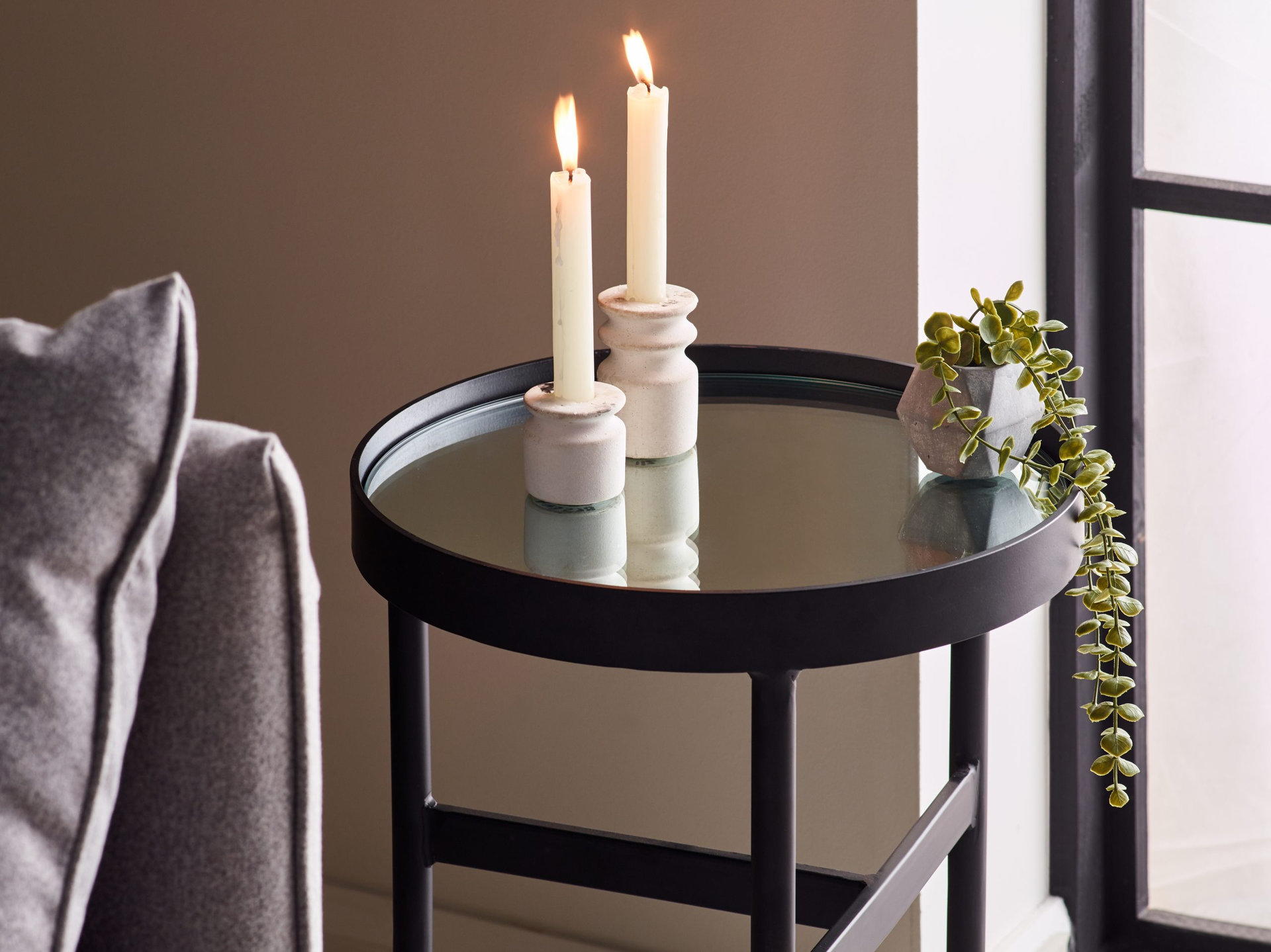 Mirrored tabletop enhances light reflection, creating a roomier atmosphere.