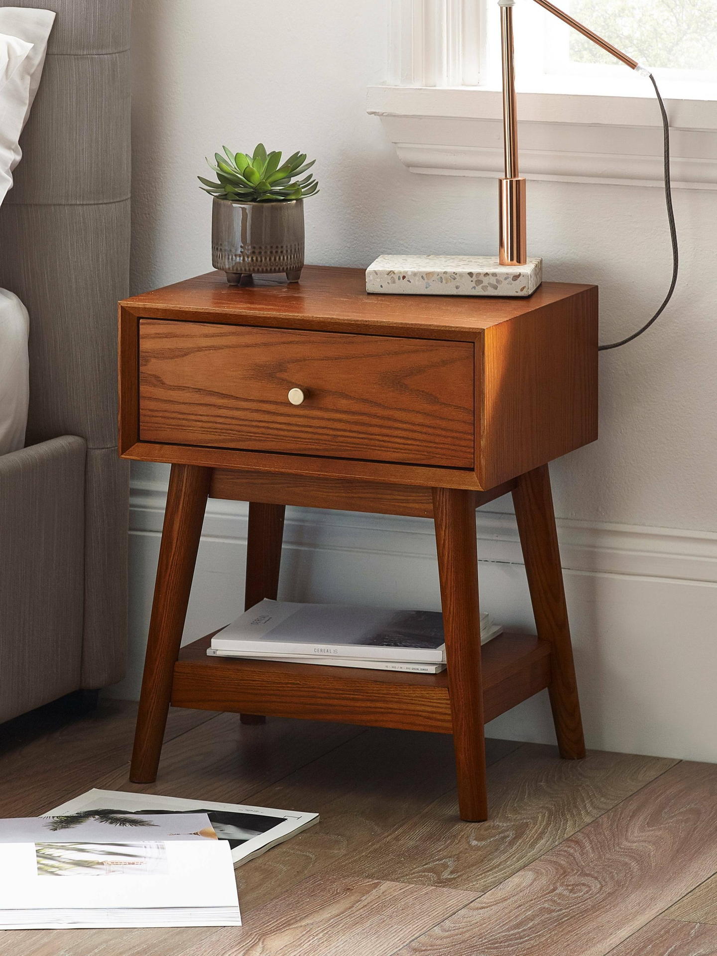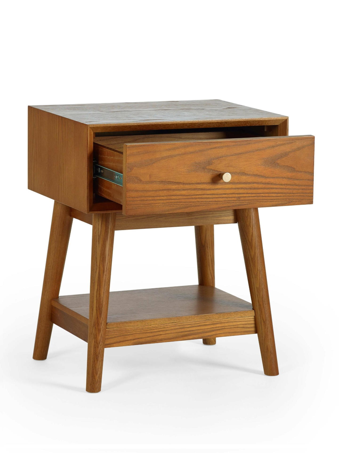 A retro-inspired style with a nostalgic feel, the Lowry 1-Drawer Side table is a gorgeous timeless design that will add character and depth to any occasional space. Constructed from an exquisite cherry ash wood veneer with beautifully tapered legs, complemented by a golden framed knob. This stunning side table features a 1 drawer with a perfect storage shelf.