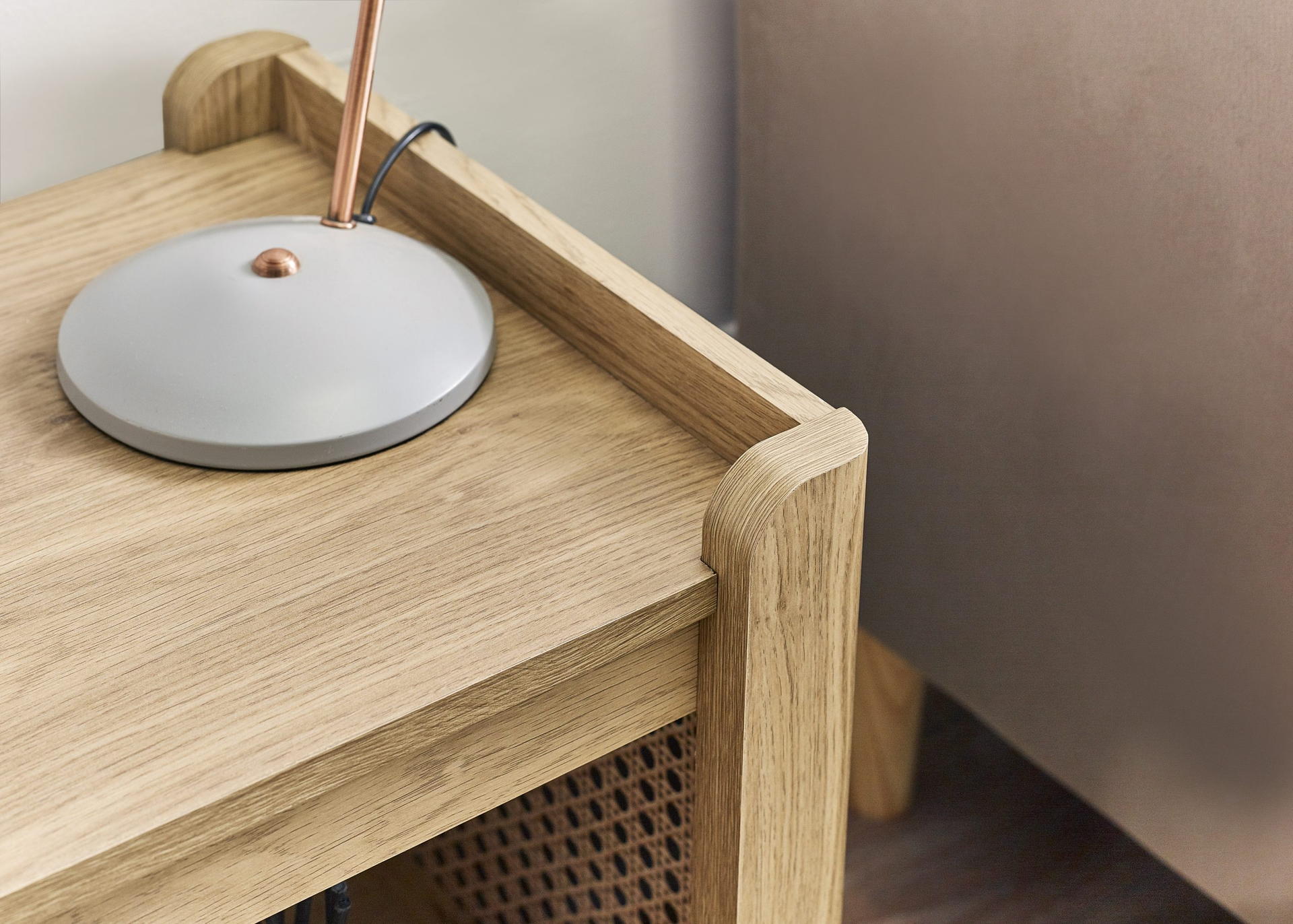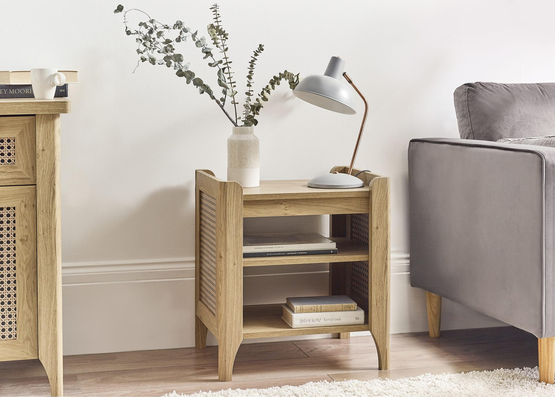 Showcasing a beautifully sleek design with a bohemian feel, the Sydney Lamp Table offers exquisitely curved edging accompanied by a raised lip around the edge providing a practical addition, stunningly combined with a rattan-effect sticker front. Finished with a natural oak effect featuring a removable shelf allowing you to store key essentials both on the top and bottom of the table. All around creating the perfect airy, warm feel within your home.