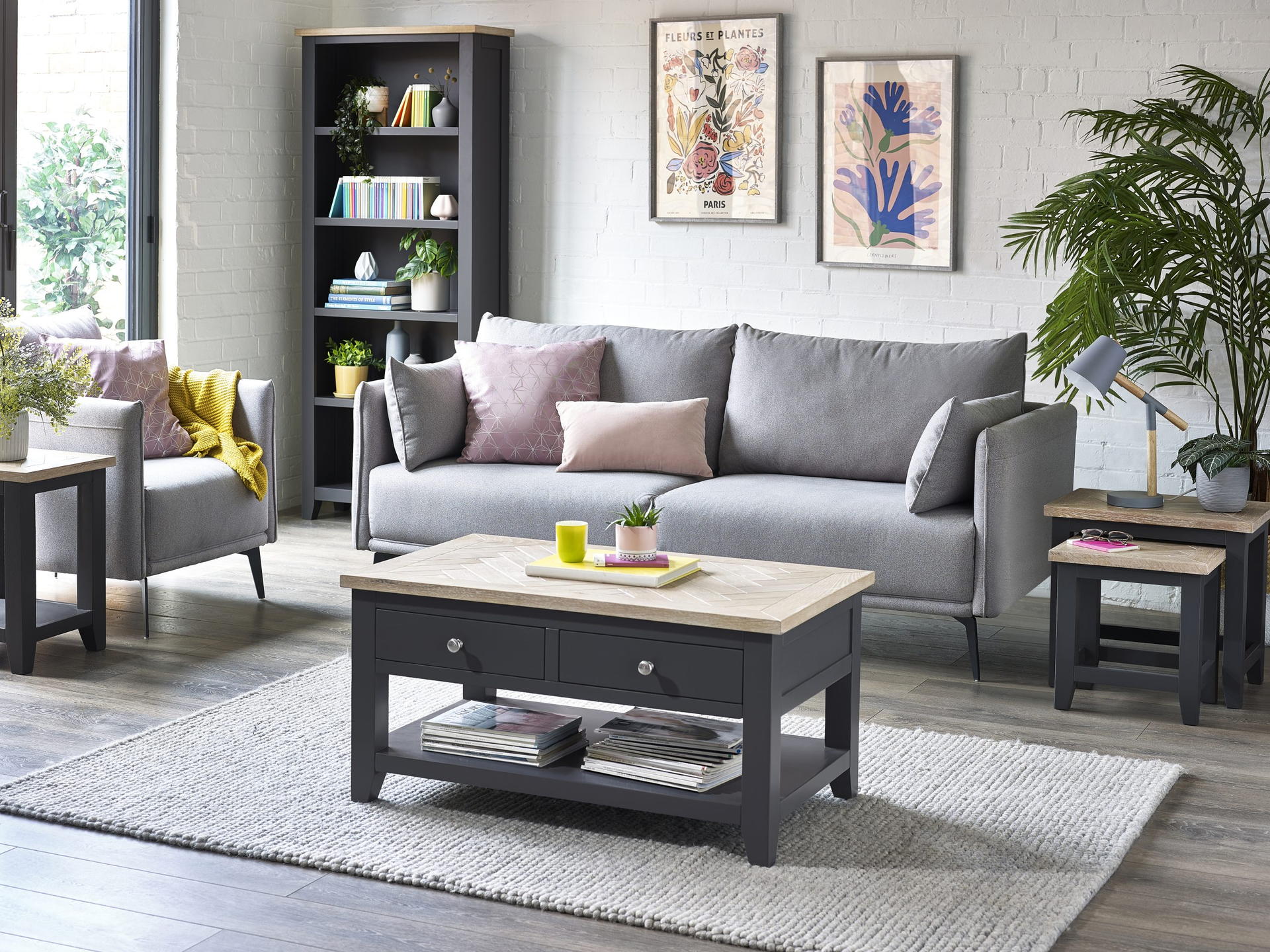 Designed exquisitely, the Bordeaux collection is finished in a beautiful grey shade that will complement various existing décor styles. The parquet detailing leaves an elegant and rustic feel – the perfect way to make your house feel like a home. The gorgeous collection includes an extending dining table, dining chair, coffee table, sideboard, lamp table, nest of tables, tv unit, and tall bookcase.