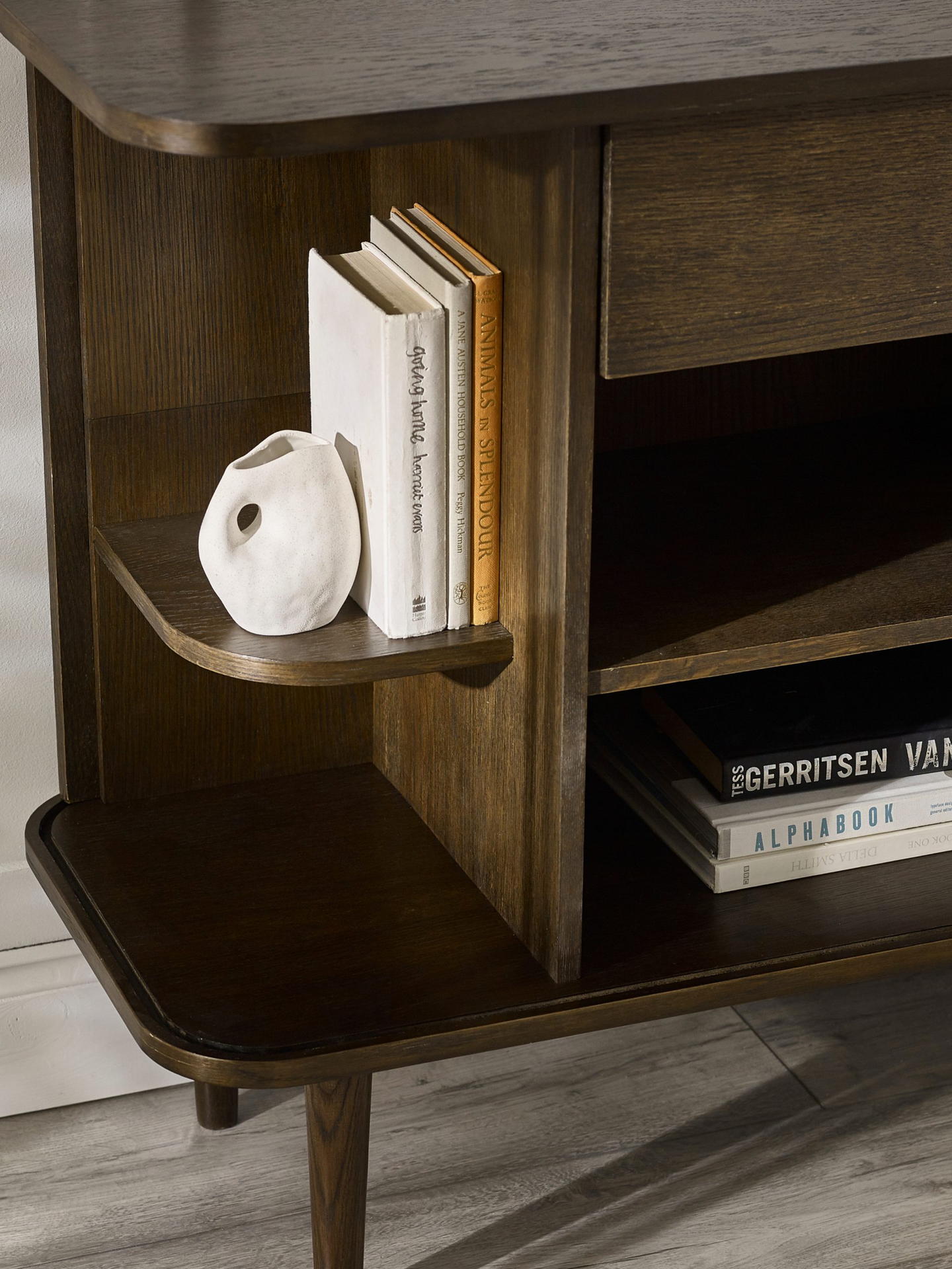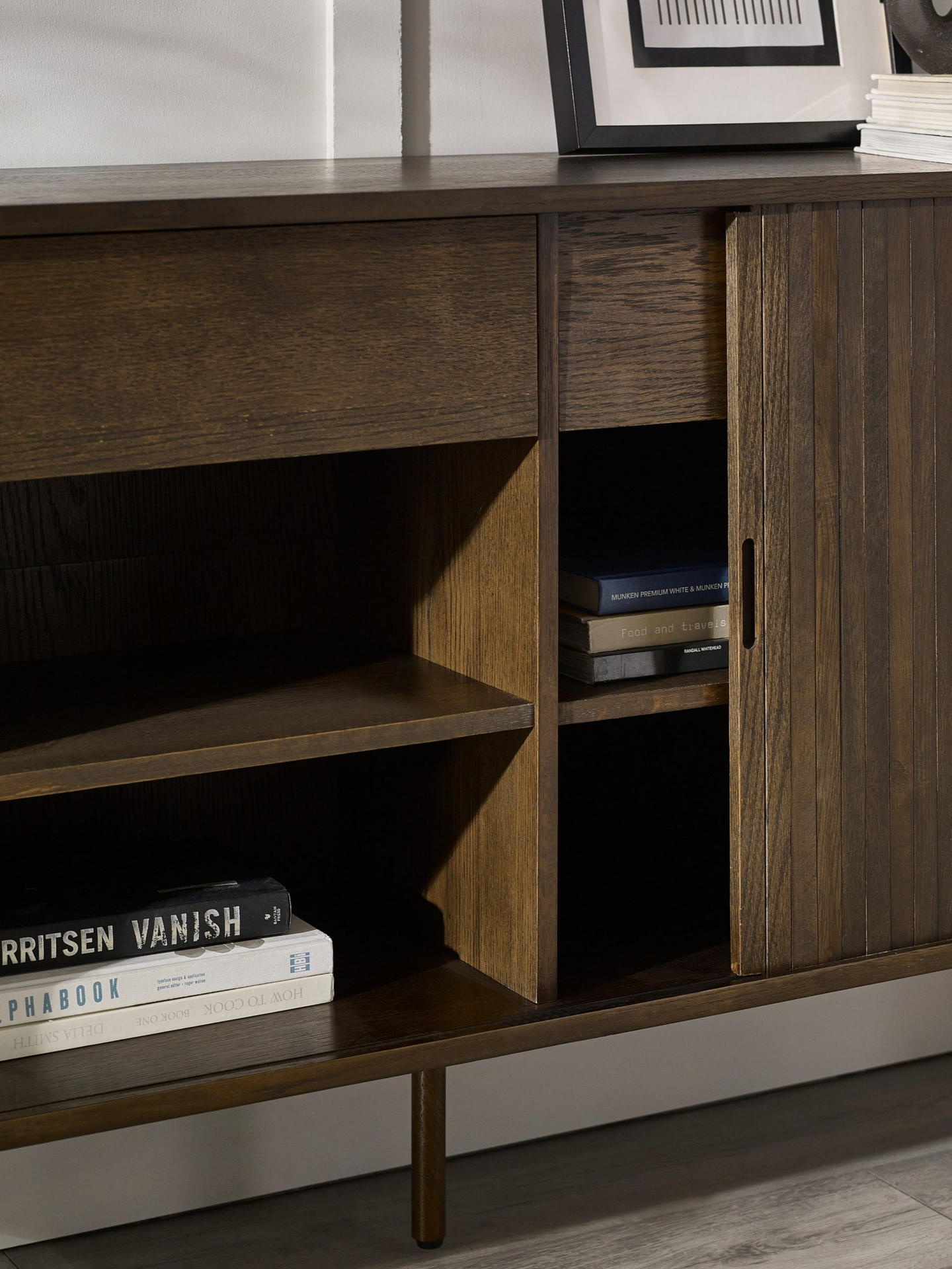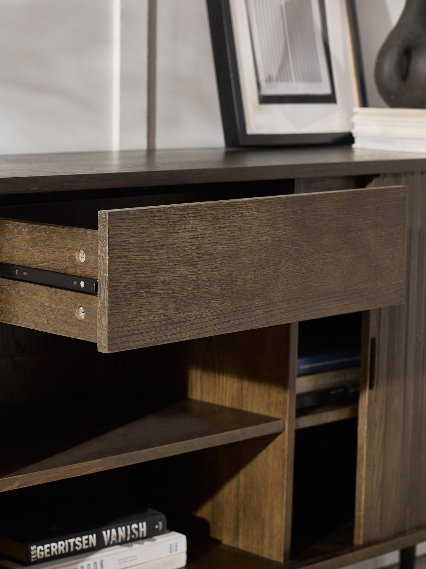 Discover the epitome of luxury and functionality with the Arya Sideboard, a statement piece that combines timeless elegance with modern design. Finished in a rich dark oak effect, its slatted sliding tambour doors reveal two push-out drawers and four central shelves, with additional storage in four smaller side shelves. Featuring sleek cut-out handles and four Nordic tapered legs, adding a touch of mid-century charm to any space. Perfect for elevating your living or dining room. Minimal assembly required for quick and effortless setup.