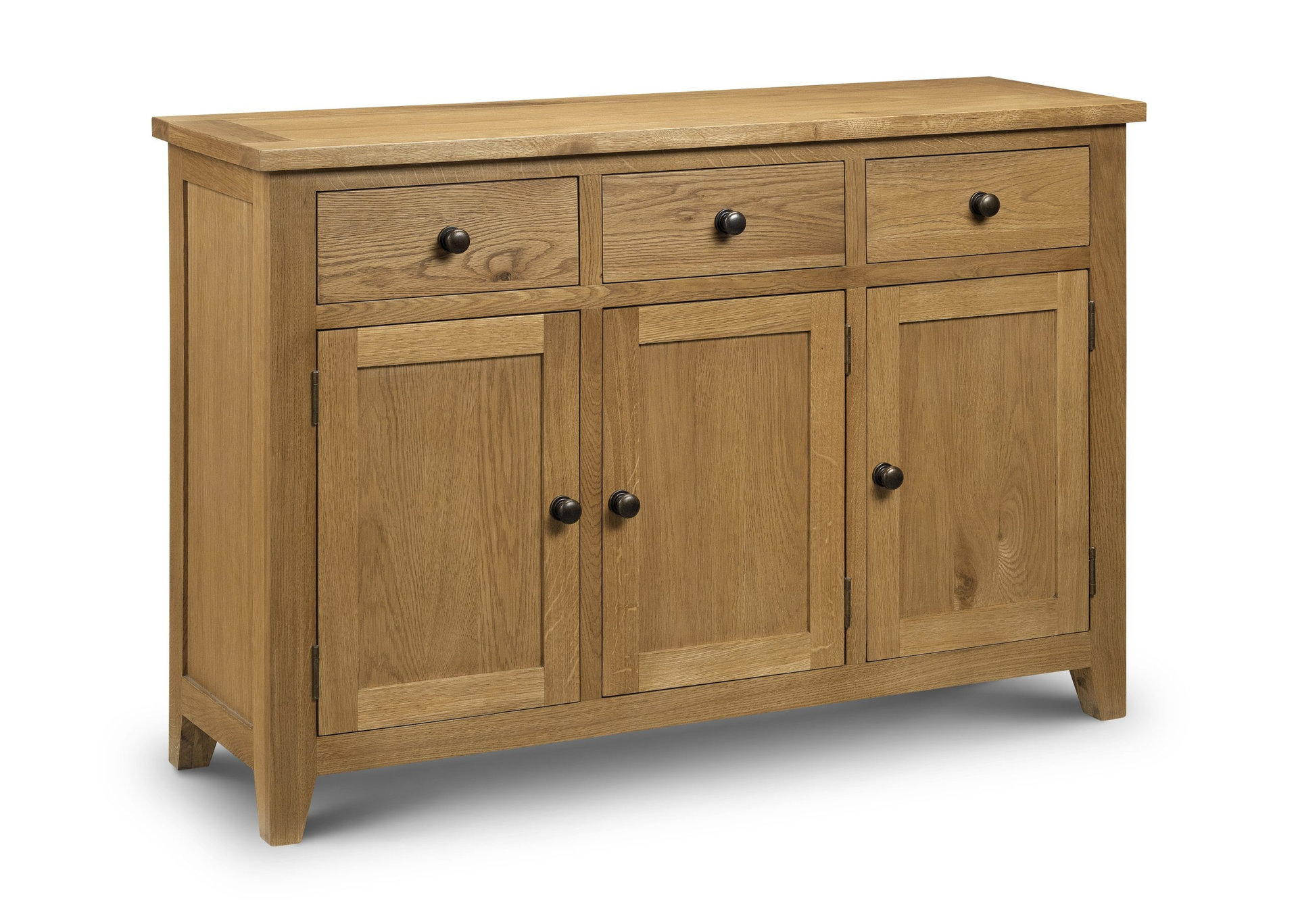 The Astoria Sideboard is crafted from White Oak and Oak Veneers with a durable waxed finish. The perfect storage unit for the modern living or dining room, incorporating 3 drawers above a double and single cupboard space. A timeless design with chunky tops that complements contemporary and traditional interior styles equally well. With a range of coordinating furniture from the Julian Bowen Astoria range to create a warm, traditional feel in your home.