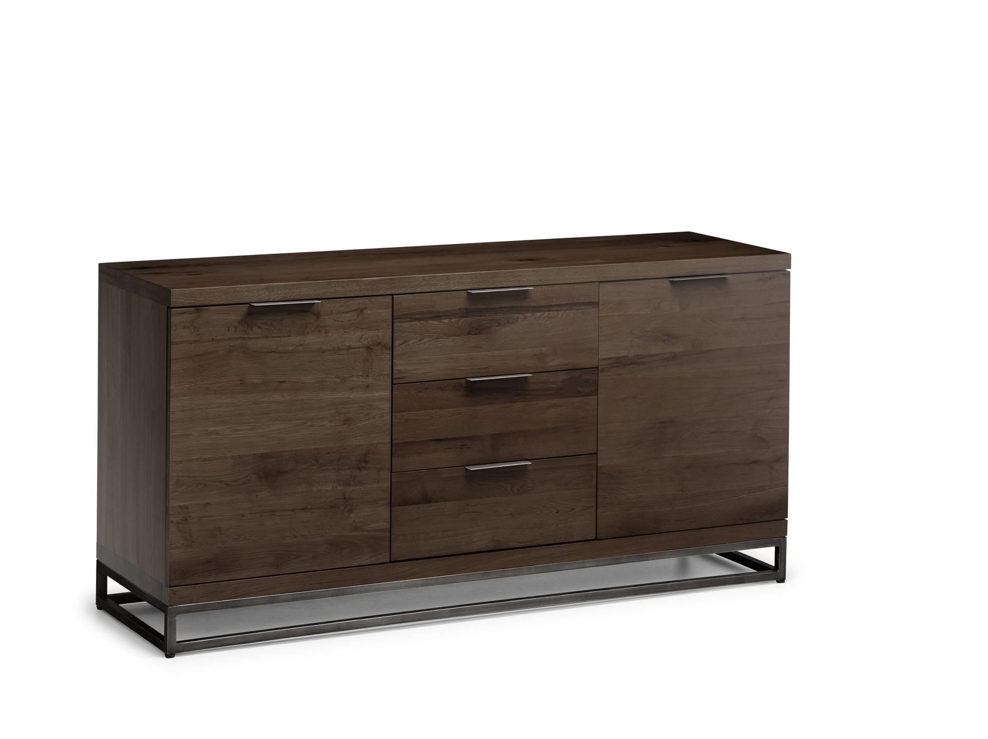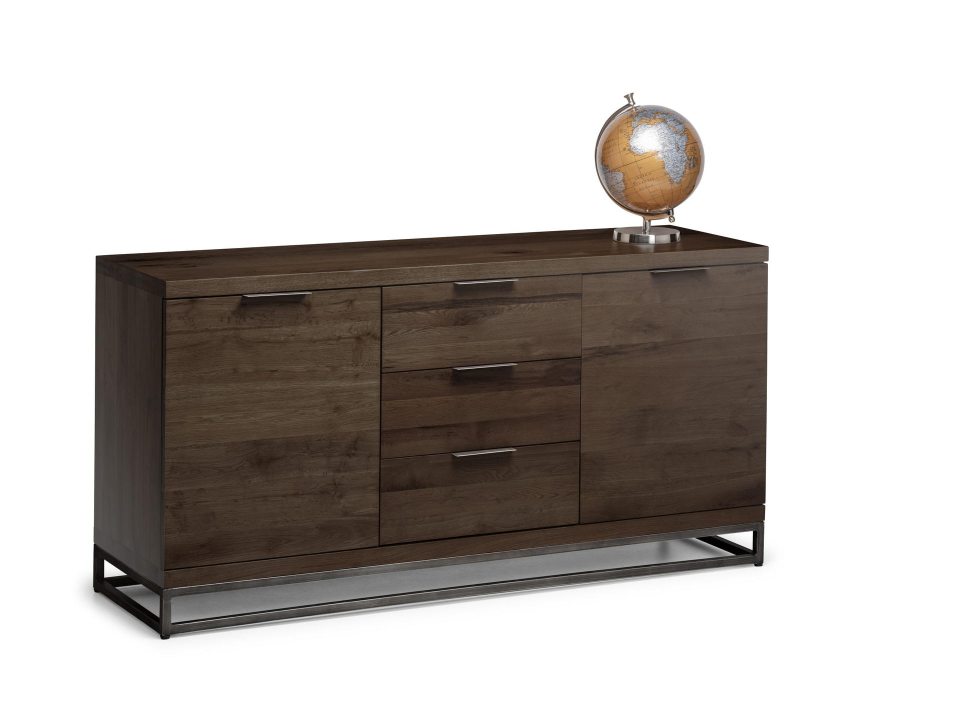 Made from solid oak, this Sideboard offers a rustic dark oak finish emphasising the stunning natural wood grain. The Brooklyn Sideboard offers a vintage edge featuring industrial style metal legs. Featuring two spacious cupboards with shelves, and three drawers, this sideboard is perfect for a wide range of modern decor. Part of the Julian Bowen Brooklyn Dining and Occasional Collection.