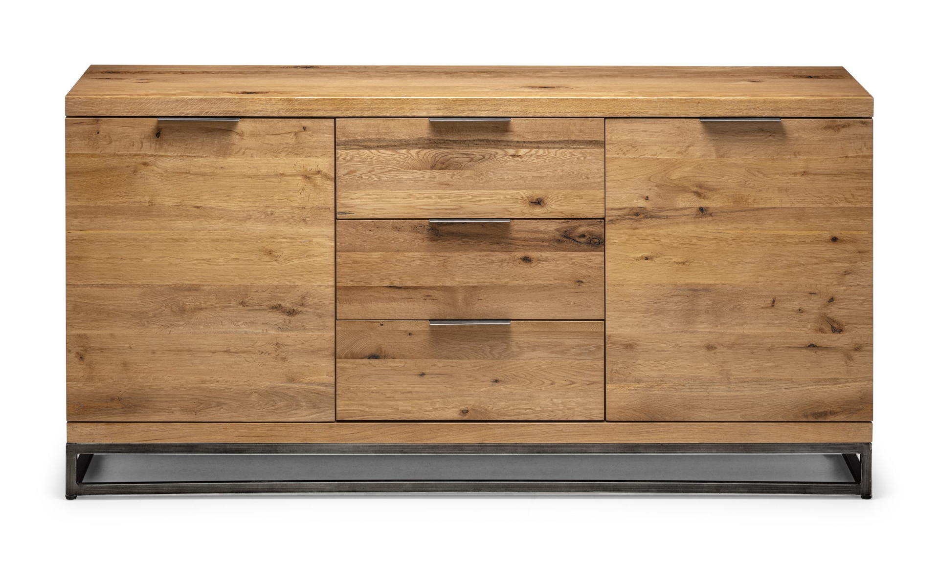 Made from solid oak, this Sideboard offers a rustic finish emphasising the stunning natural wood grain. The Brooklyn Sideboard offers a vintage edge featuring industrial style metal legs. Featuring two spacious cupboards with shelves, and three drawers, this sideboard is perfect for a wide range of modern decor. Part of the Julian Bowen Brooklyn Dining and Occasional Collection.