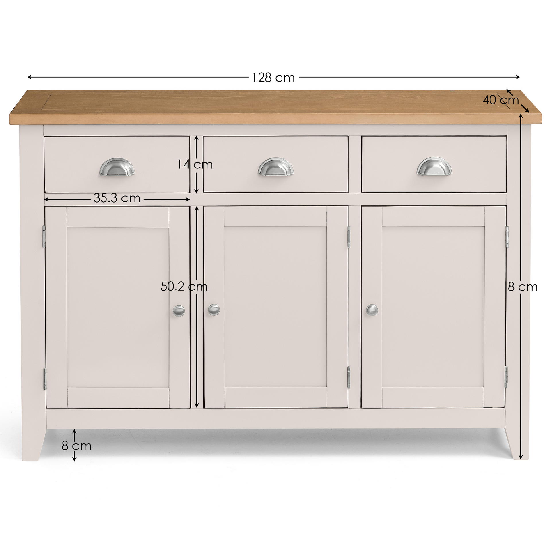 An elegant Sideboard, presented in an immaculate painted, soft Elephant Grey finish with beautiful pale oak top, crafted from a combination of high grade White Oak solids and veneers. This stylish piece looks beautiful and offers phenomenal storage for kitchen, living or dining room. Includes three practical drawers above a double and single cupboard space, accented with chic cupped handles in a brushed steel finish; ideal for cutlery , crockery and glassware. The combination of superior quality materials and classic design ensures a timeless appeal and fits perfectly alongside both traditional and contemporary decor. Part of the extensive Richmond Dining and Occasional furniture range from Julian Bowen.