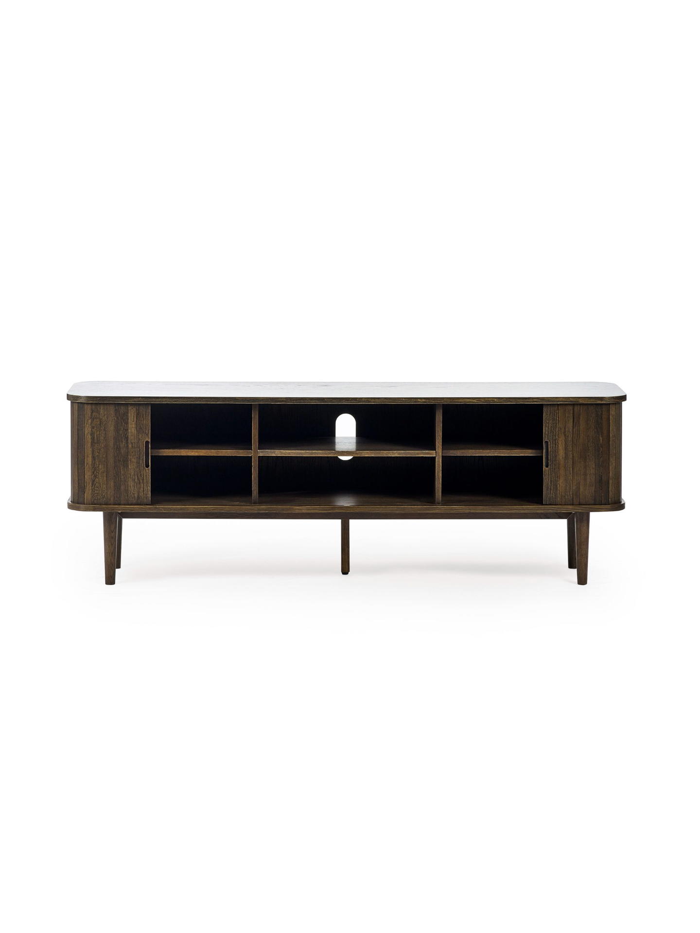 Make a statement in your living space with the Arya Media Unit, combining both style and functionality. Crafted in a rich dark oak effect with striking slatted sliding tambour doors. Inside, you’ll find ample storage with six shelves and additional smaller side shelves—ideal for organizing CDs, DVDs, game boxes, and displaying decorative pieces. The two cut-out handles and four sleek Nordic tapered legs add a modern touch, elevating the look of any room. Whether you’re tidying up or showcasing your favorite items, this versatile piece offers the perfect blend of design and practicality. Simple assembly required to have it functional and ready quickly.
