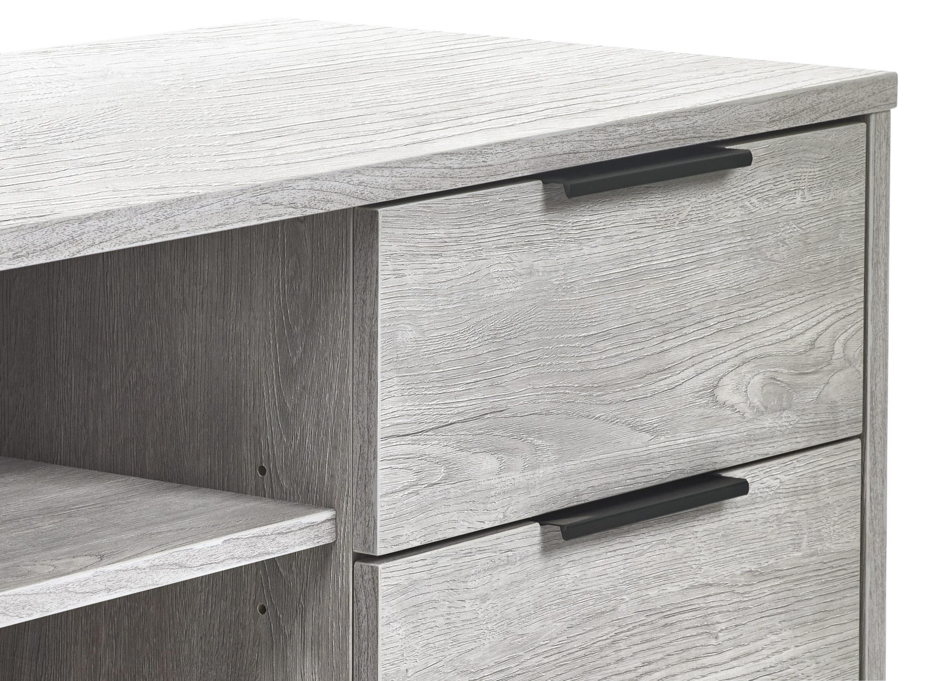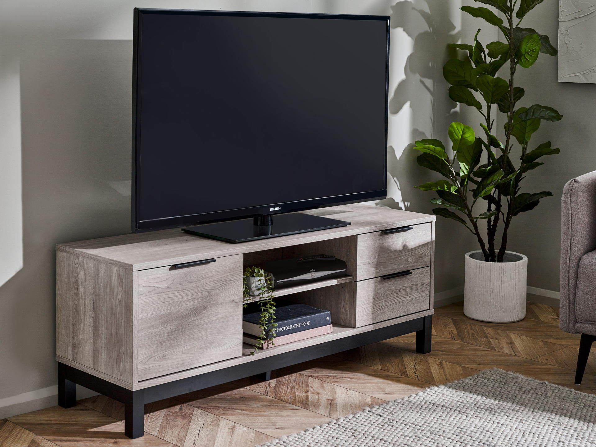 Discover the seamless blend of style and simplicity with the Bali TV Unit in Grey Oak. Crafted using revolutionary click furniture technology, this unit seamlessly combines high-quality craftsmanship with effortless assembly. The modern grey oak finish, complemented by contrasting black legs and handles, brings a classic industrial aesthetic to your living room. Featuring a spacious cupboard and two pull-out drawers for organised storage, along with center shelving for additional storage and display options.