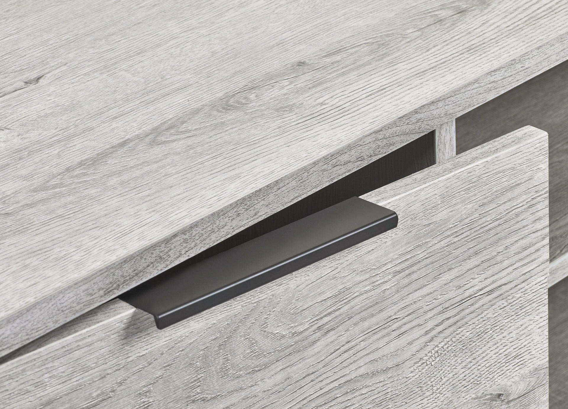 Finished in a stylish grey oak with a classic industrial aesthetic, enhanced by contrasting black legs and handles.