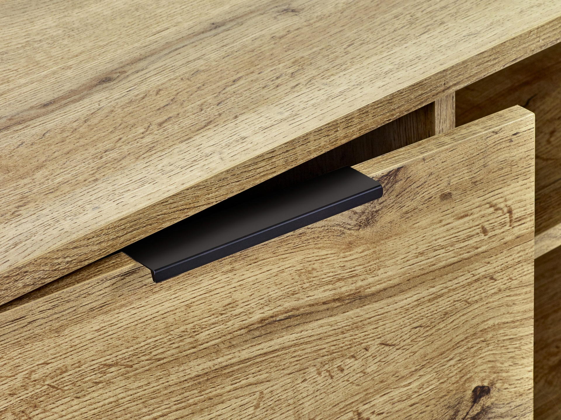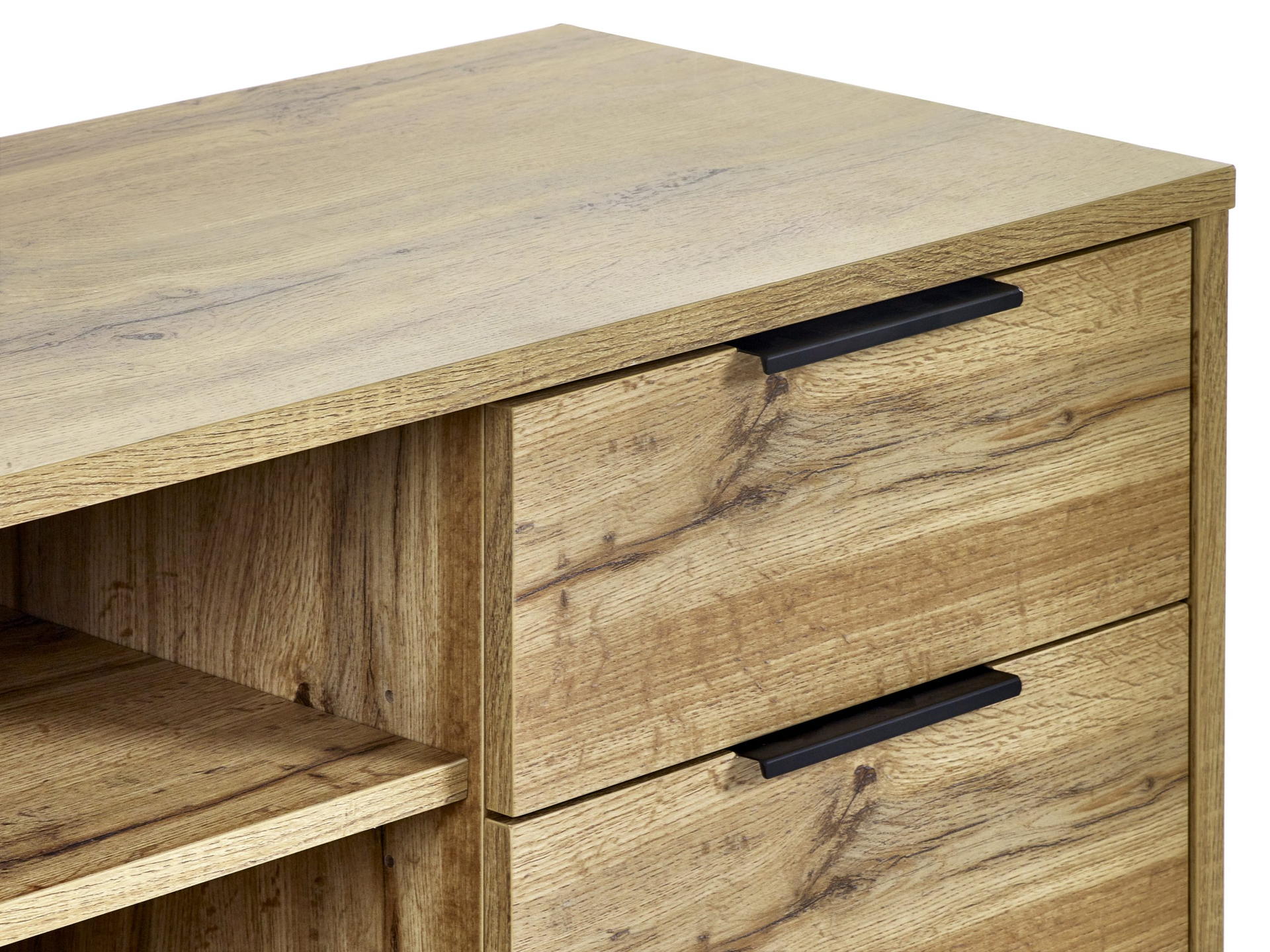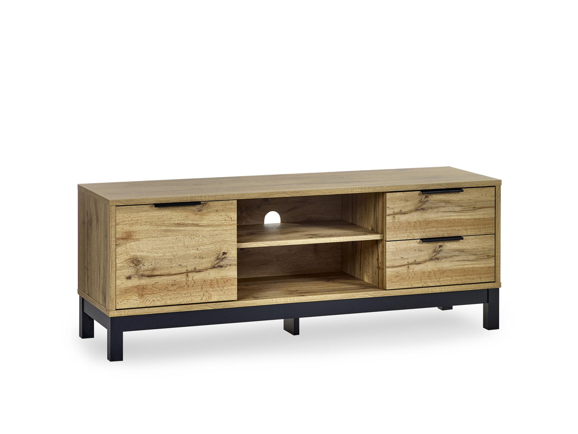 Transform your living space with the Bali TV Unit in Oak, where style meets functionality seamlessly enhanced by revolutionary click furniture technology. The modern oak finish, complemented by contrasting black legs and handles, brings a classic industrial charm to your bedroom. Crafted with precision and using high-quality materials, this unit ensures both durability and low-maintenance upkeep, making it a practical and stylish addition to your interior. With a spacious cupboard and two pull-out drawers, it offers ample storage for all your media essentials, creating an organised and aesthetically pleasing entertainment hub.