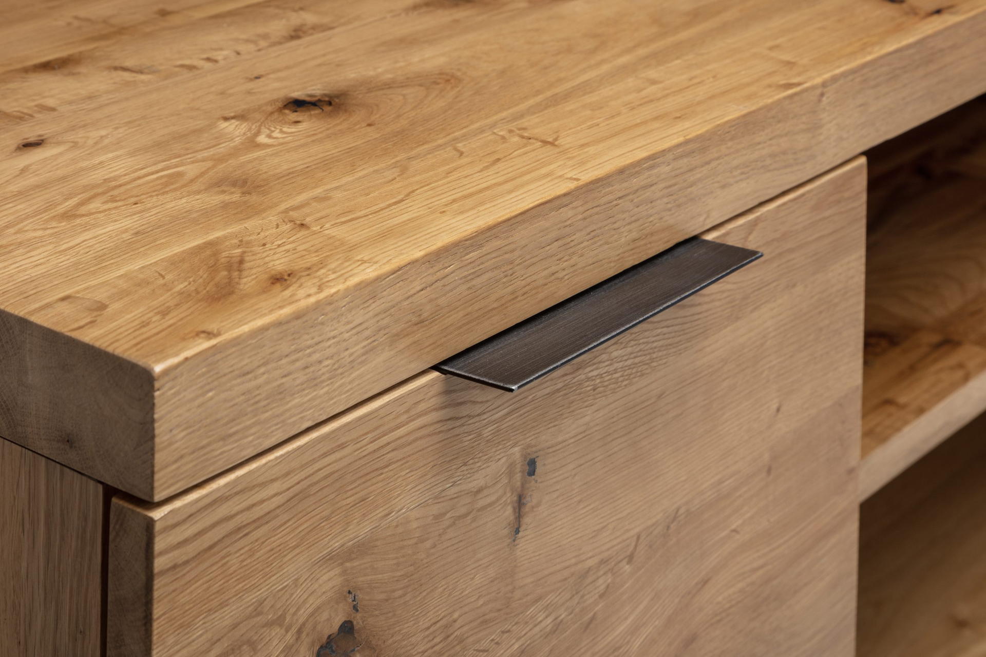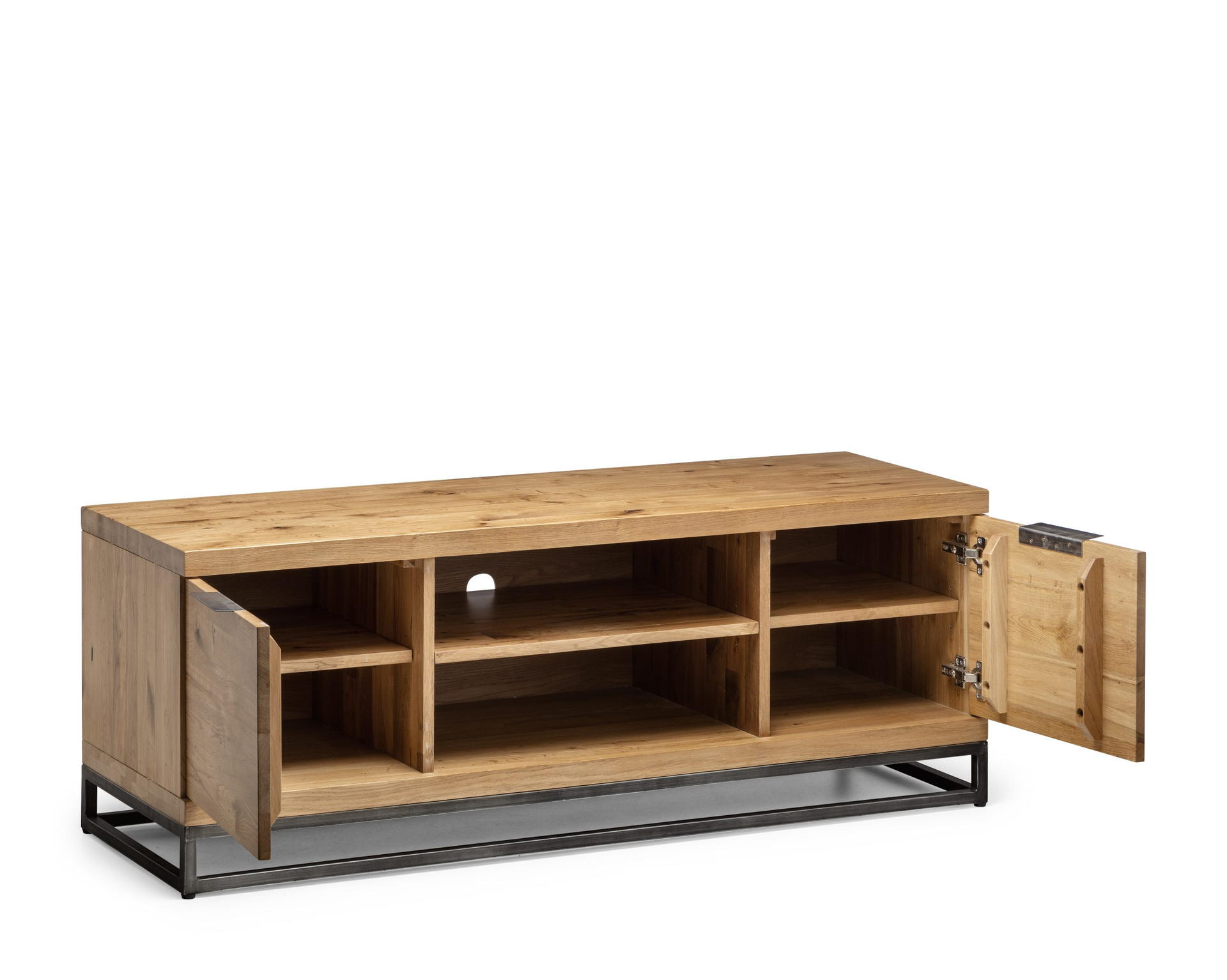 Made from solid oak, this TV Unit offers a rustic finish emphasising the stunning natural wood grain. The Brooklyn TV Unit offers a vintage edge featuring industrial style metal legs. Featuring two cupboards with shelves, and an additional shelf in the middle suitable for a console, this TV Unit is perfect for a wide range of modern decor. Part of the Julian Bowen Brooklyn Dining and Occasional Collection.