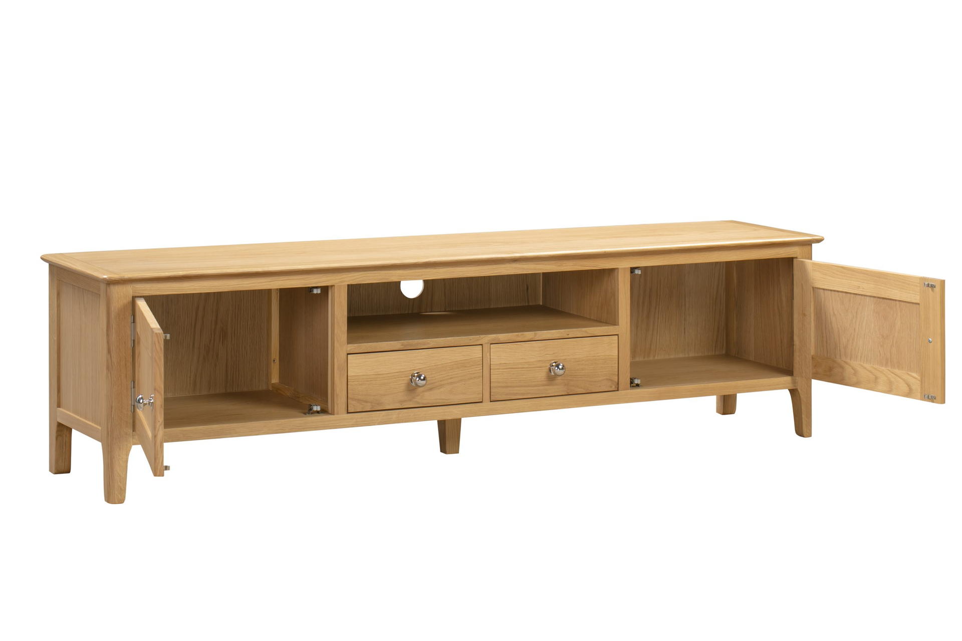 Crafted from solid oak and oak veneers, the Cotswold Widescreen TV Unit features 2 drawers, 2 full height cupboards and a shelf to store all your appliances, DVDs and remotes, complete with a spacious hole for your cables. This simple, yet stylish design is an ideal additional to any traditional room with its soft edges and charming round silver knobs. Part of the Julian Bowen Cotswold Dining & Occasional Collection