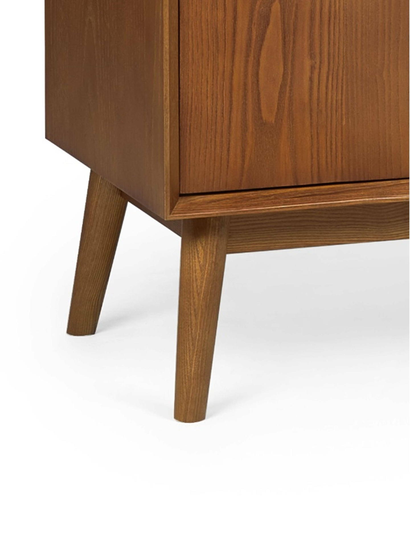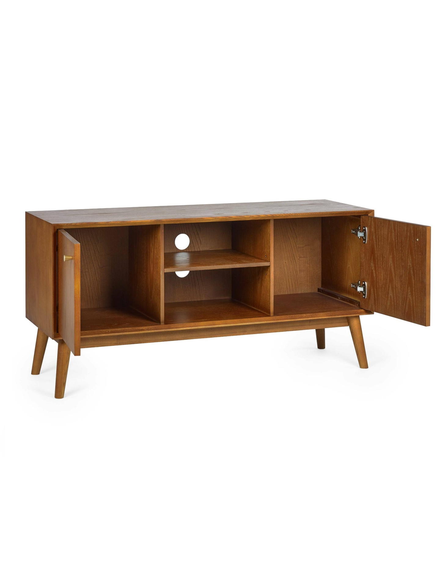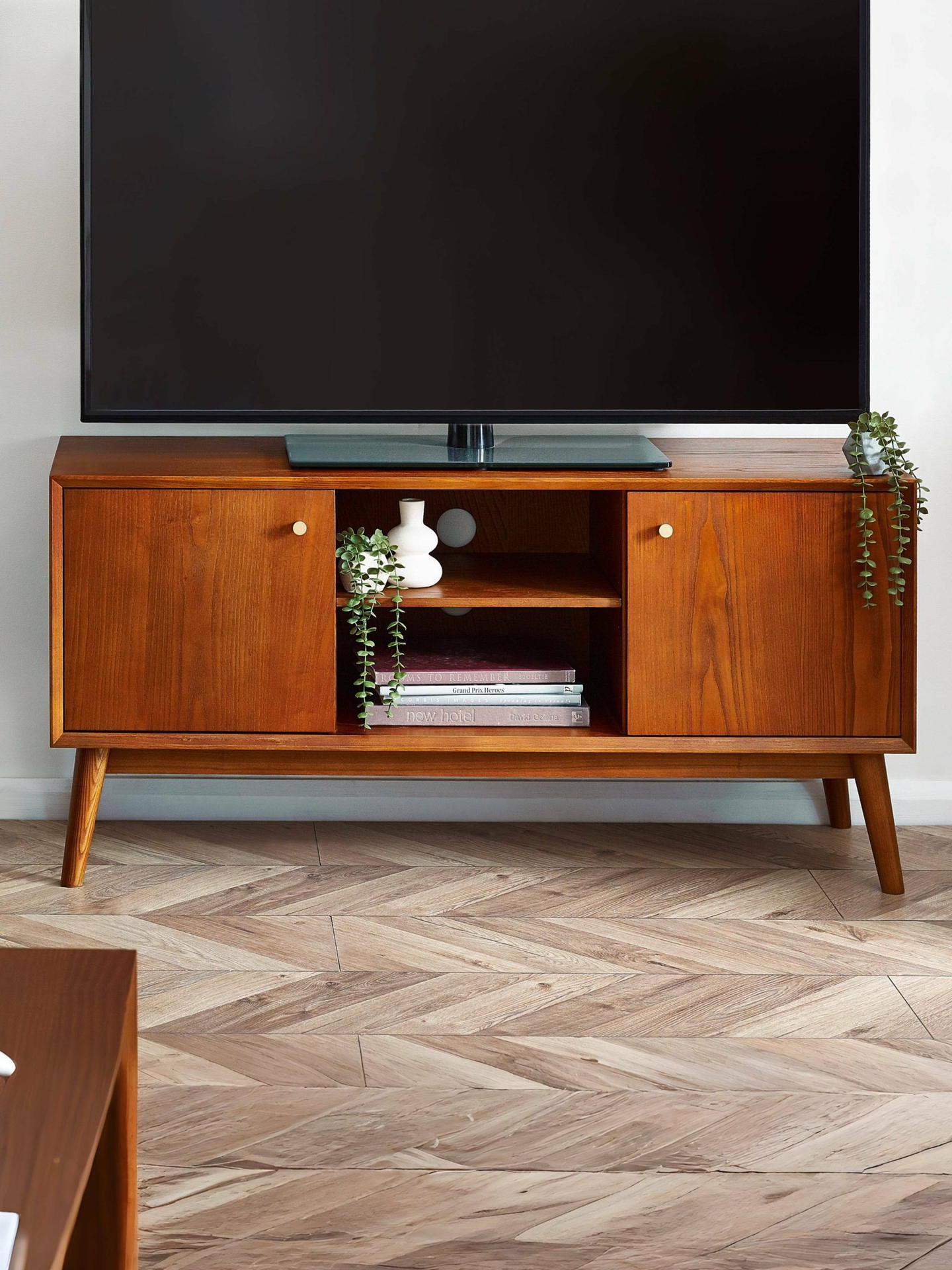 A gorgeous retro-inspired style, the Lowry Media Unit is constructed from an exquisite cherry ash wood veneer with beautifully tapered legs. Featuring 2 soft-touch cupboard doors with interior shelving. Offering the perfect storage space for consoles. Complemented by golden framed knobs, providing the perfect timeless staple to any occasional space.