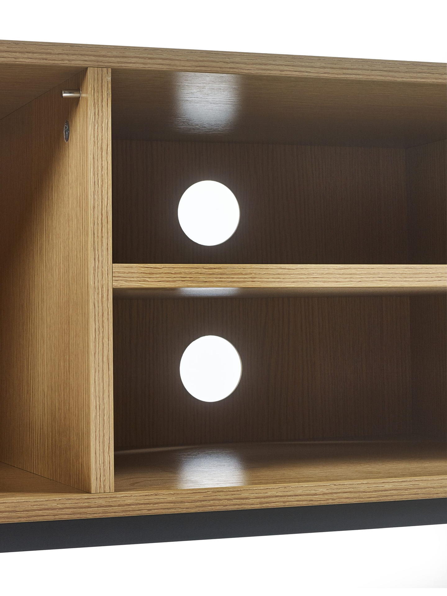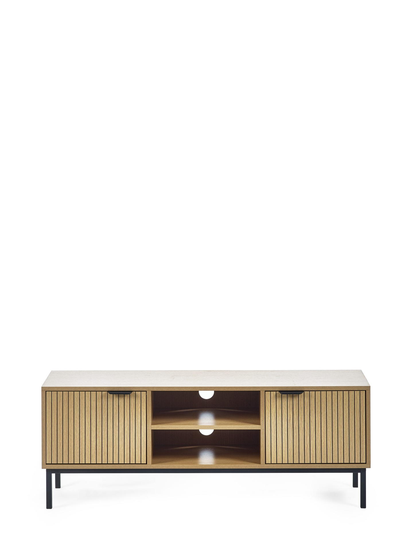 Revamp your living room with the Sia Media Unit, where style meets functionality. This chic media unit is designed to be the focal point of your space, featuring eye-catching slatted effect wood doors that seamlessly blend aesthetics with practicality. With spacious cabinets for all your media devices and an open middle shelf ideal for displaying your favorite decor or tech, this unit offers both style and convenience. Its sleek design, paired with a warm wood finish and sturdy black metal legs, brings a modern vibe that complements any interior, making your entertainment area both stylish and clutter-free. Simple assembly ensures you can set it up in no time.