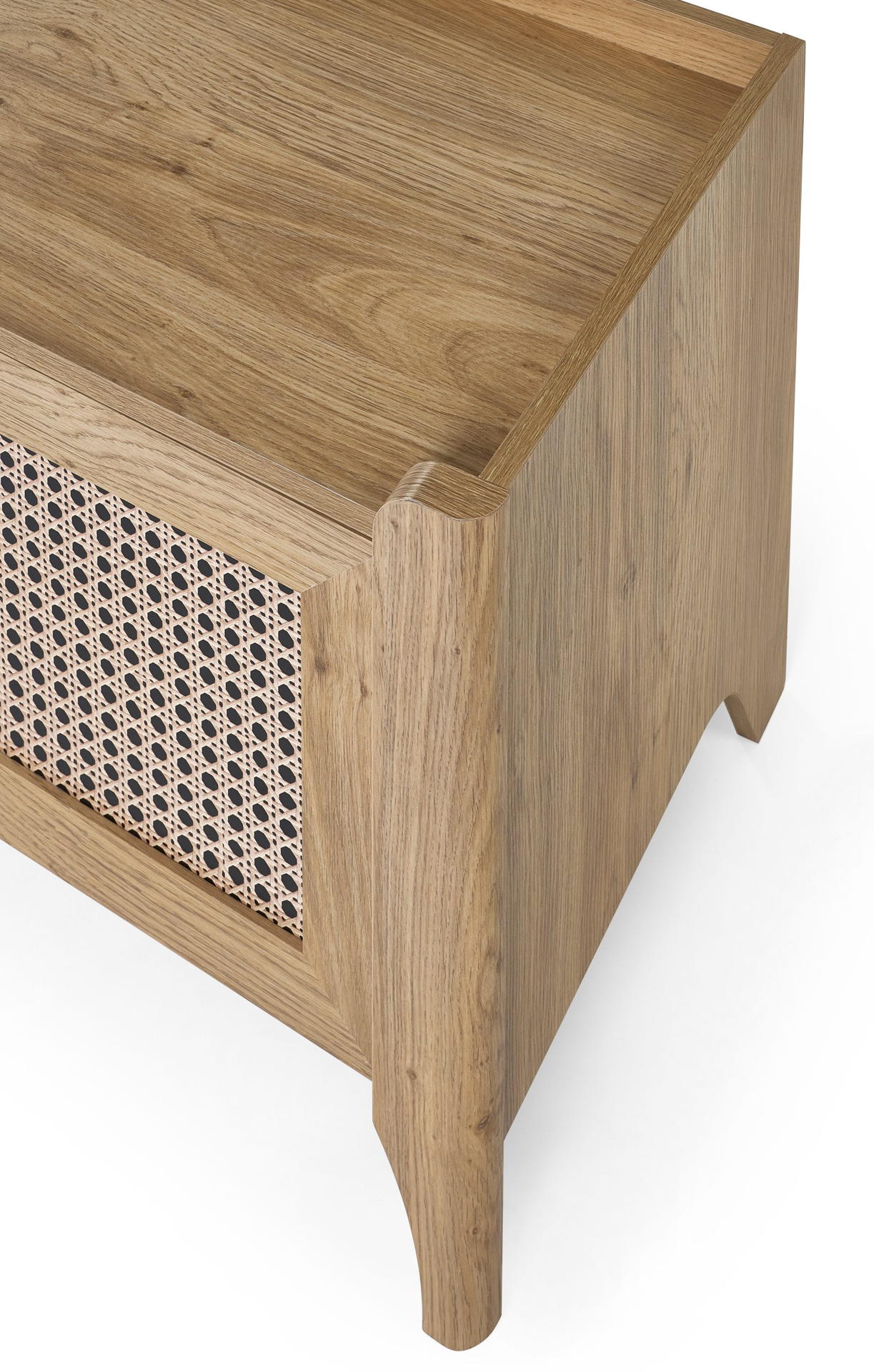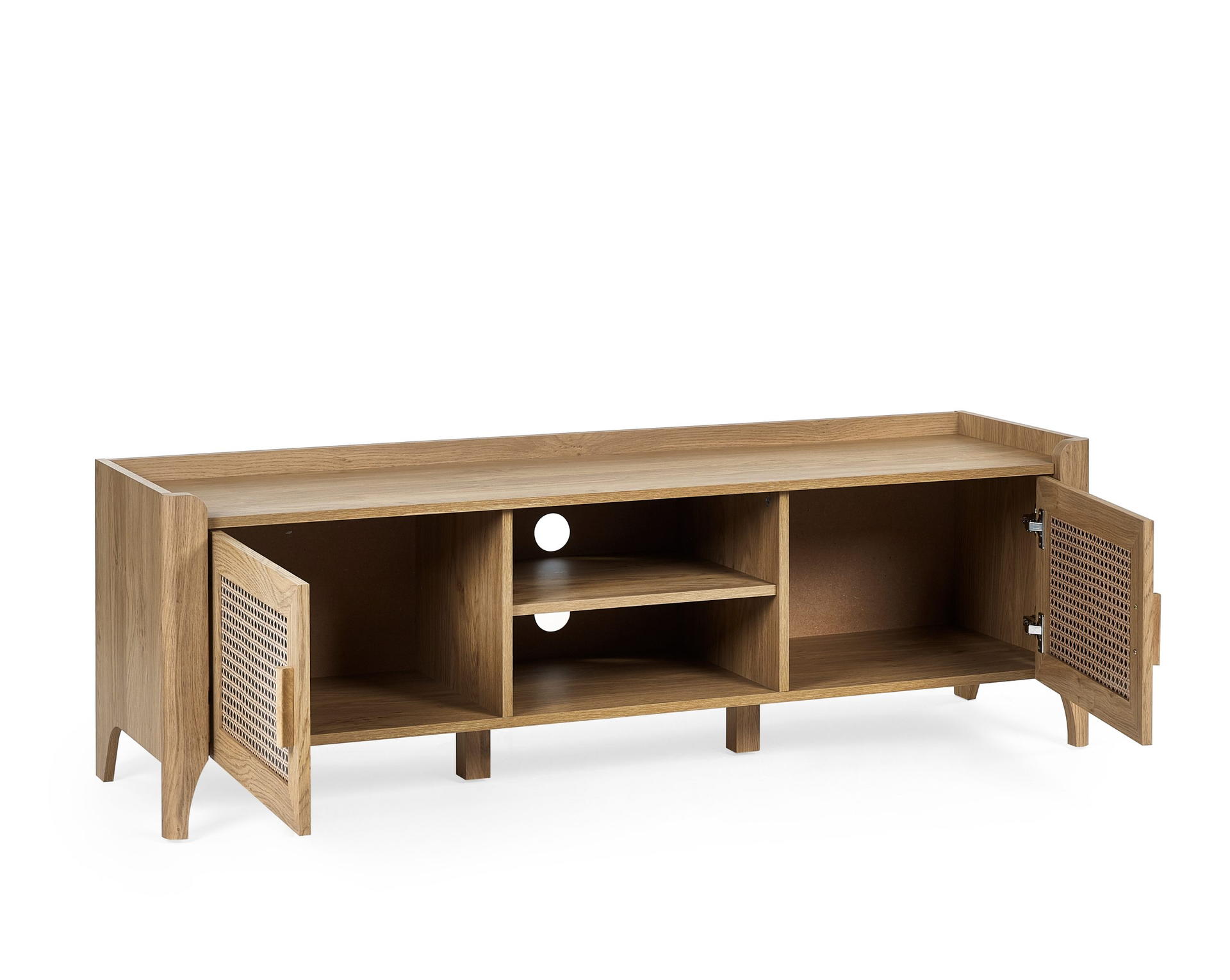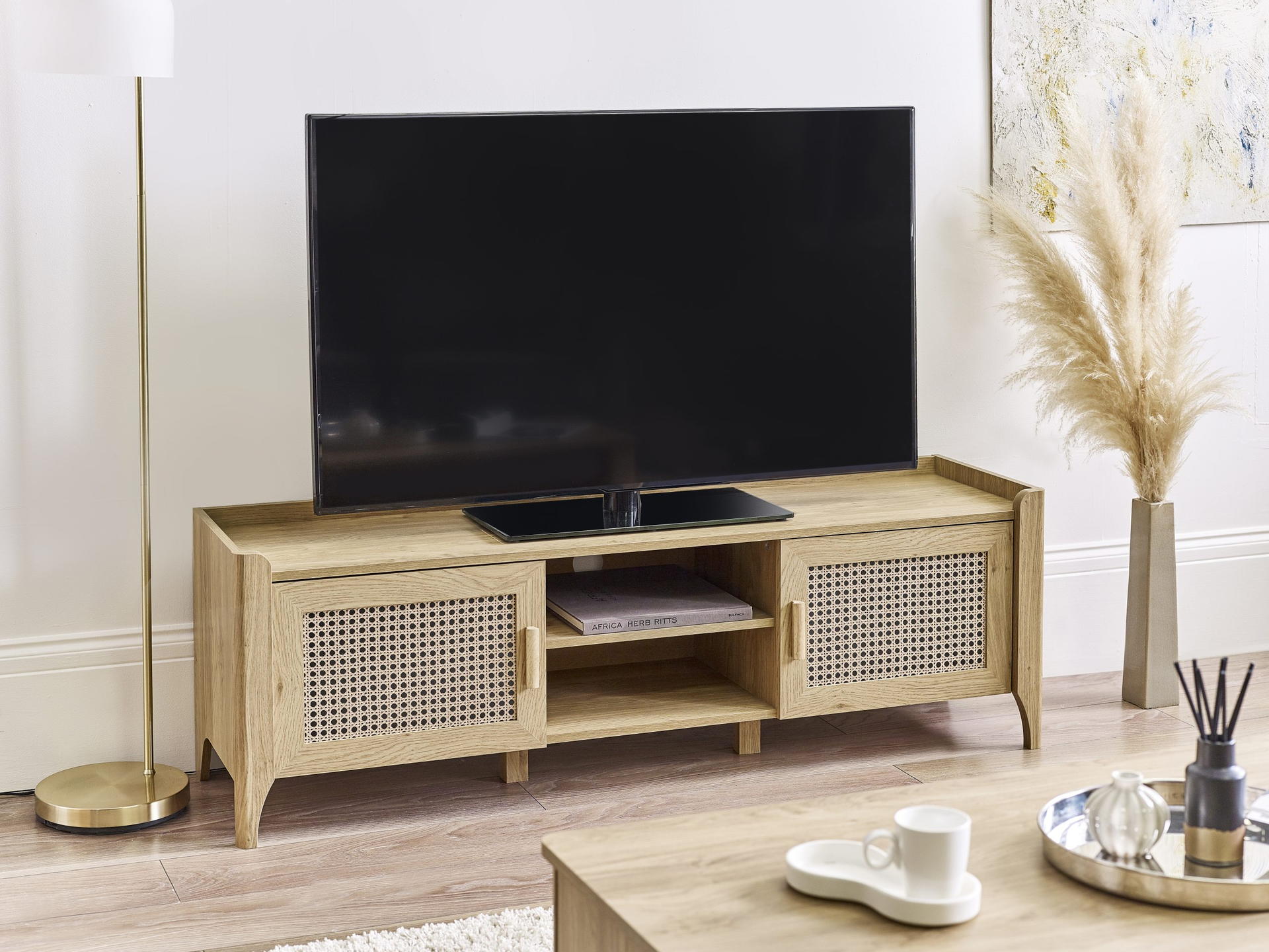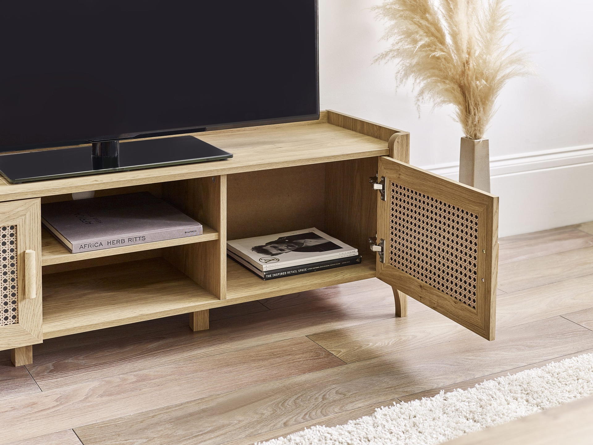 Showcasing a beautifully sleek design with a bohemian feel, the Sydney Media Unit offers exquisitely curved edging accompanied by a raised lip around the edge providing a practical addition, stunningly combined with a rattan-effect sticker front. Finished with a natural oak effect which is composed of two large storage cupboards and built-in shelving providing you plenty of space for controllers and TV monitors. All around creating the perfect airy, warm feel within your home.