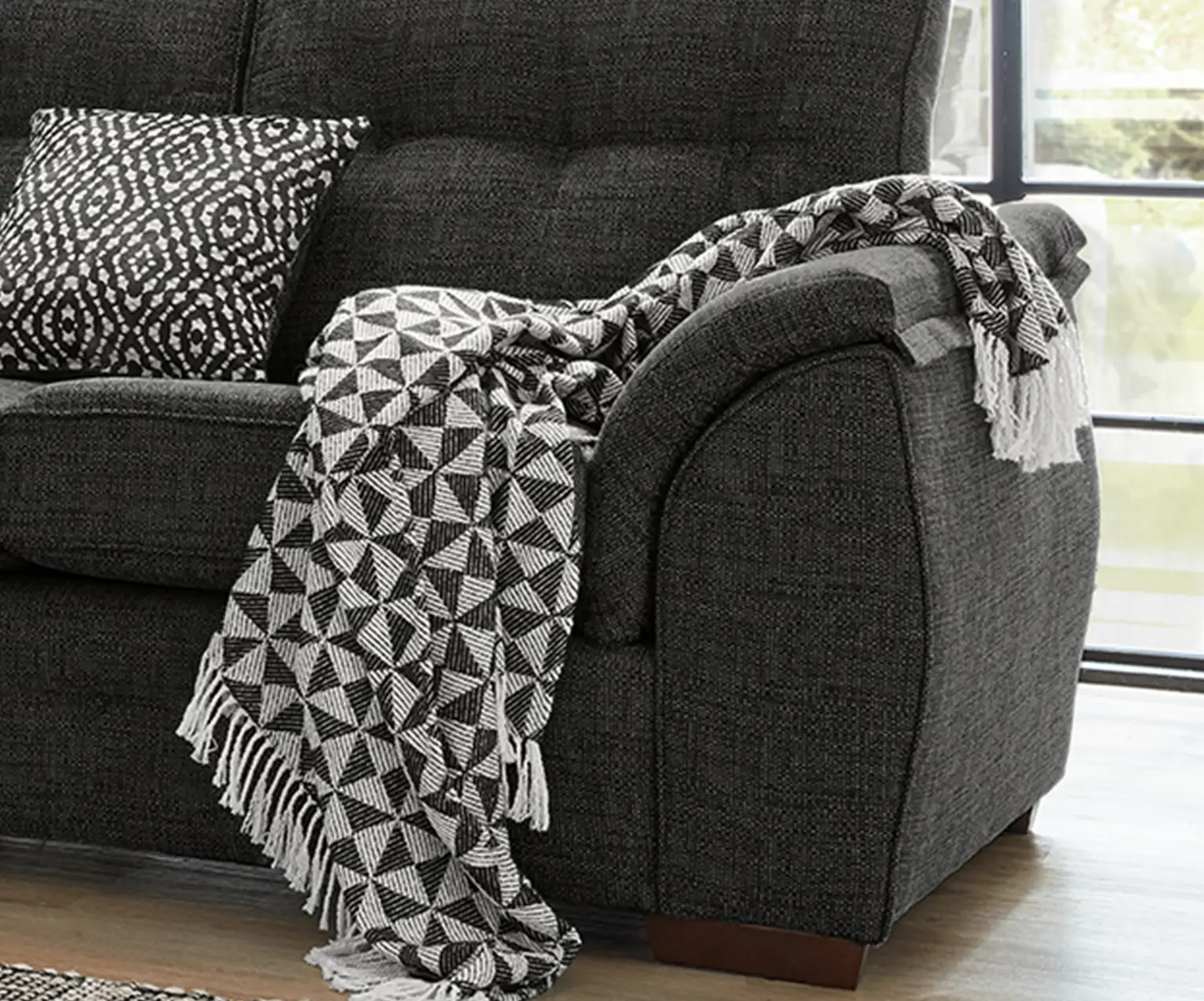A genuine proportioned design to suit any home, the Ashley boasts stylish cushioned arm rests and buttoned back cushions. The Ashley sofa delivers a seamless fusion of modern style and function. Shown here in a 2-Seater – Wedge Corner – 2-Seater configuration and upholstered in a combination of Daytona Coal fabric, it exudes contemporary sophistication and luxurious comfort.