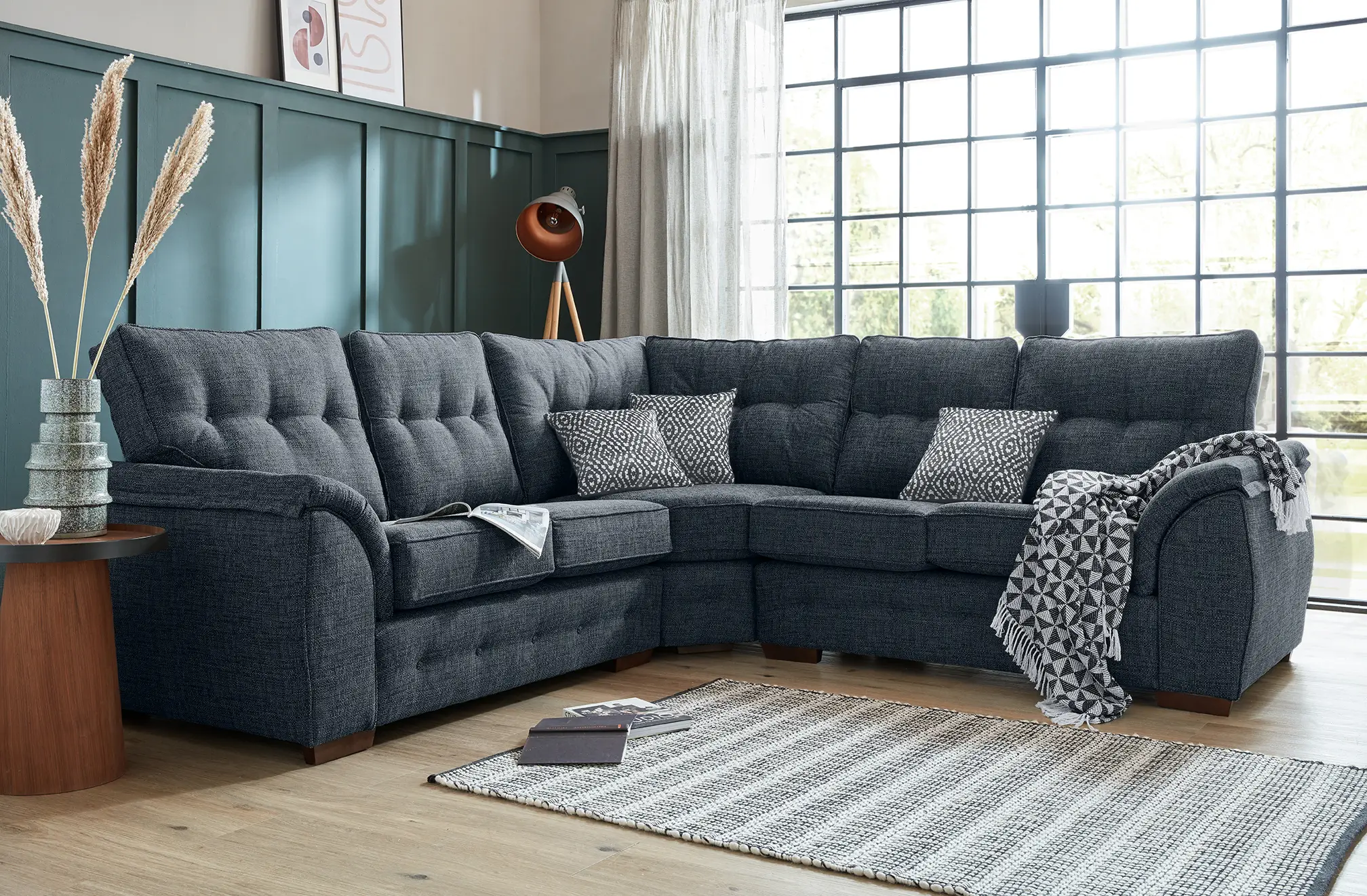 A genuine proportioned design to suit any home, the Ashley boasts stylish cushioned arm rests and buttoned back cushions. The Ashley sofa delivers a seamless fusion of modern style and function. Shown here in a 2-Seater – Wedge Corner – 2-Seater configuration and upholstered in a combination of Palladium Graphite fabric, it exudes contemporary sophistication and luxurious comfort.