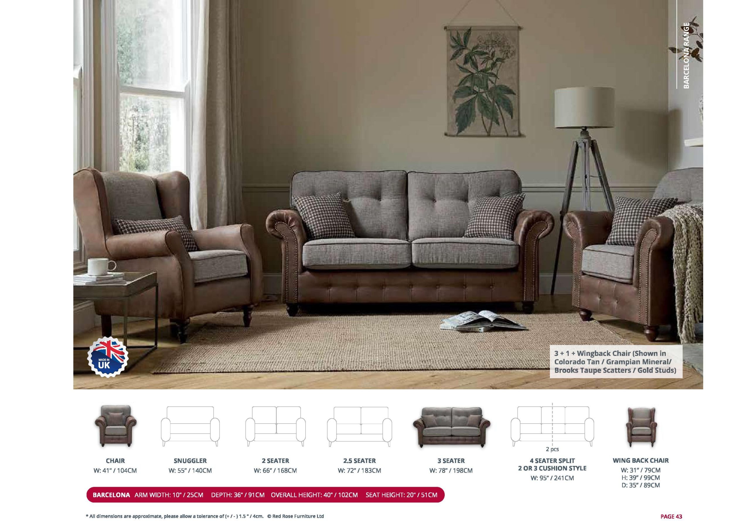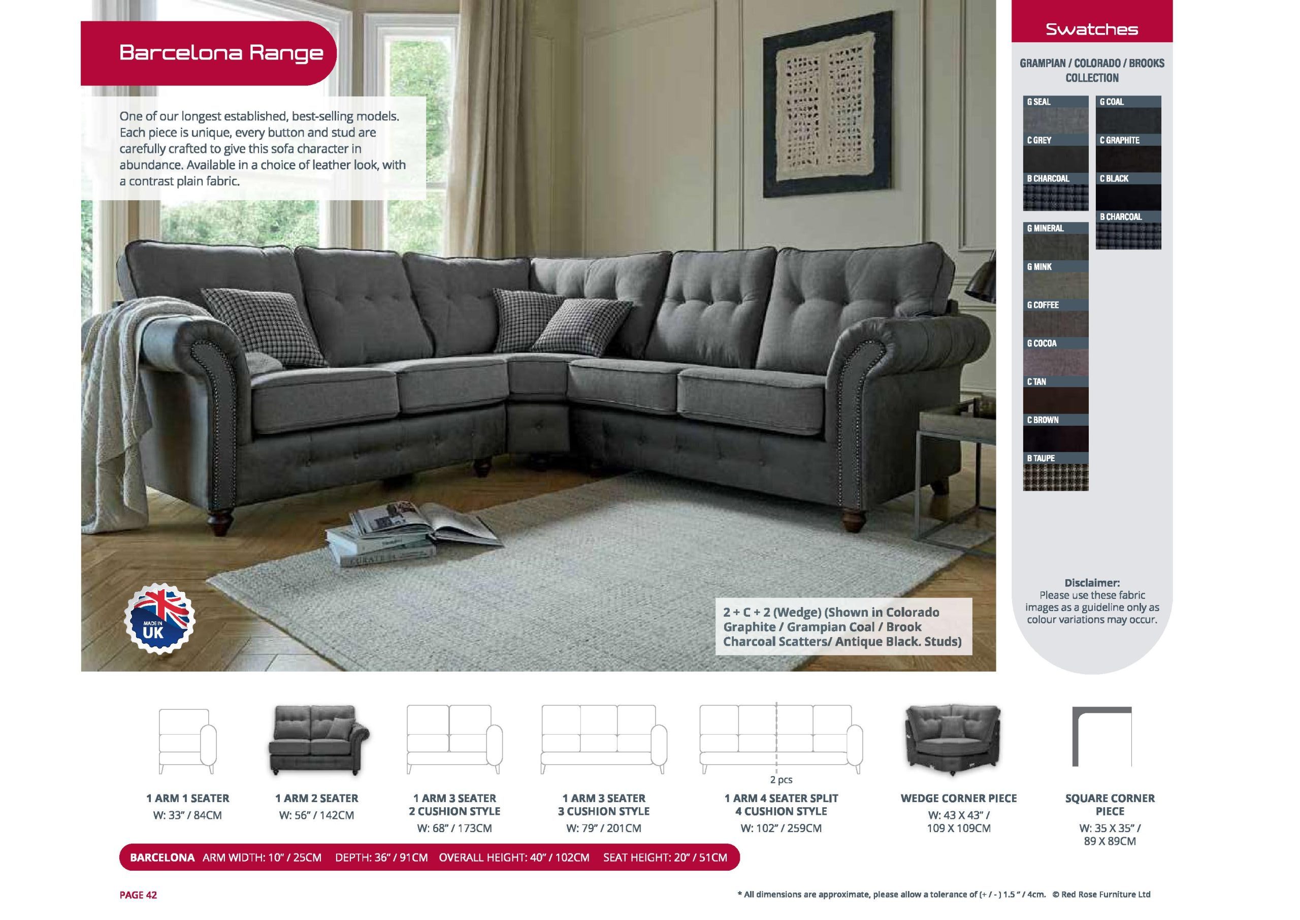 Whether you’re looking to add a touch of elegance or create a warm, inviting atmosphere, the Barcelona sofa delivers a seamless fusion of traditional style and function. Shown here in a 2-Seater – Wedge – 2-Seater configuration and upholstered in a combination of Grampian Seal Fabric and Colorado Grey Faux Leather fabrics, it exudes contemporary sophistication and luxurious comfort.