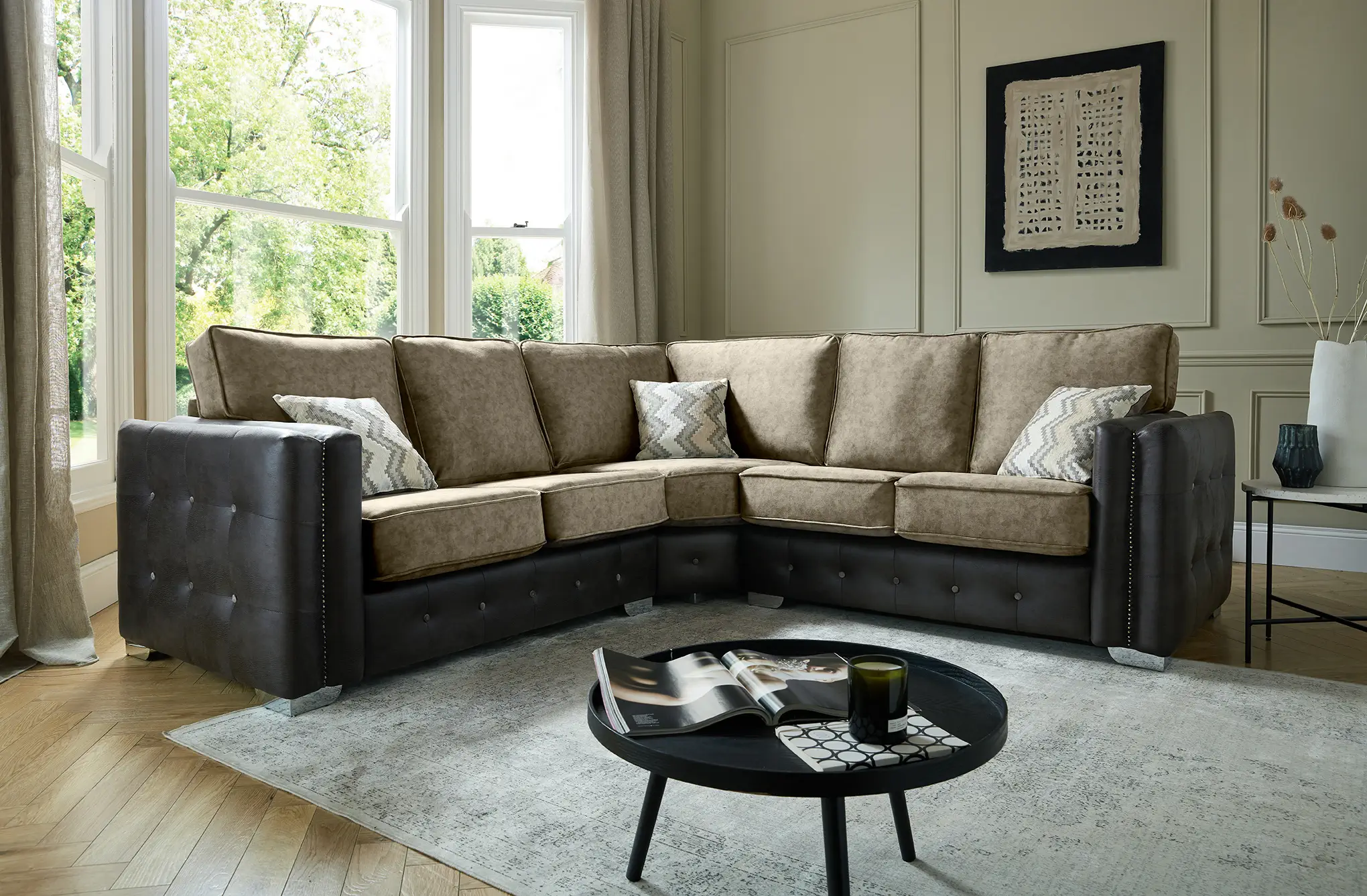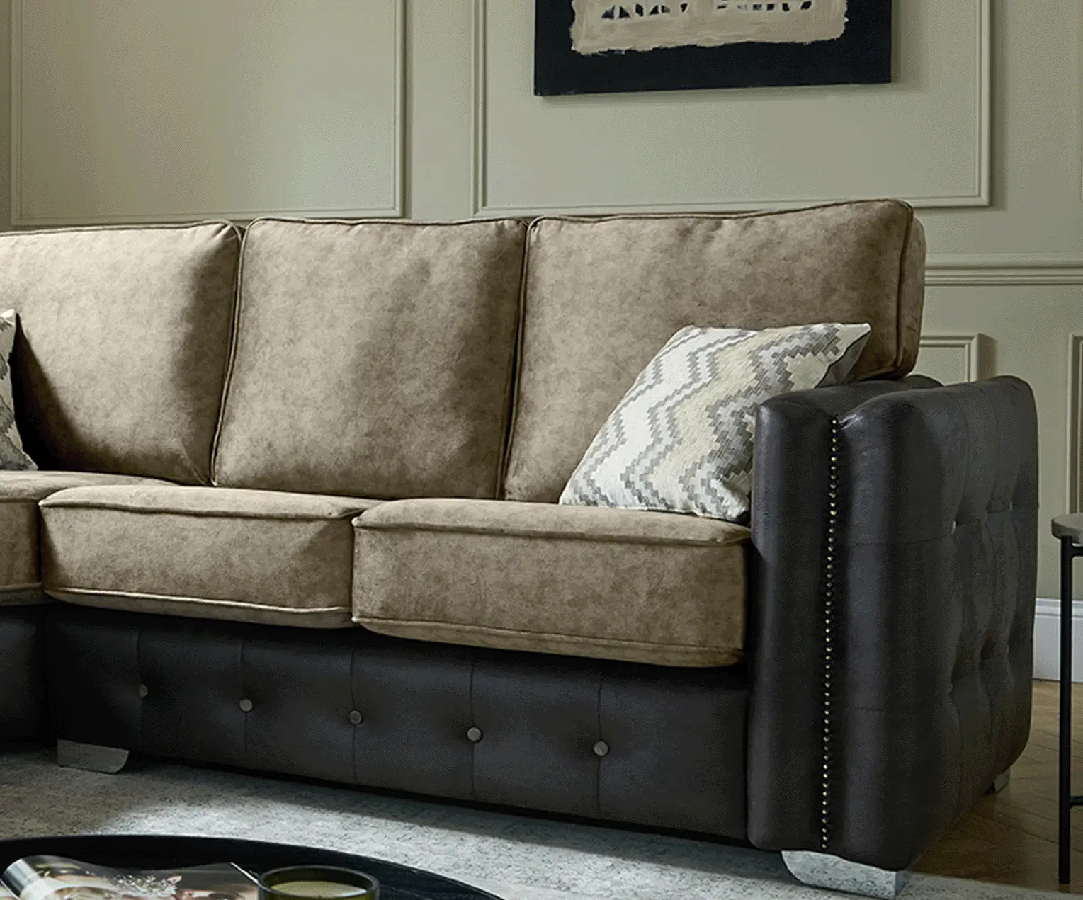 The Horizon collection is a hand crafted sofa in a combination of leather look and soft plain fabric. Designed to capture sophistication, glamour and luxury, The button and studded arms give it that extra edge. The Horizon sofa delivers a seamless fusion of modern style and function. Shown here in a 2-Seater – Wedge Corner – 2-Seater configuration and upholstered in a combination of Daytona Palladium Beige fabric, it exudes contemporary sophistication and luxurious comfort.