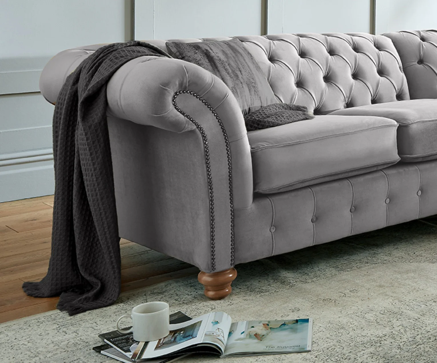 The Winchester fabric sofa collection is one of our most popular models from our shop floor. Featuring sumptuous velvet upholstery on high-quality buttoned backs and studding, there’s little to no competition when it comes to finding a suite that exudes so much elegance! Expertly upholstered in soft yet durable plush fabric, this design offers generous seating, perfect for everything from laid-back lounging to lively gatherings.