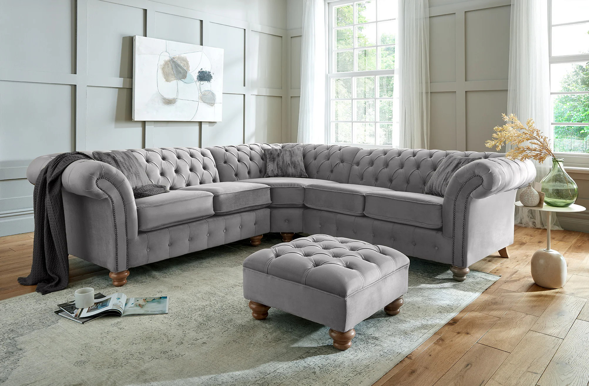 With its traditional scrolled arms and brass studs combined with solid wooden feet strikes the perfect balance between form and function. The space-saving corner layout makes it an ideal choice for both traditional living rooms and open-plan interiors.